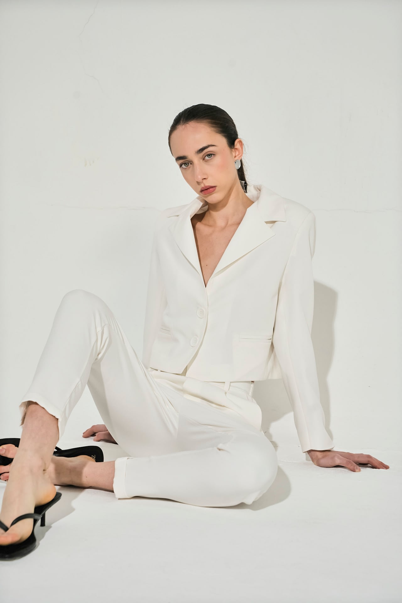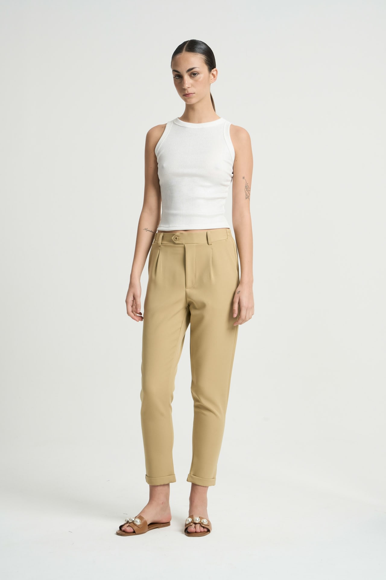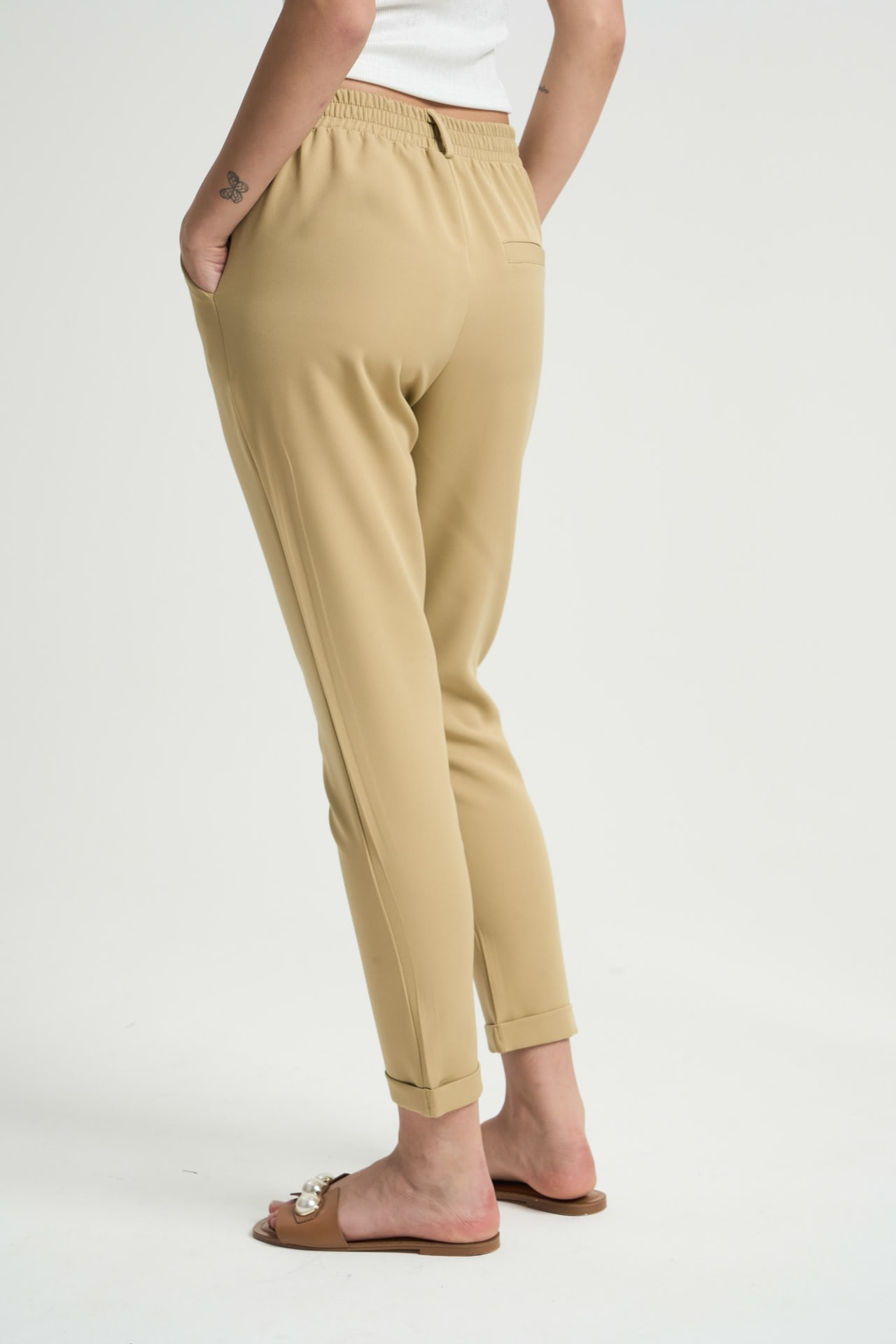 Pantalon de crepe sastrero tiro alto, con botón, elástico y bolsillos laterales.