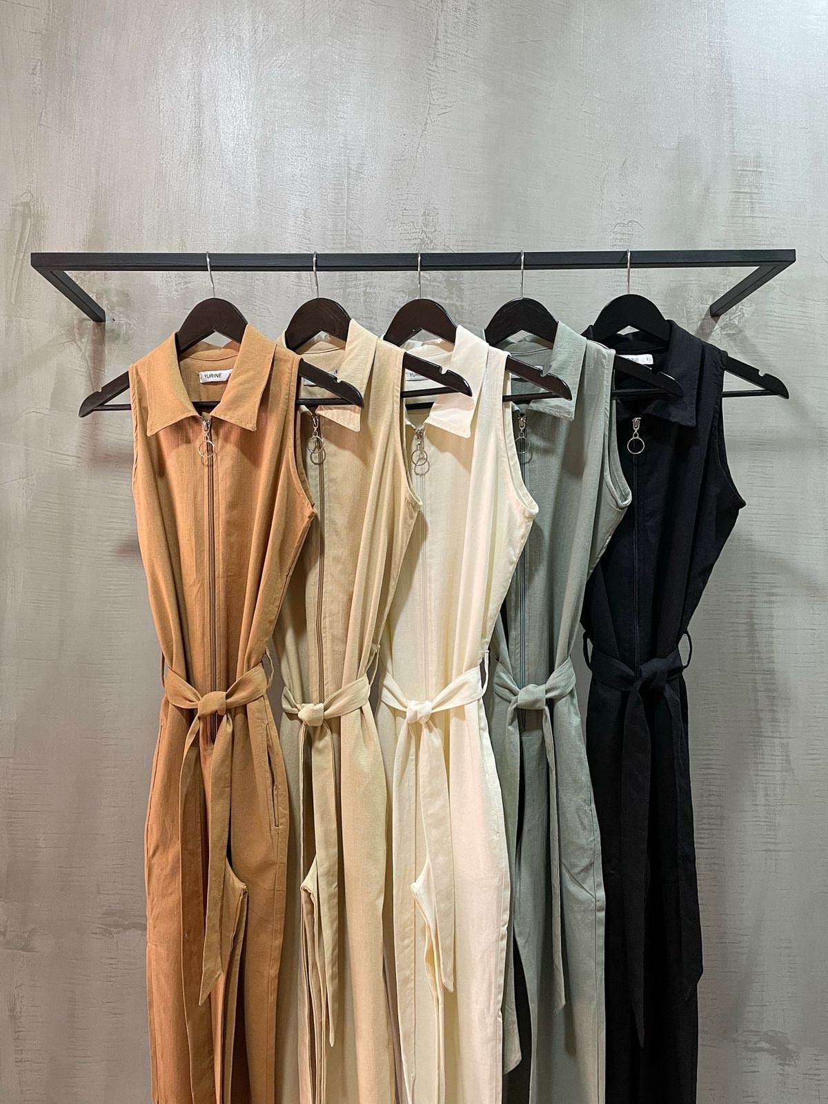 Mono largo de lino sastrero con cierre. Tiene bolsillos laterales y cinto para atar.