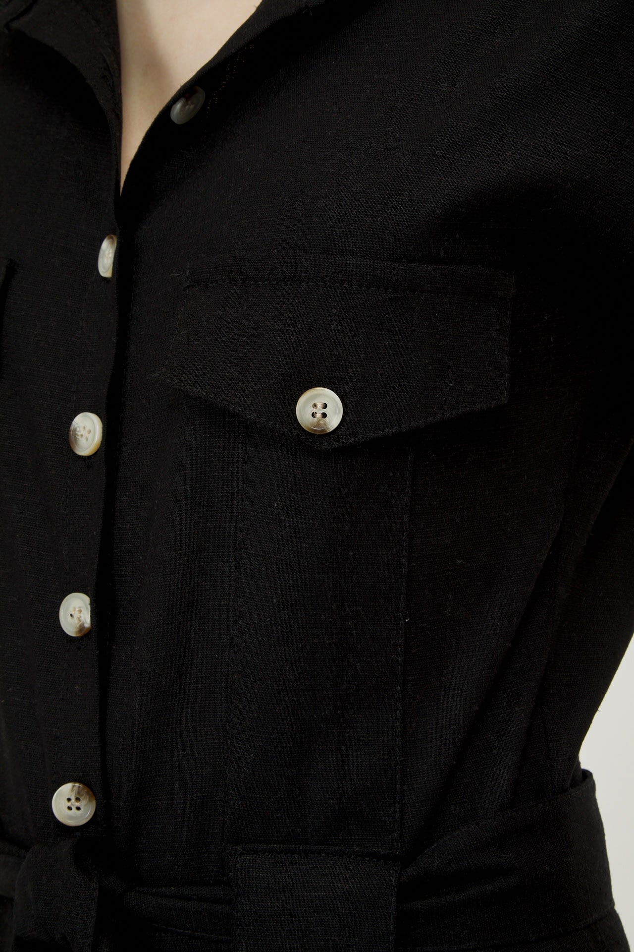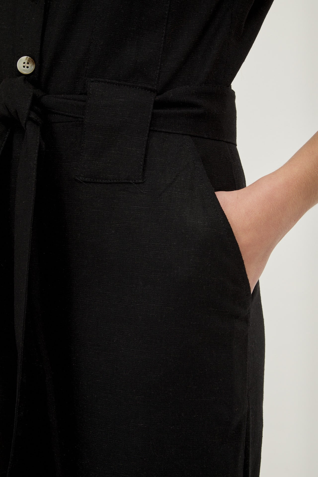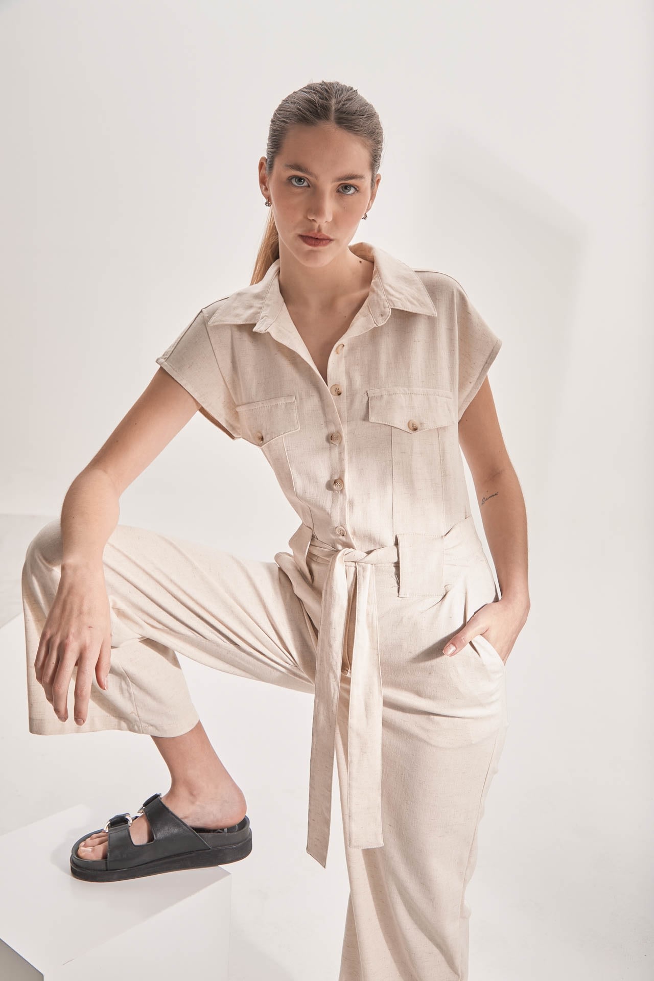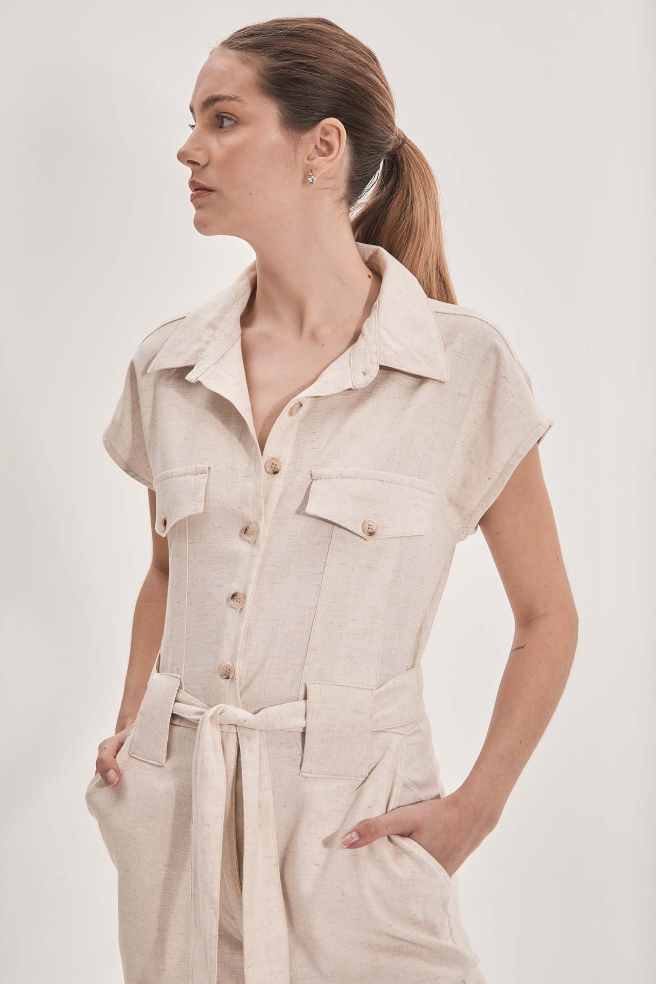 Mono largo de lino sastrero con botones, cierre y lazo.