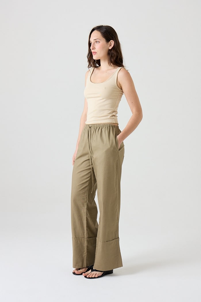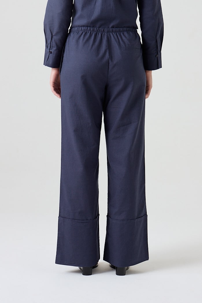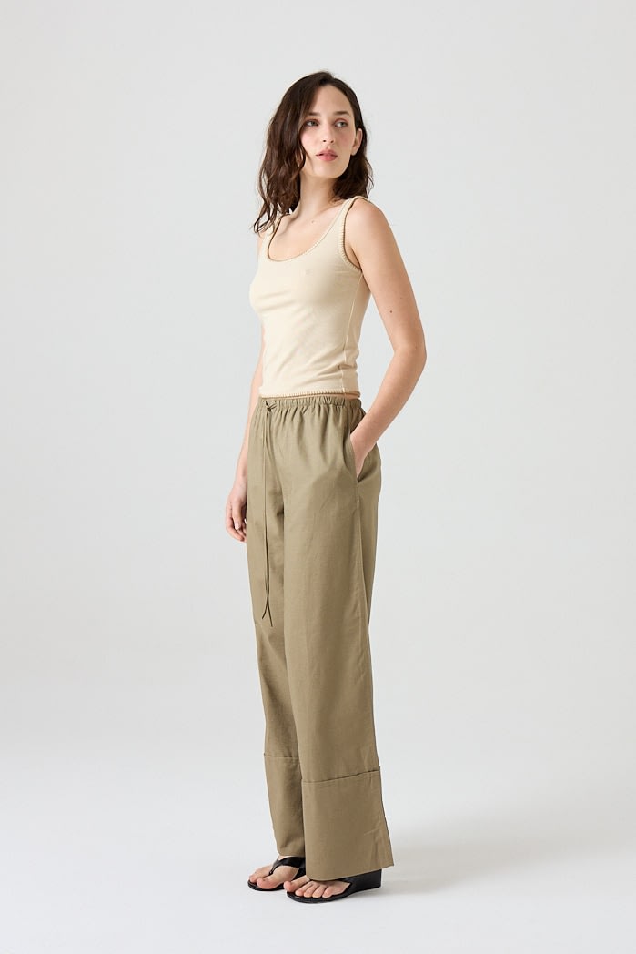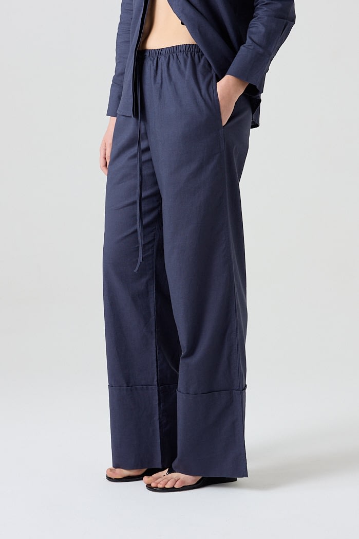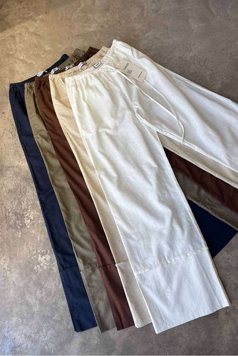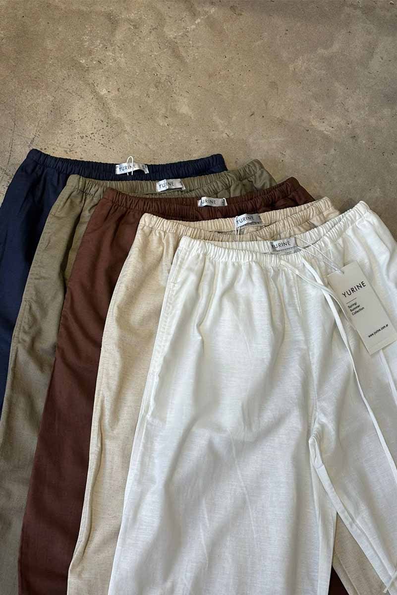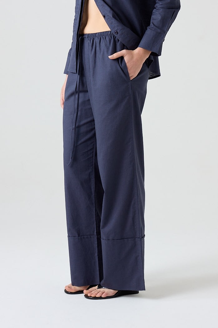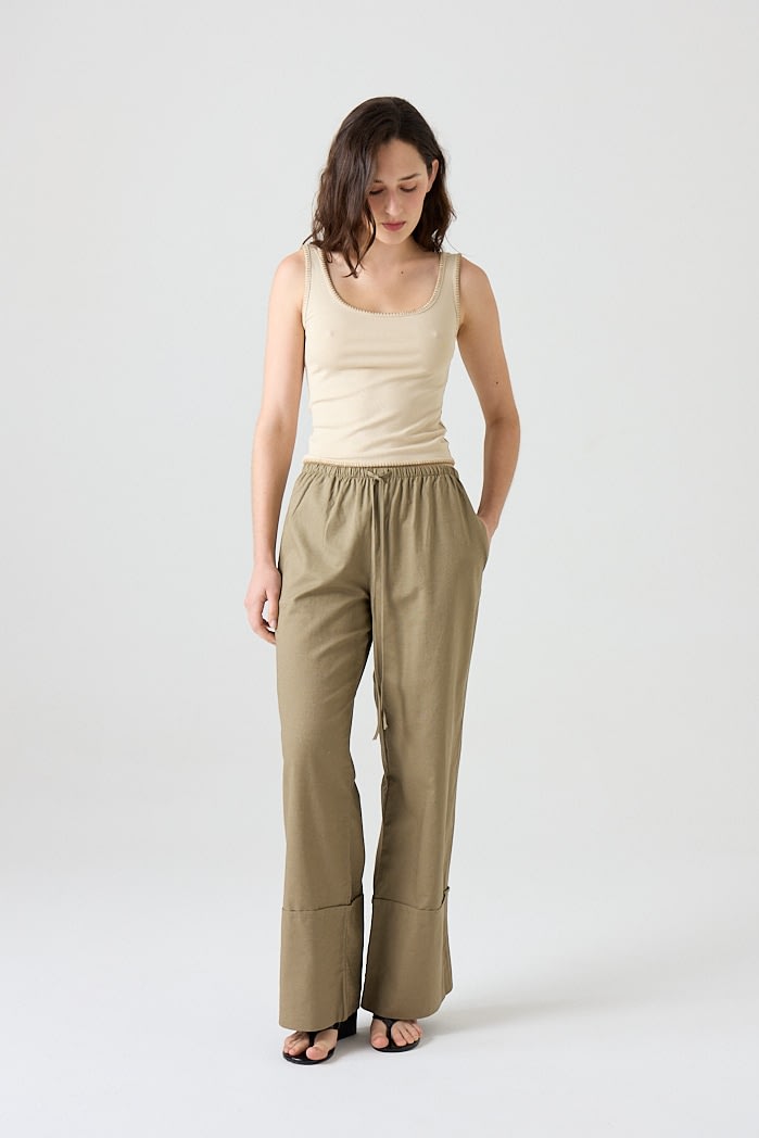 Pantalón amplio confeccionado en lino liviano, con cintura elastizada y cordón ajustable. Posee bolsillos laterales y botamanga ancha con detalle de bastilla. Composición: 55% Algodón 45%Lino