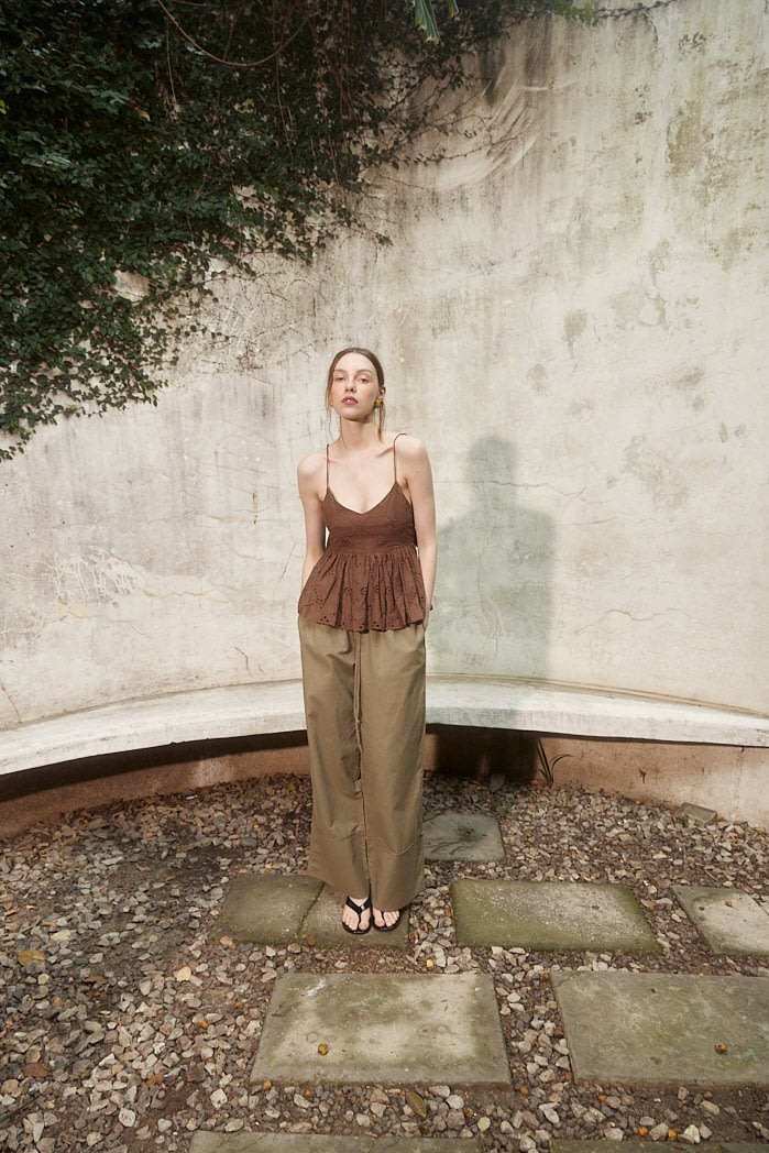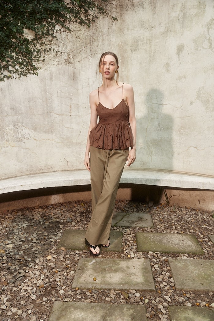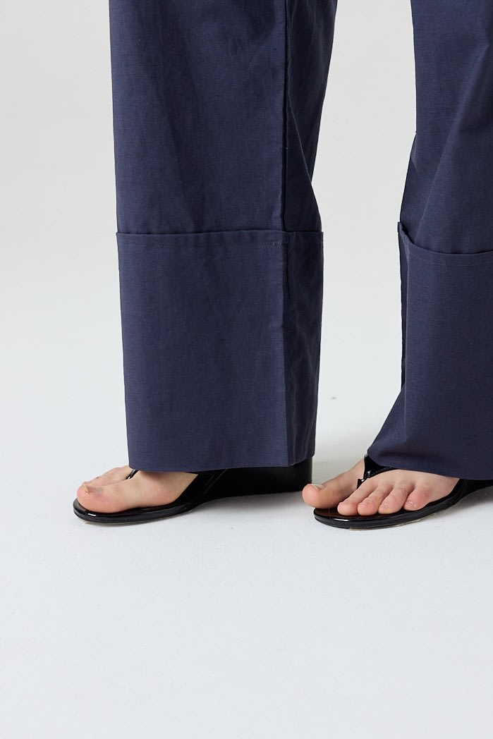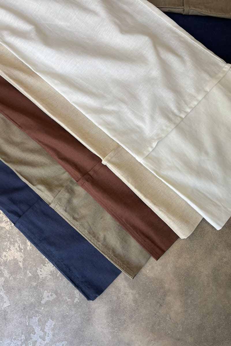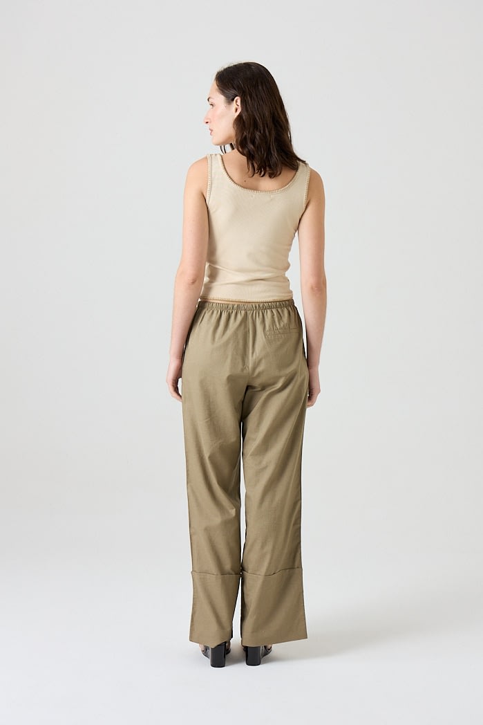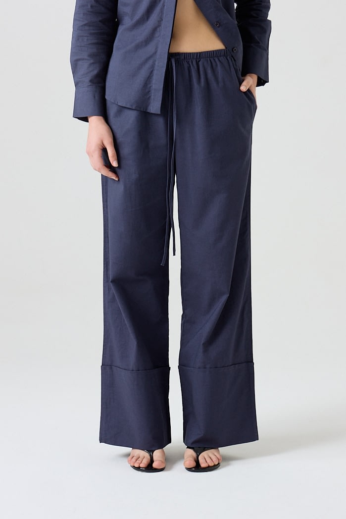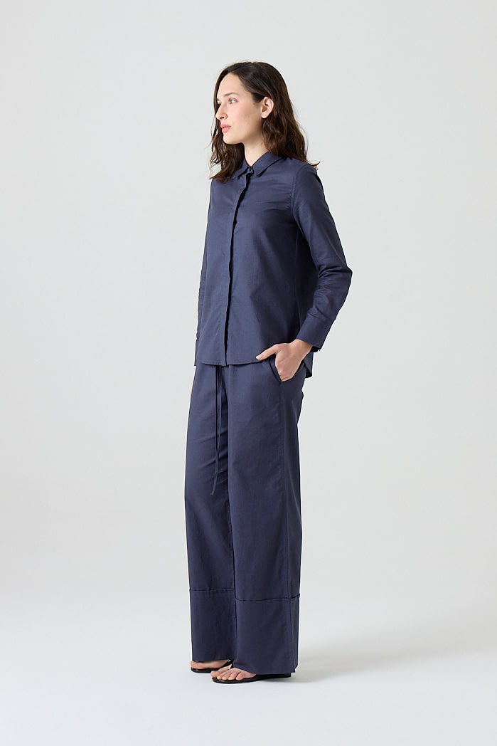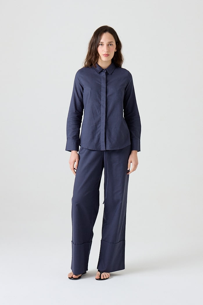 Pantalón amplio confeccionado en lino liviano, con cintura elastizada y cordón ajustable. Posee bolsillos laterales y botamanga ancha con detalle de bastilla. Composición: 55% Algodón 45%Lino