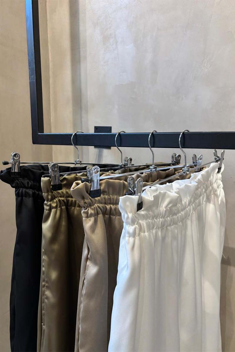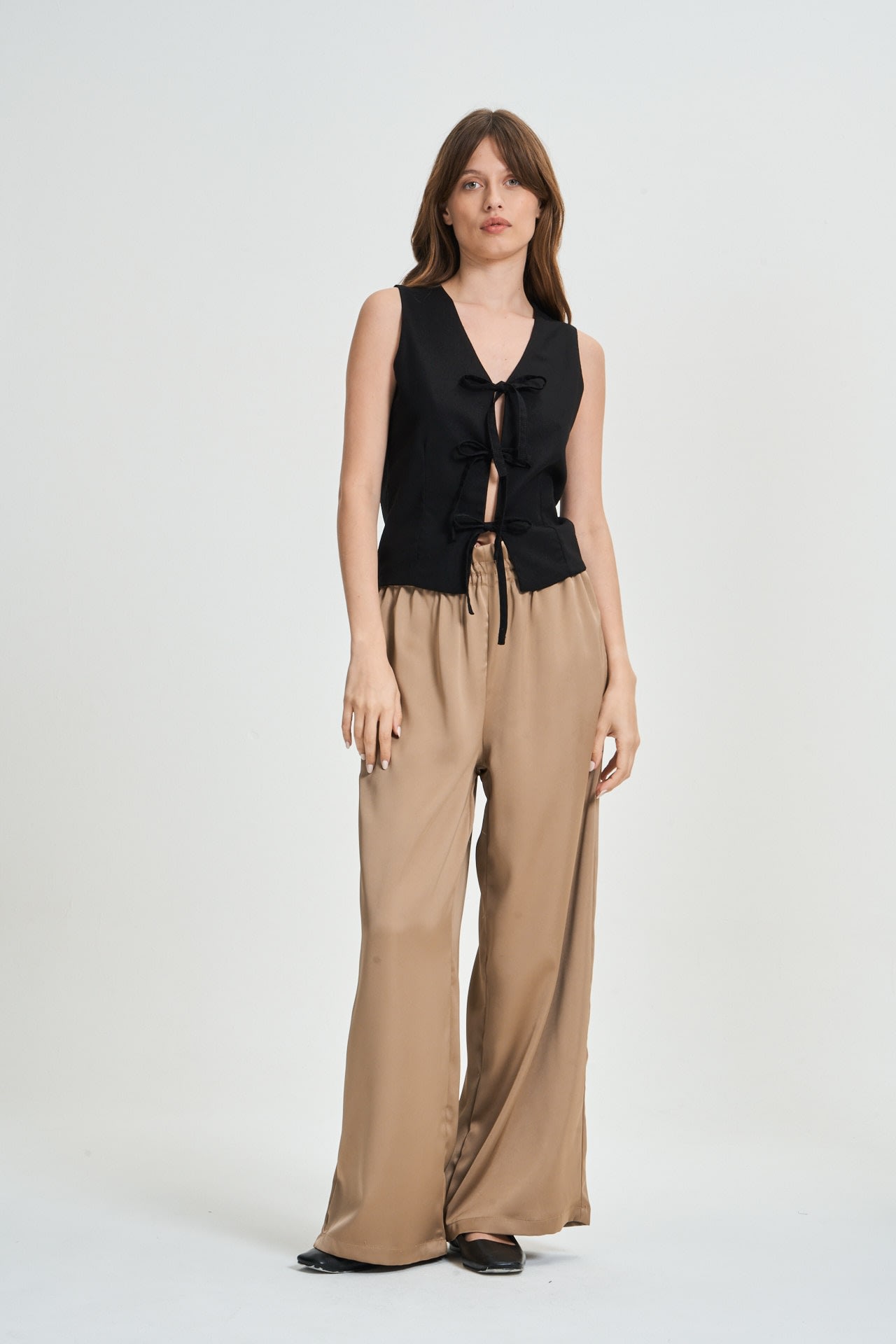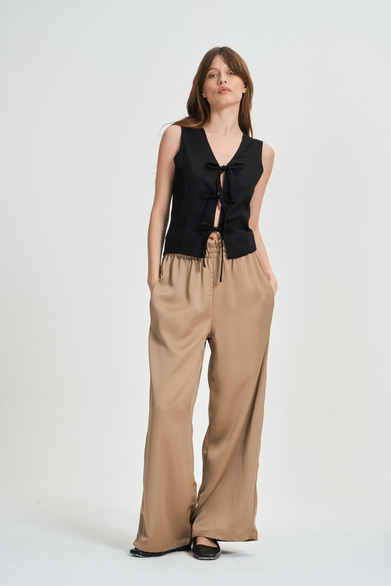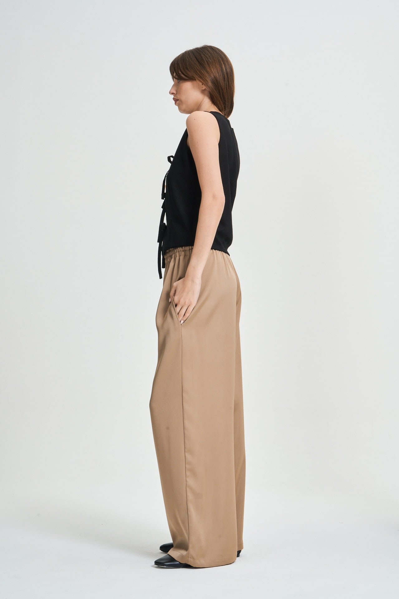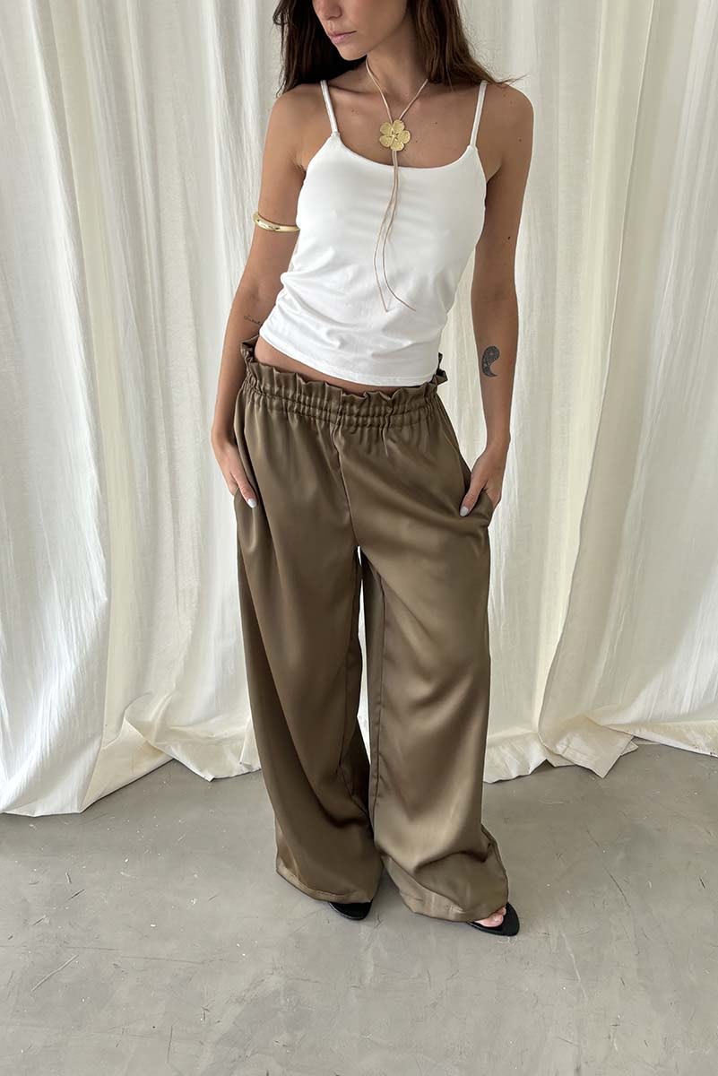 Pantalón palazzo de satén, con acabado suave y ligeramente brillante. Su diseño de pierna ancha ofrece caída fluida y movimiento natural. Cuenta con cintura elástica ancha fruncida para un calce adaptable y confortable, así como bolsillos laterales discretos.