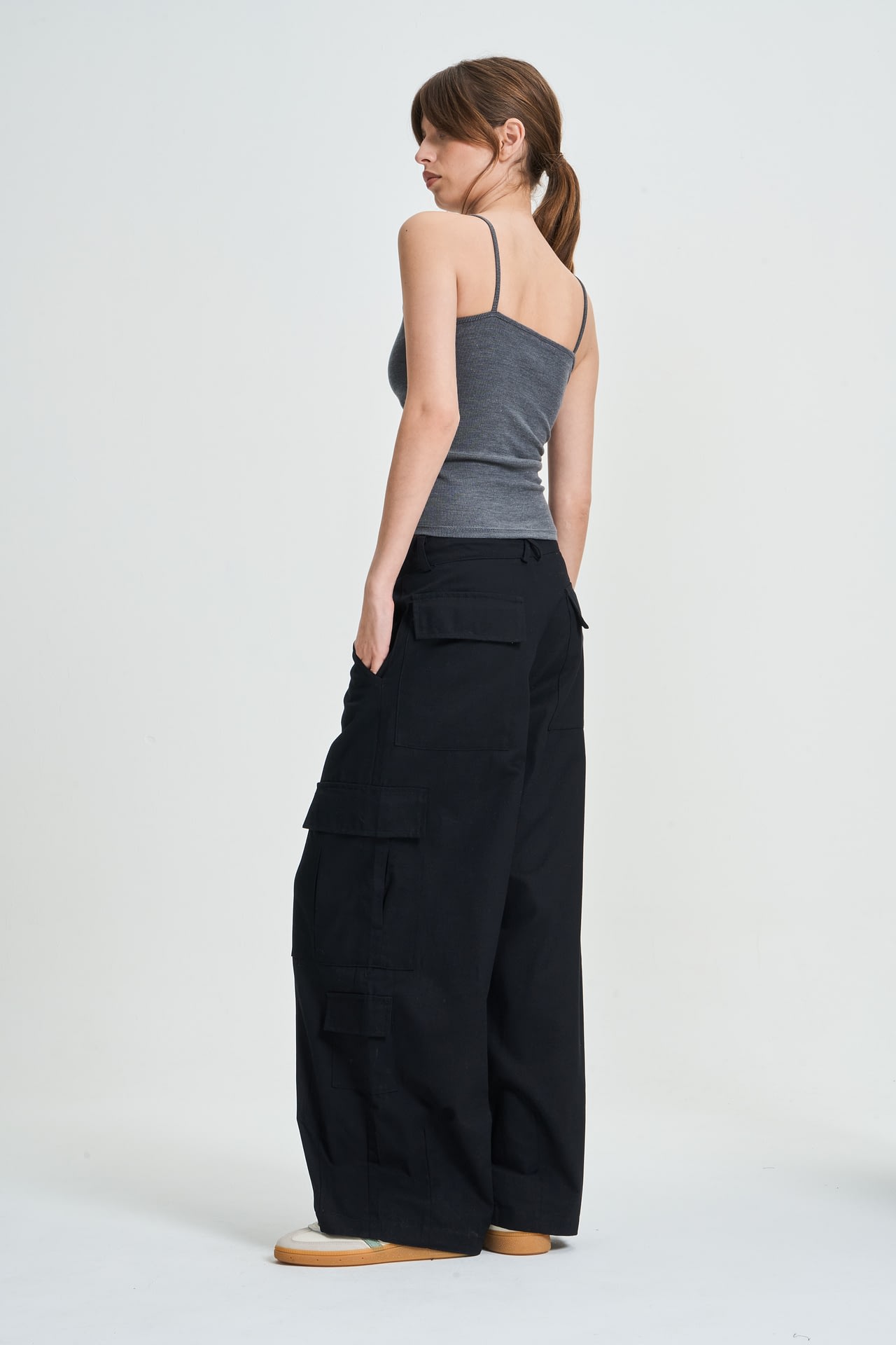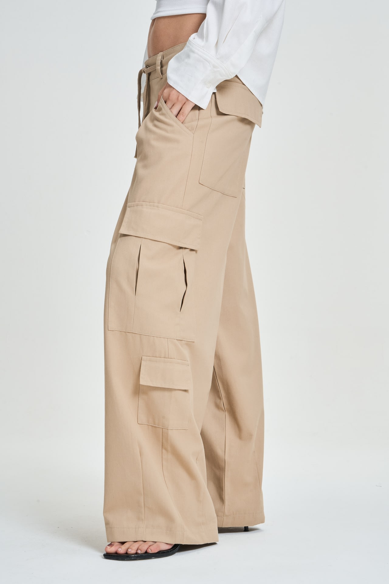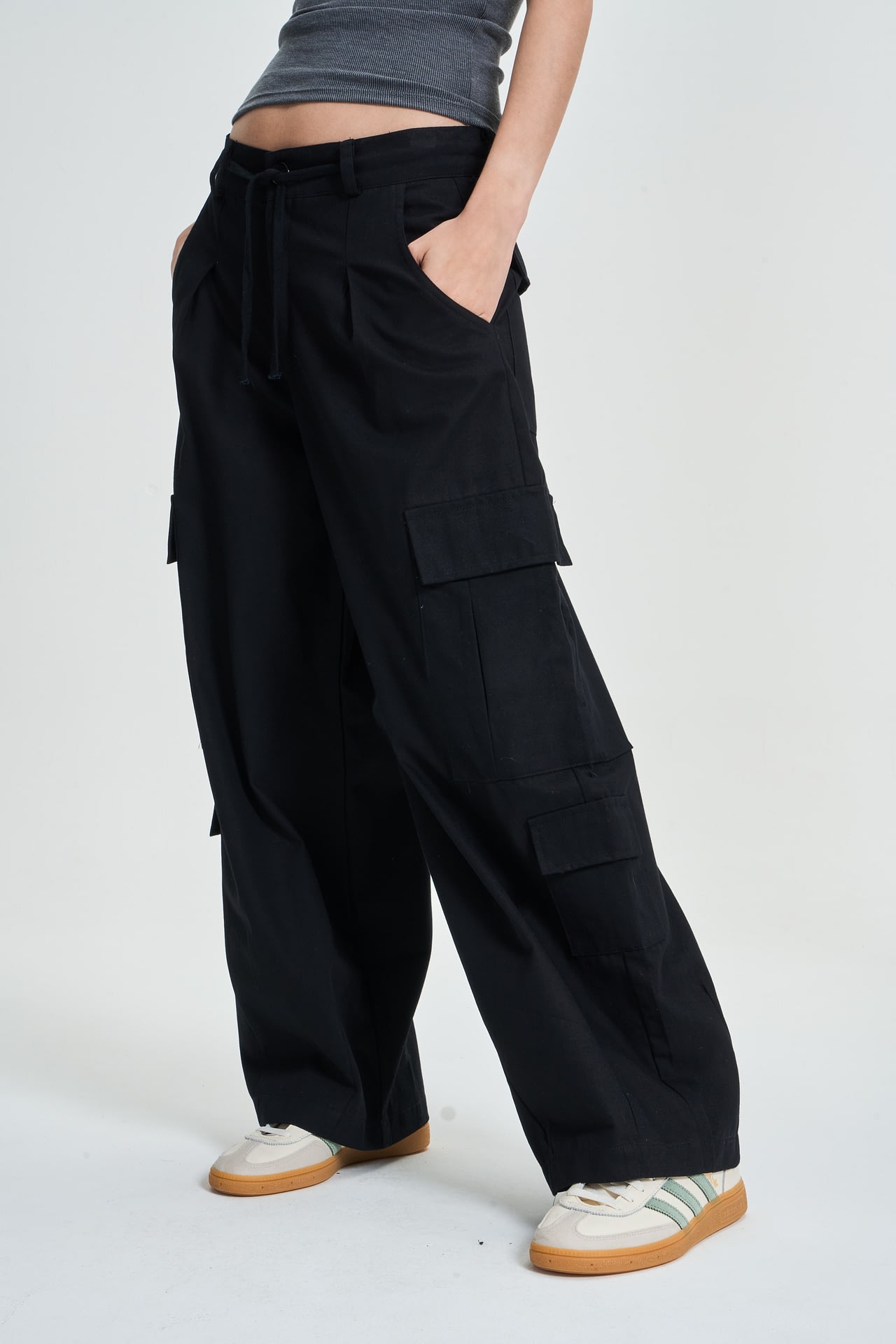 Pantalon cargo de gabardina con 8 bolsillos, cordon para atar. Estilo tiro bajo