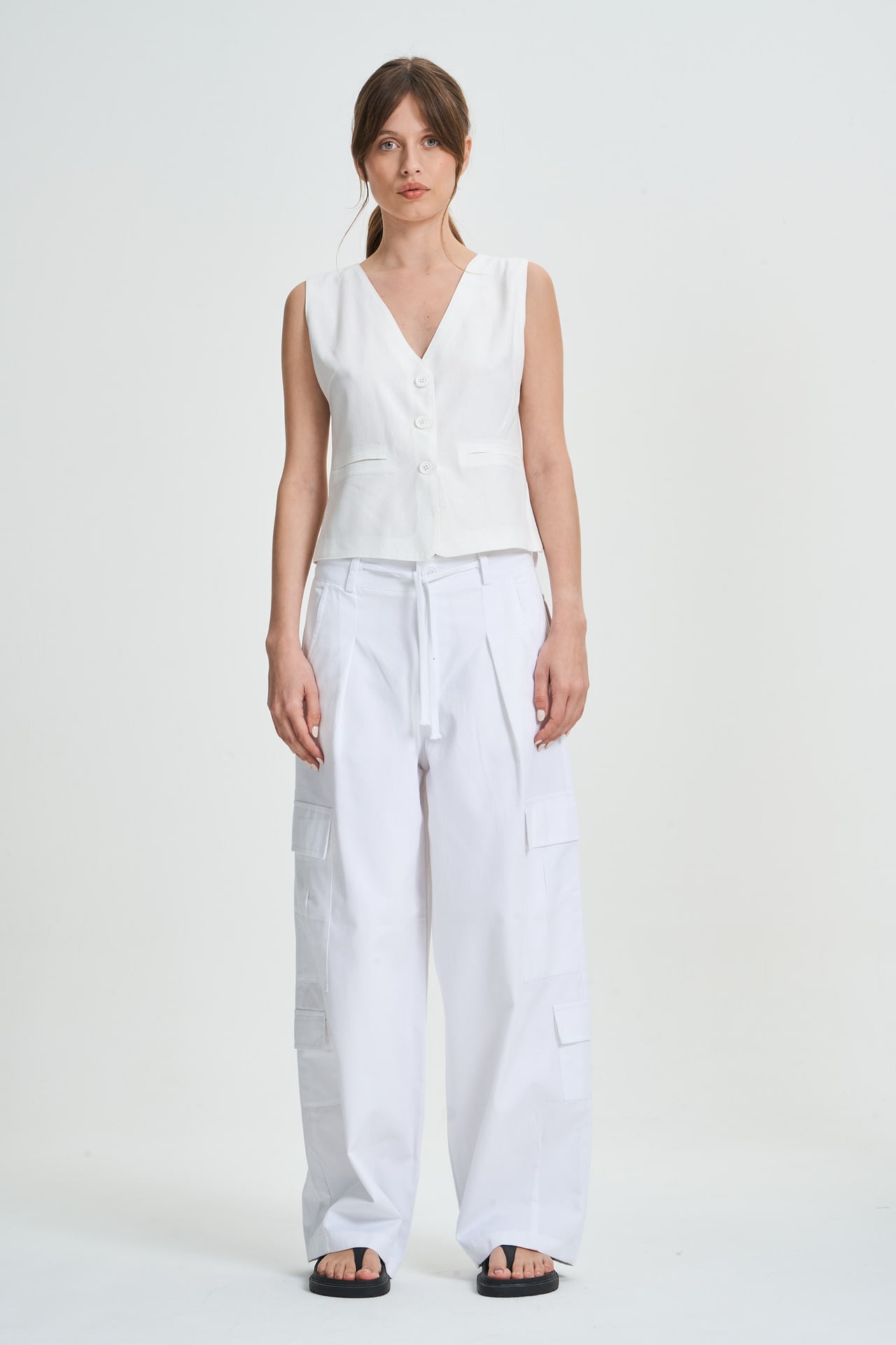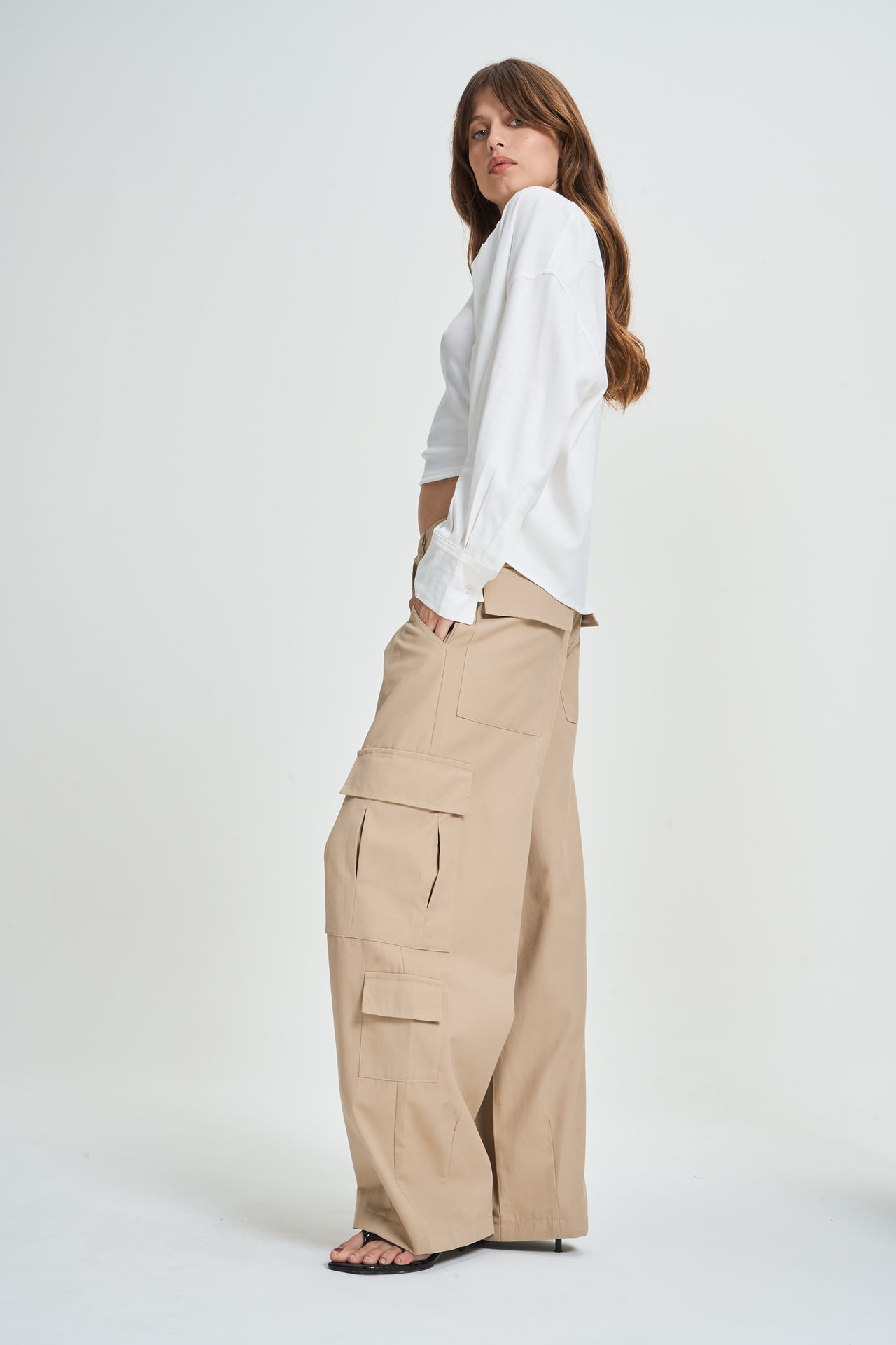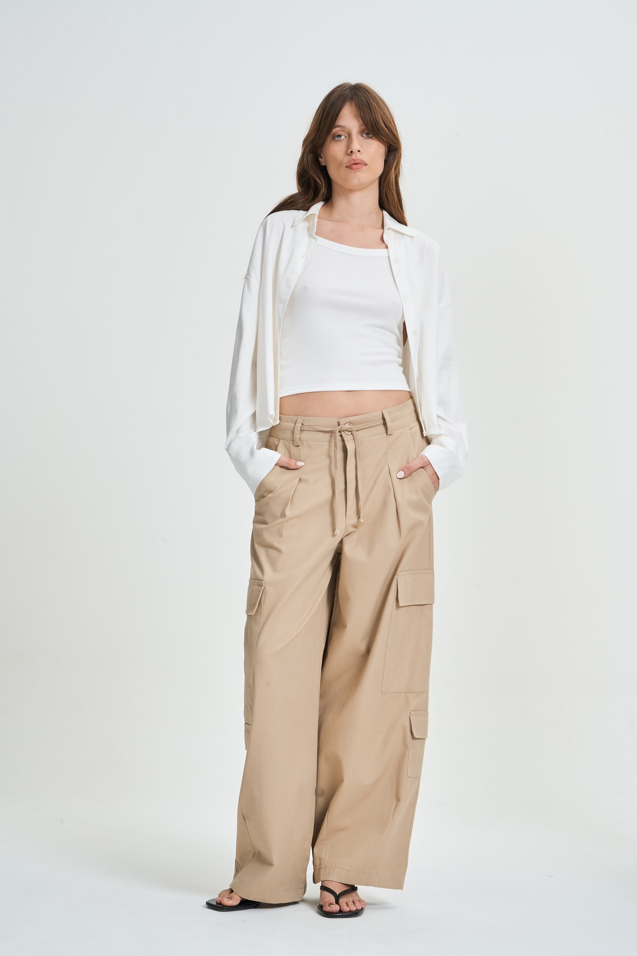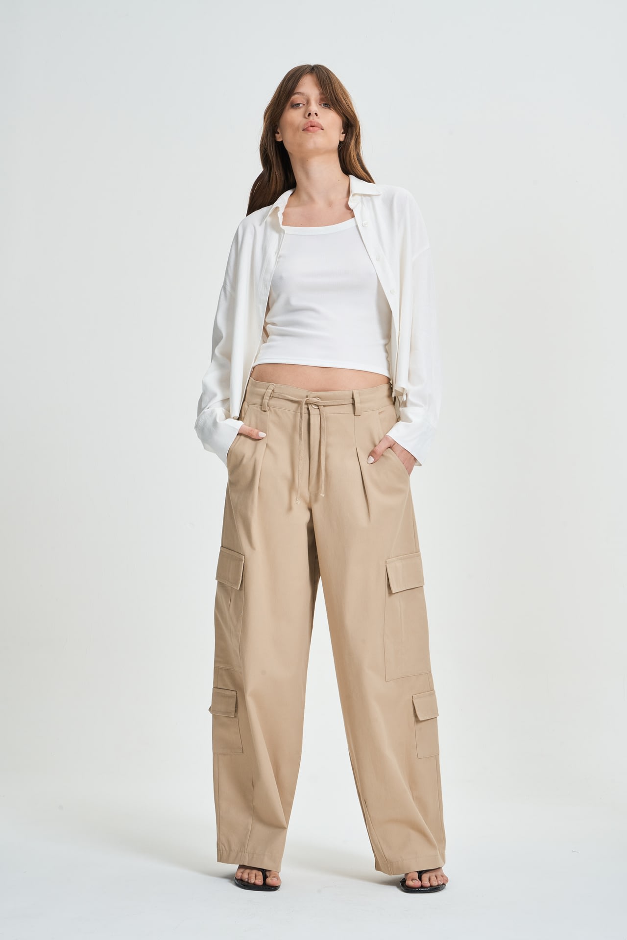 Pantalon cargo de gabardina con 8 bolsillos, cordon para atar. Estilo tiro bajo