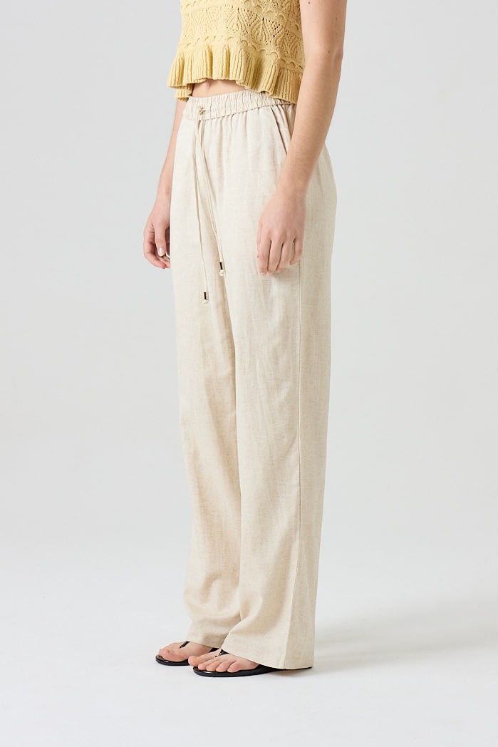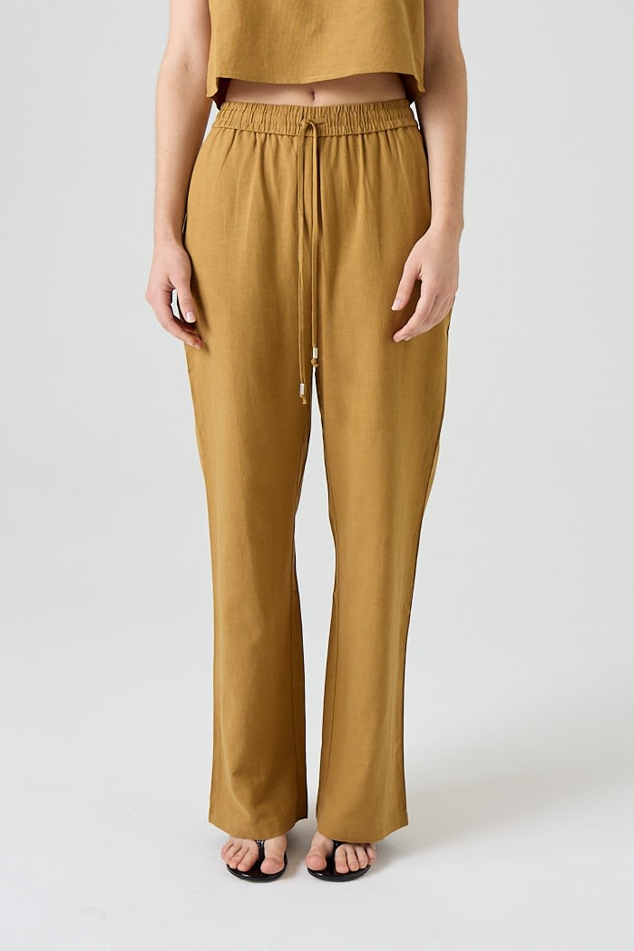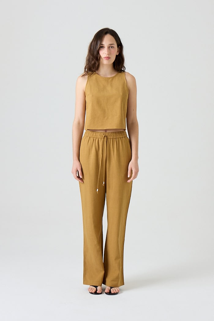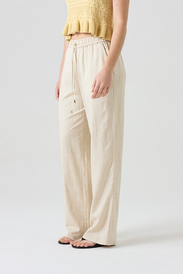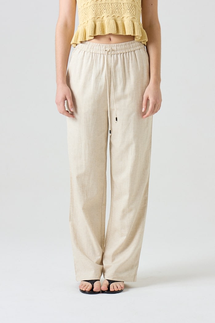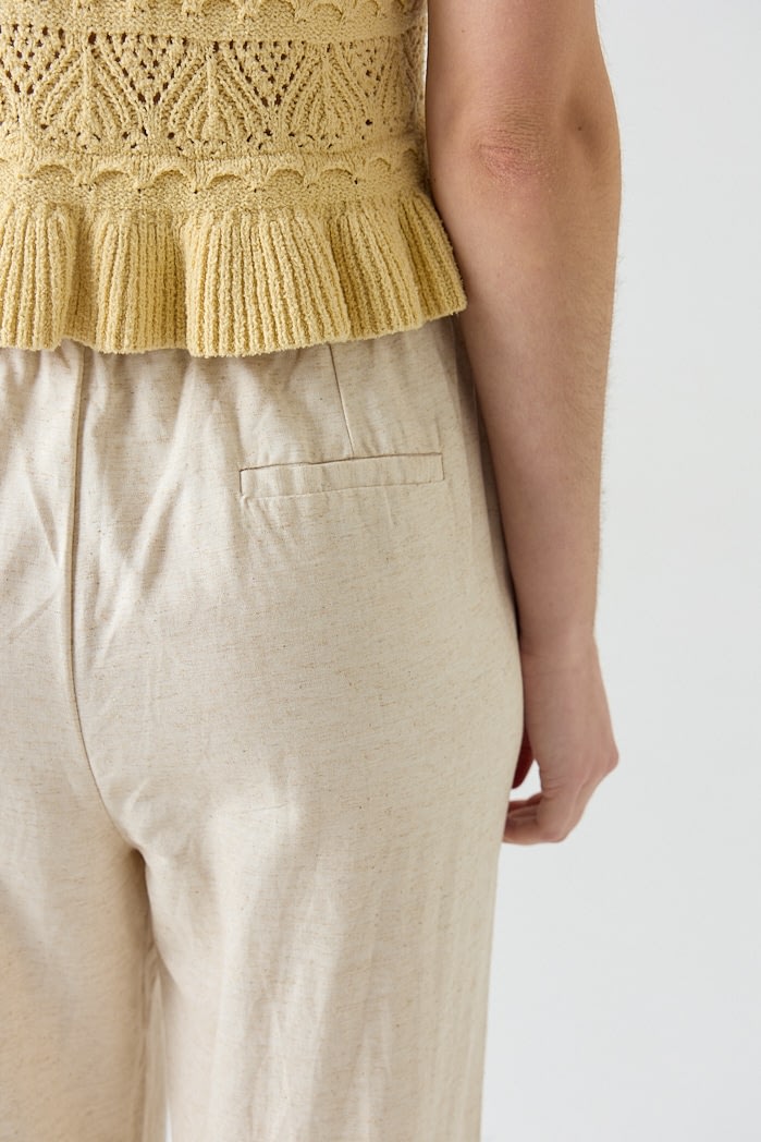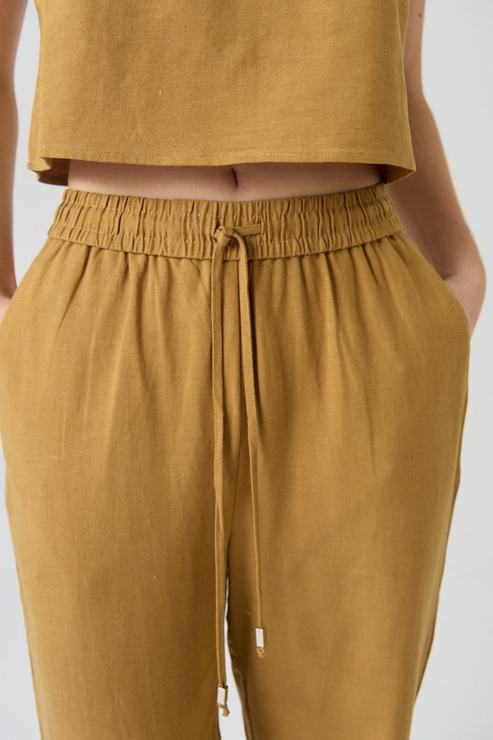 Pantalón de lino liviano con cintura elástica y lazo ajustable. De corte recto y calce relajado, combina comodidad y estilo. Composición: 75% Algodón 25% Lino
