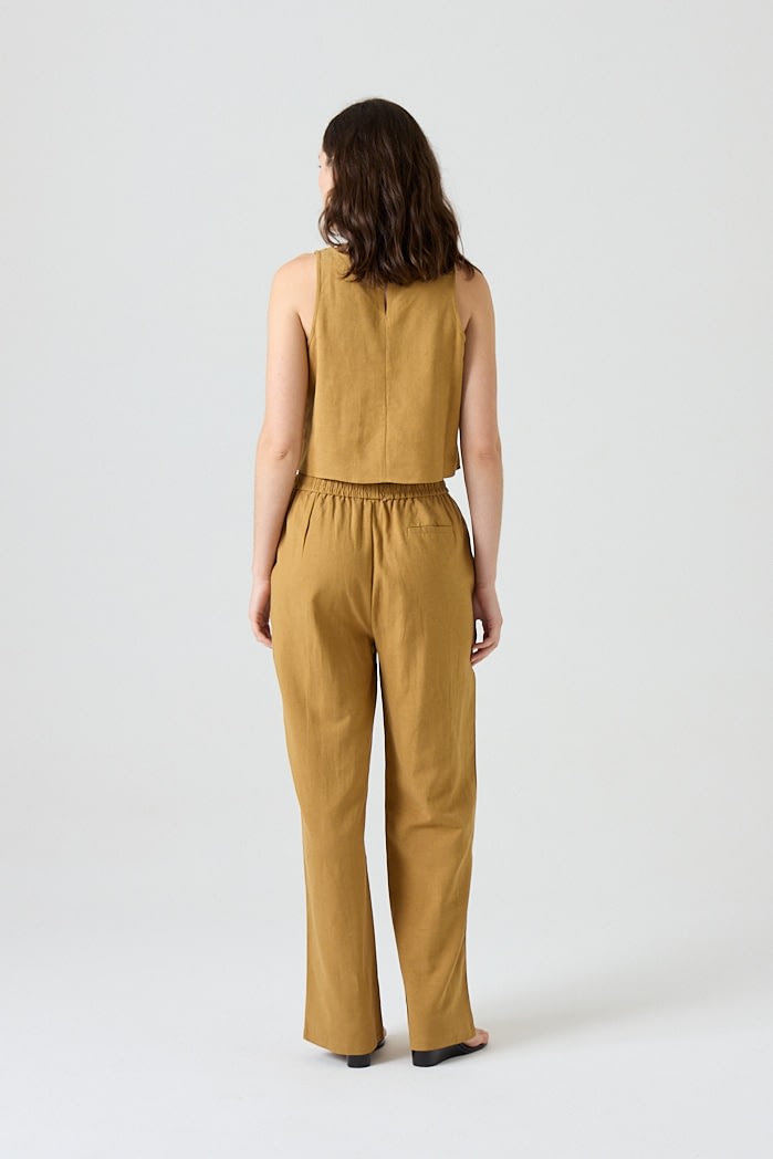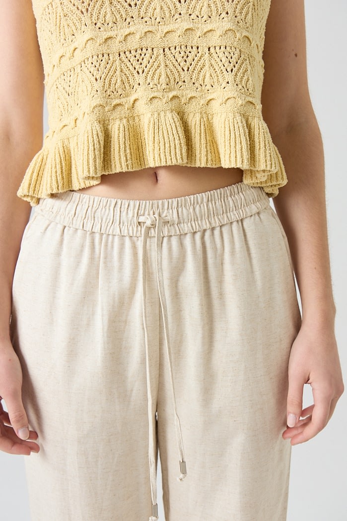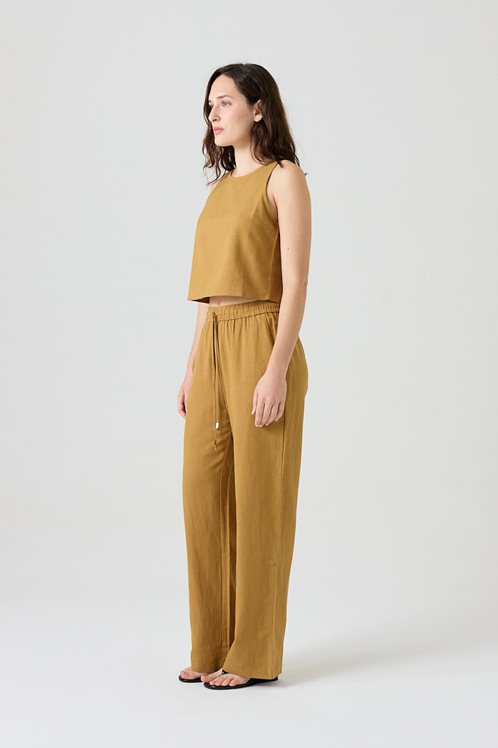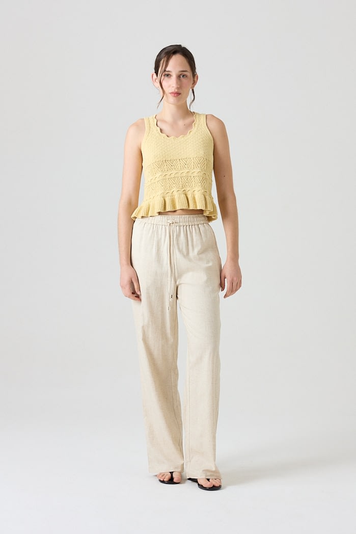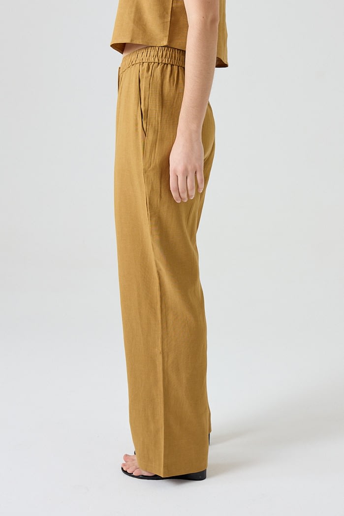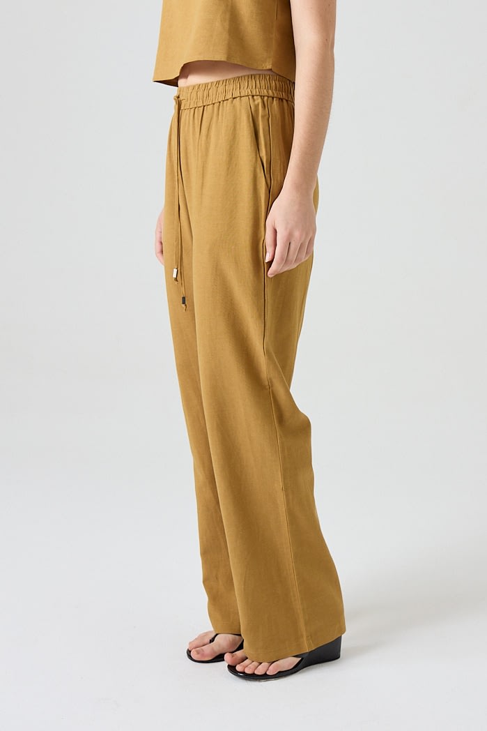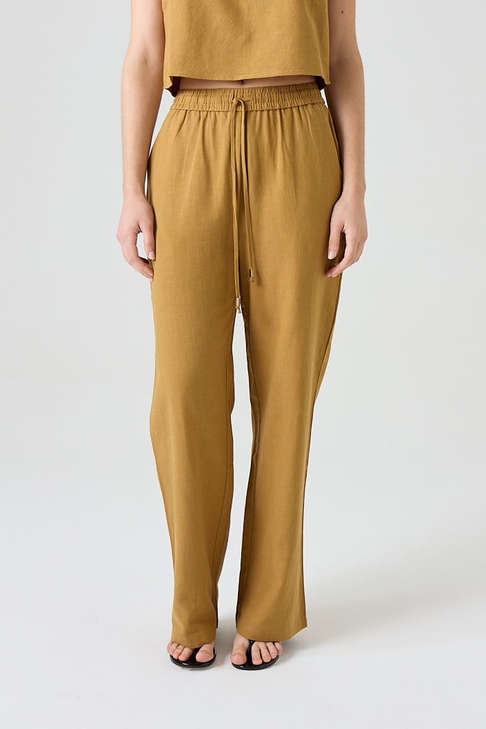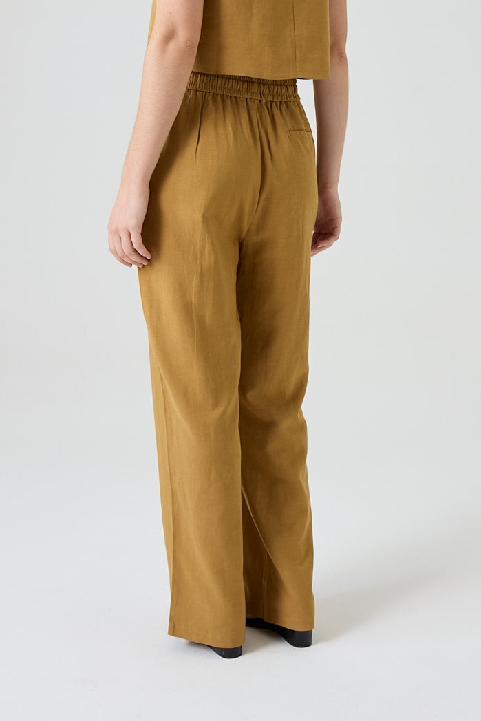 Pantalón de lino liviano con cintura elástica y lazo ajustable. De corte recto y calce relajado, combina comodidad y estilo. Composición: 75% Algodón 25% Lino