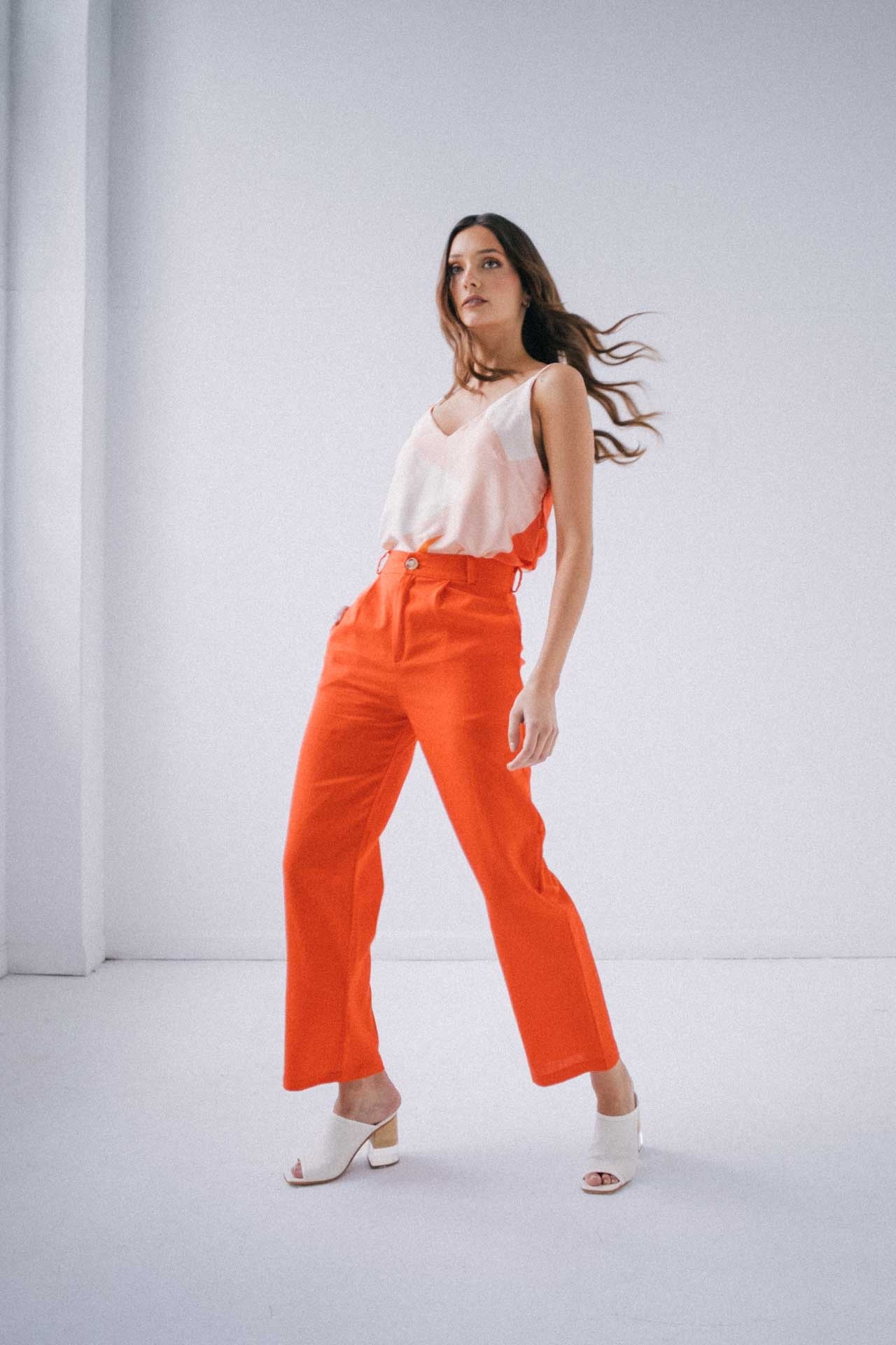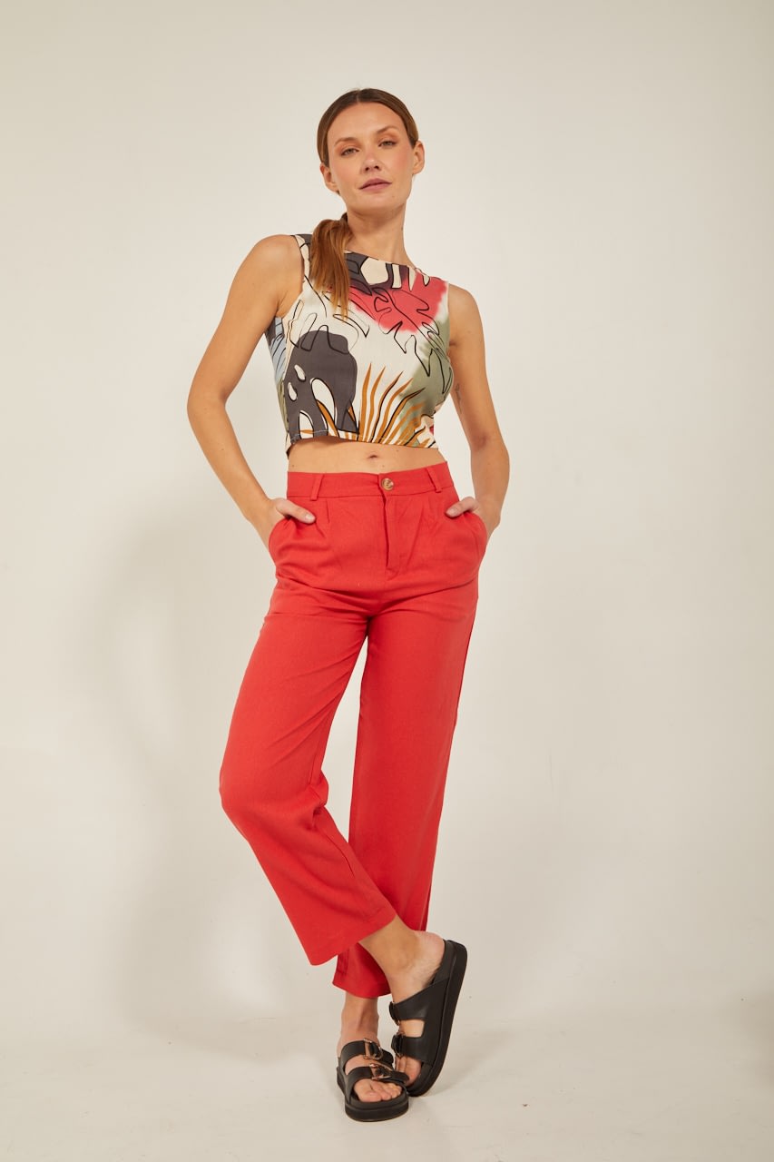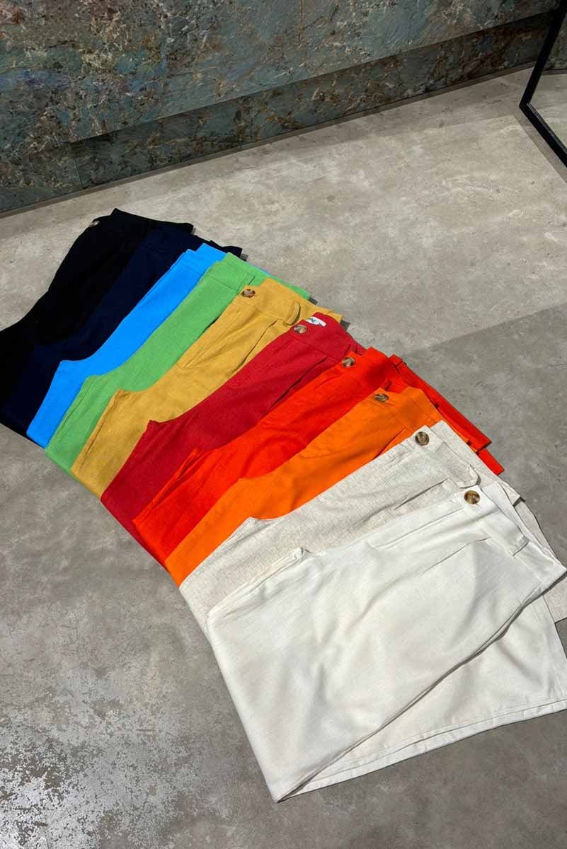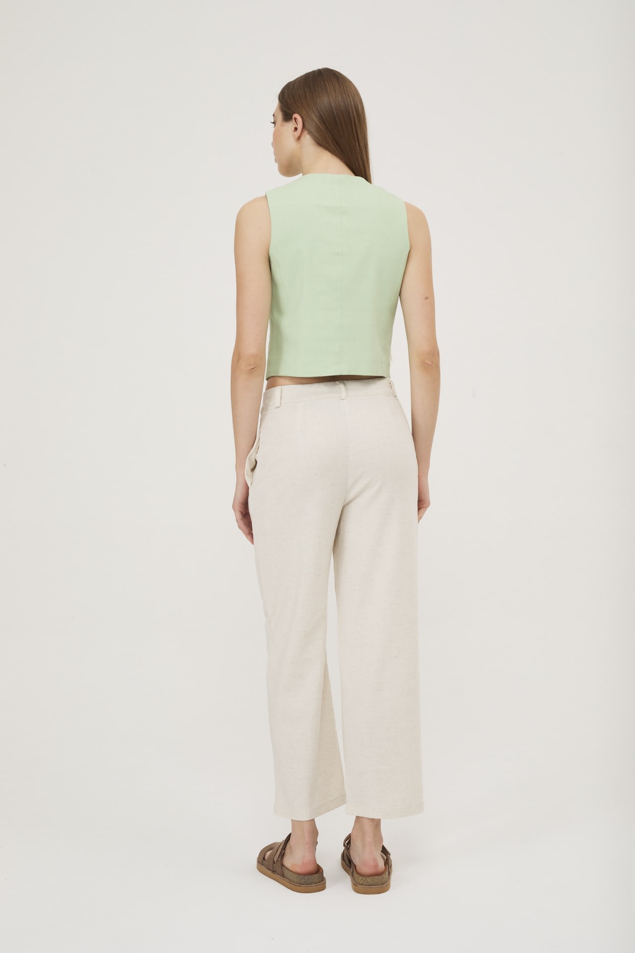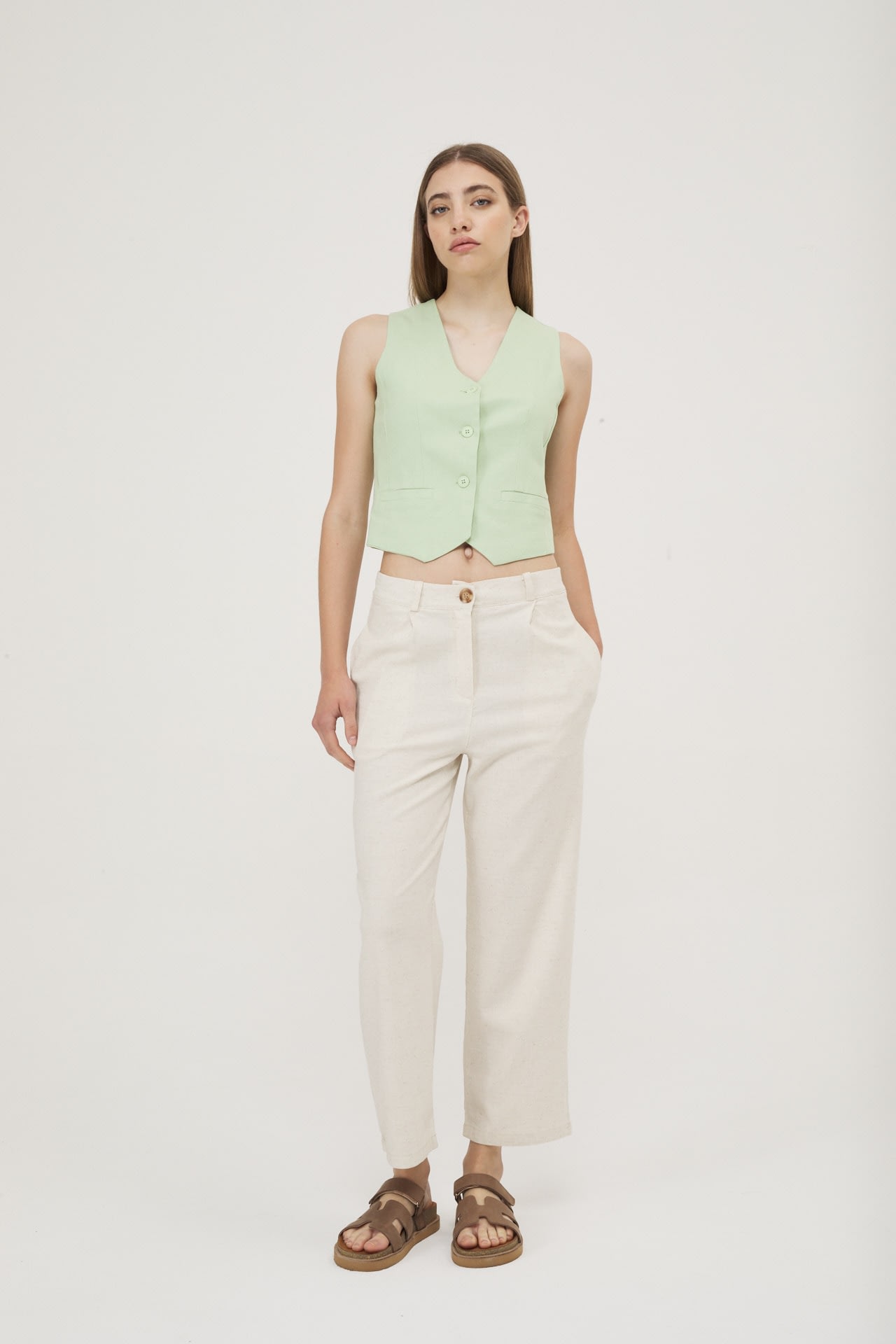 Pantalón recto de lino sastrero, tiro alto, con bolsillos en los laterales. Boton marmolado