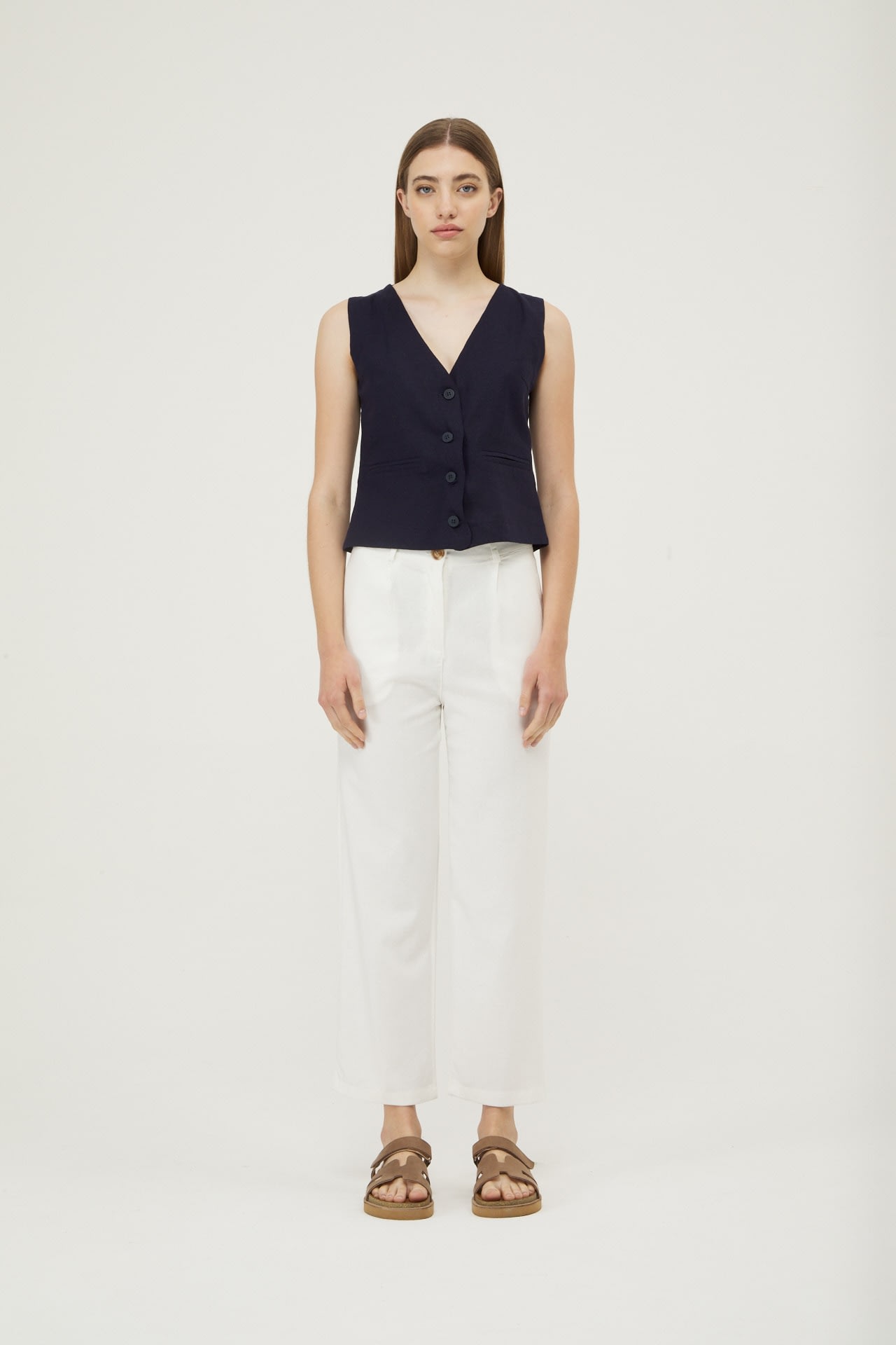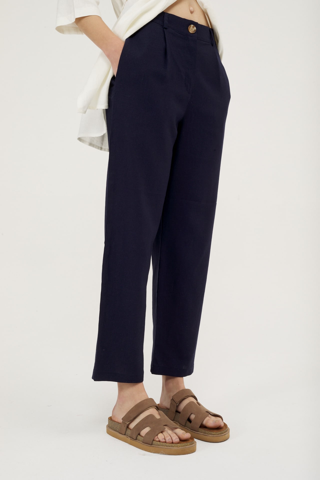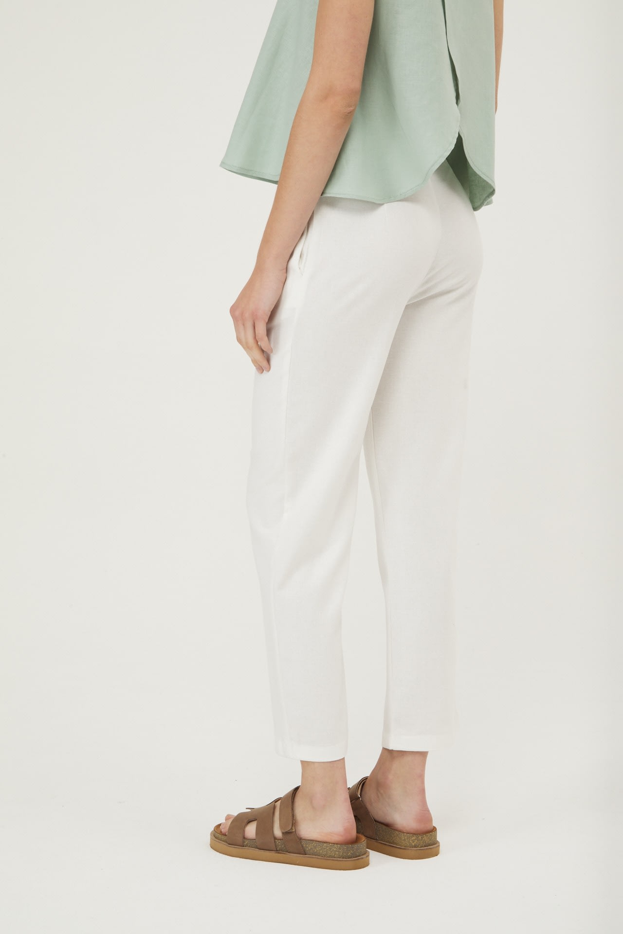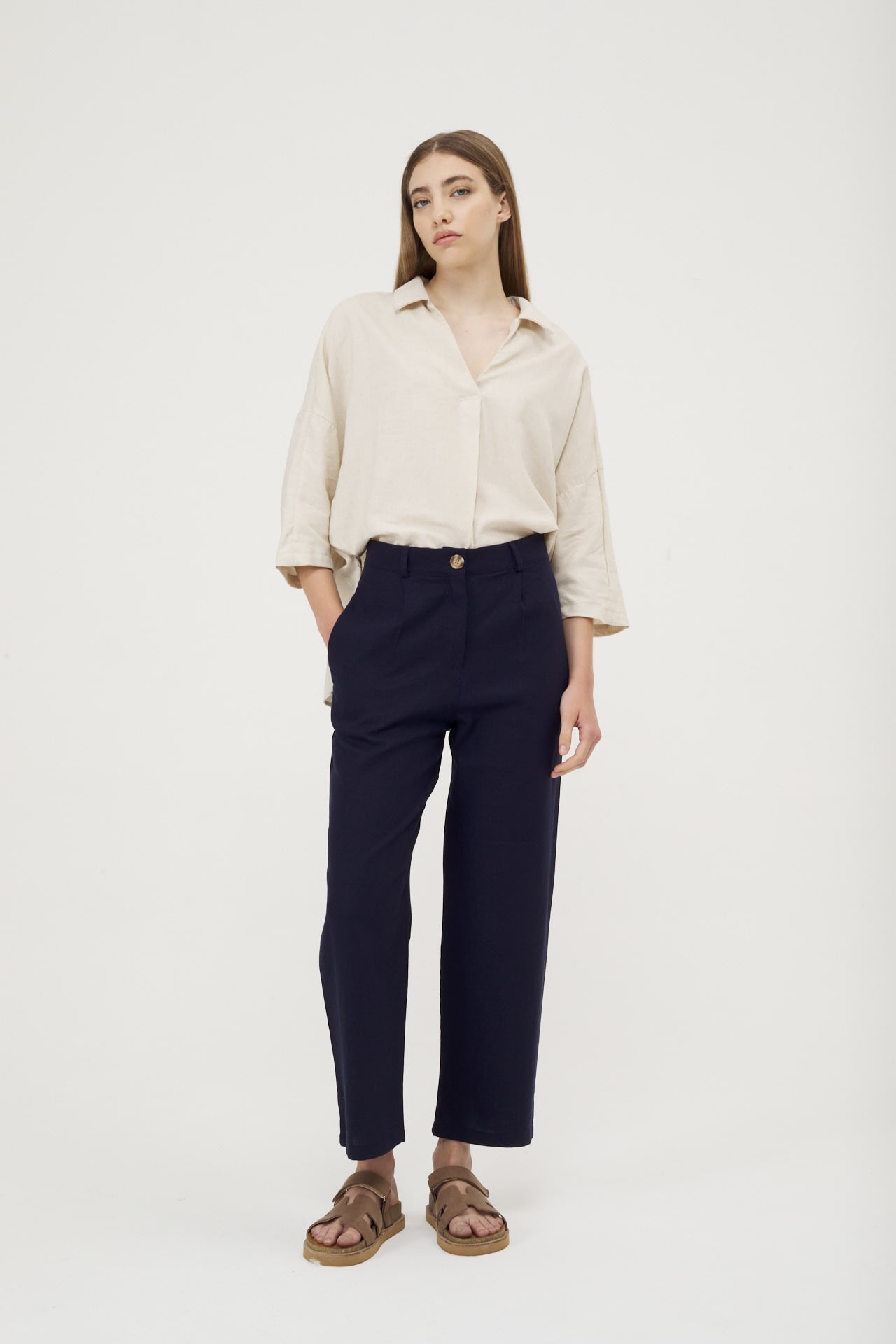 Pantalón recto de lino sastrero, tiro alto, con bolsillos en los laterales. Boton marmolado