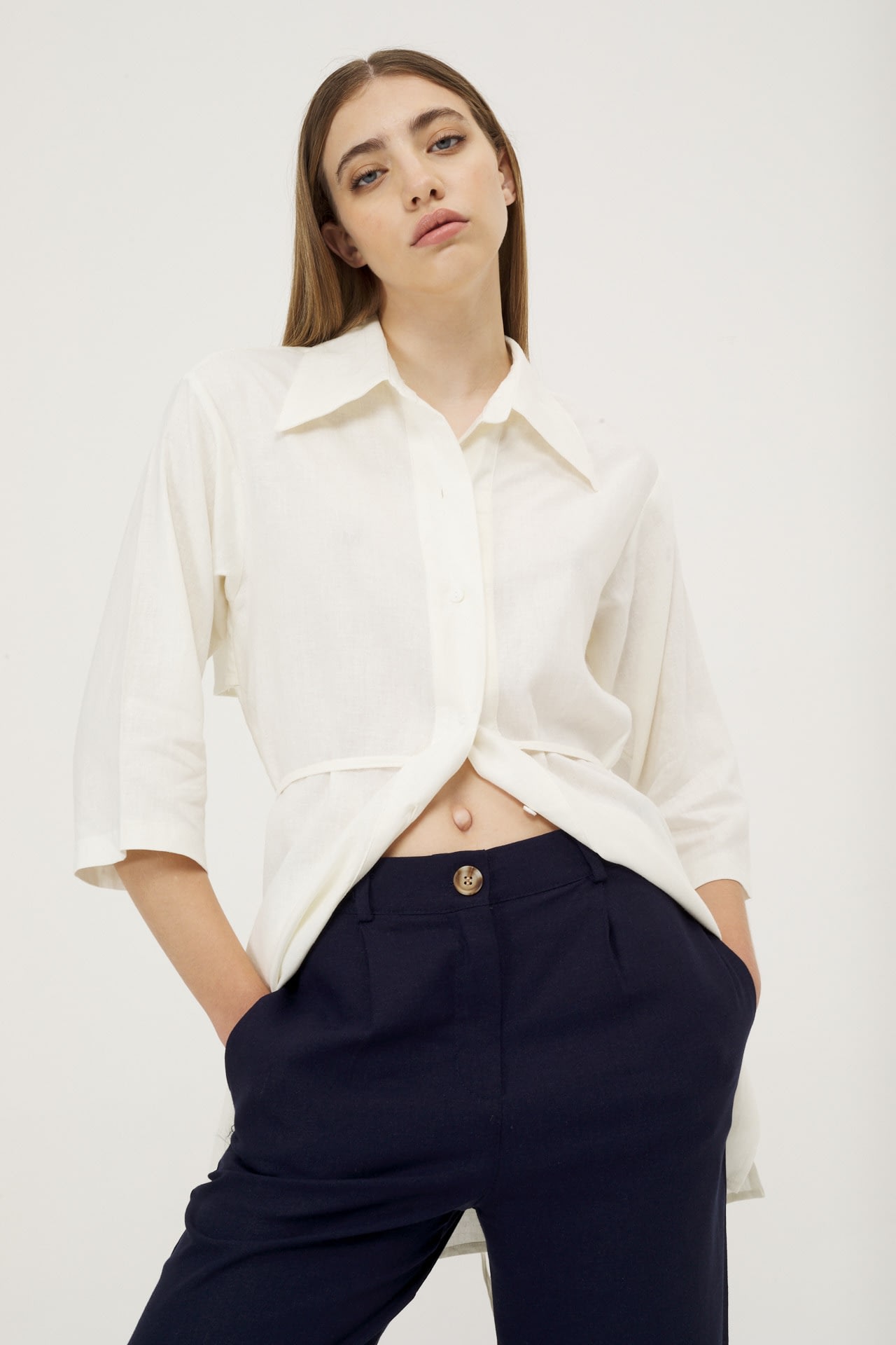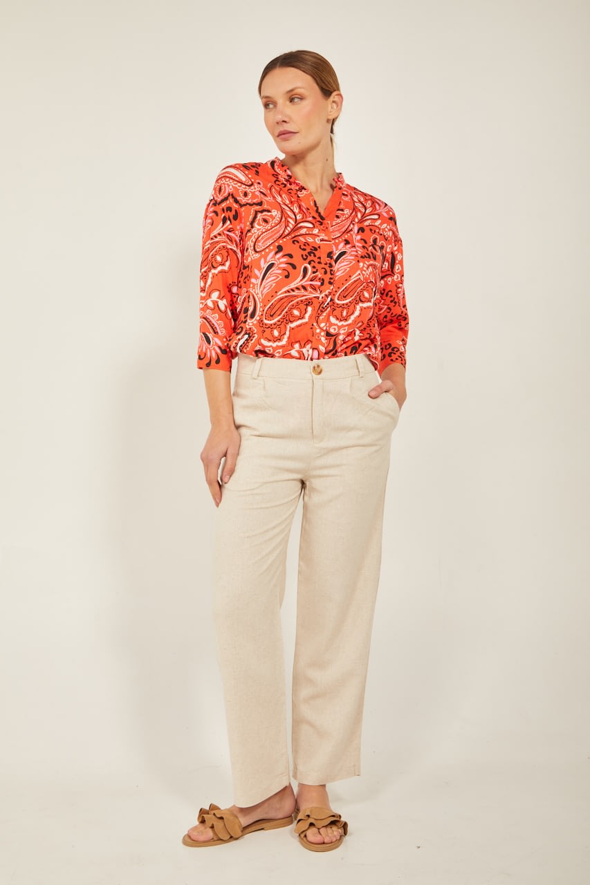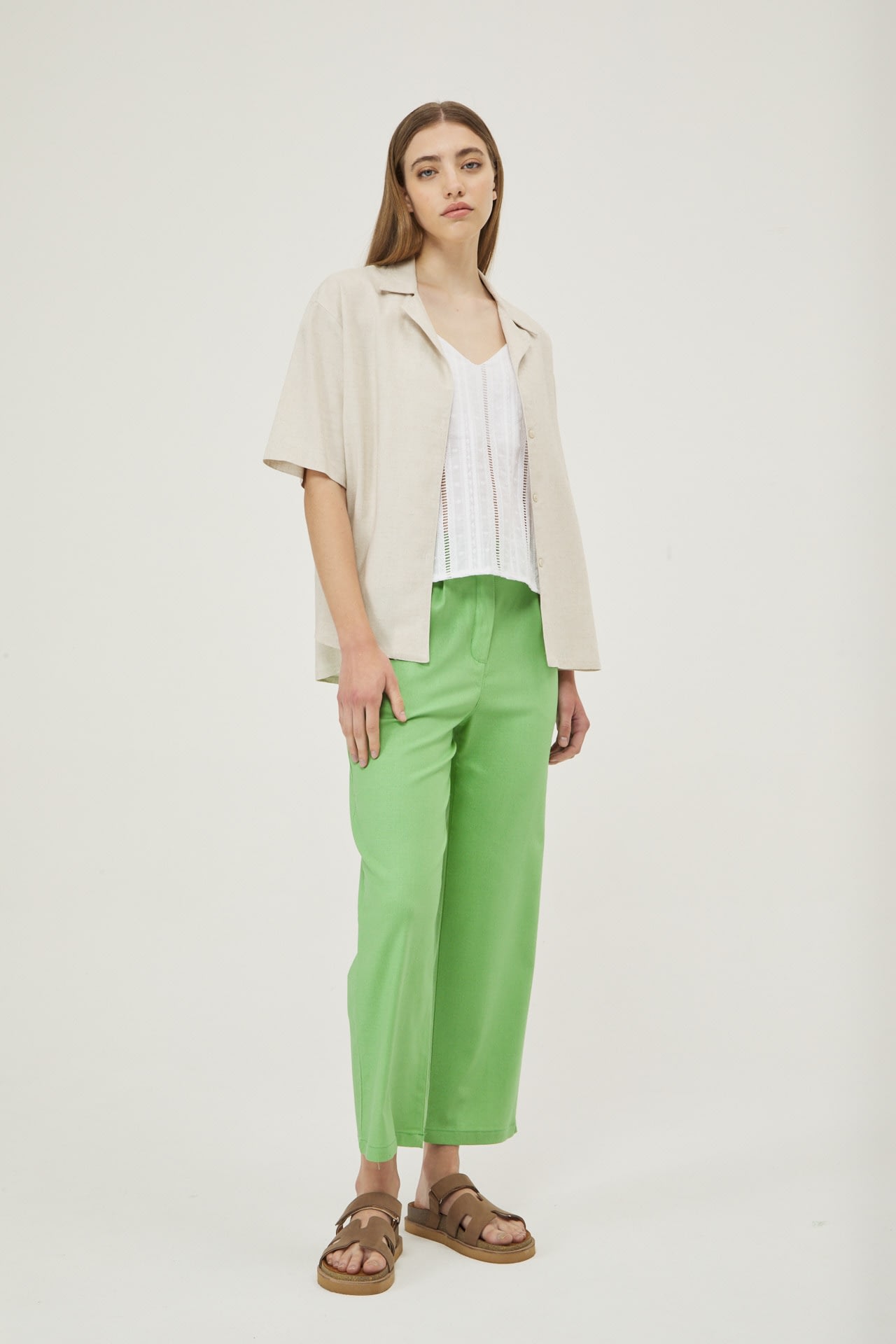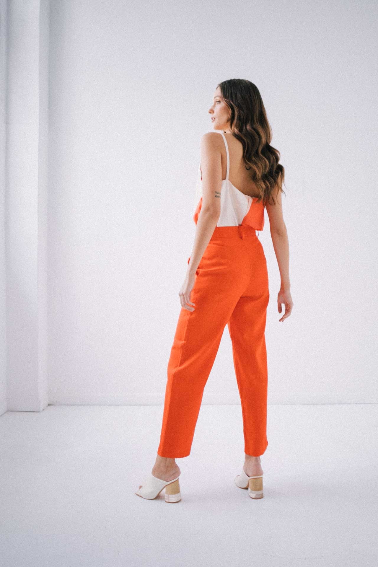 Pantalón recto de lino sastrero, tiro alto, con bolsillos en los laterales. Boton marmolado