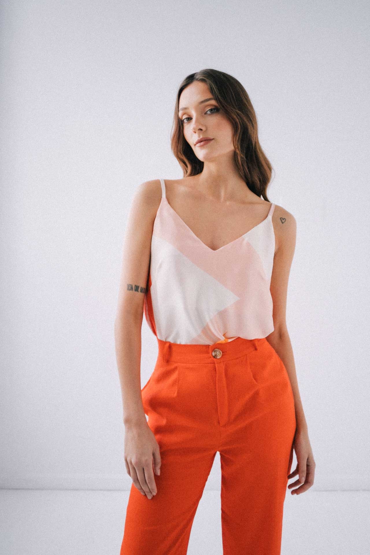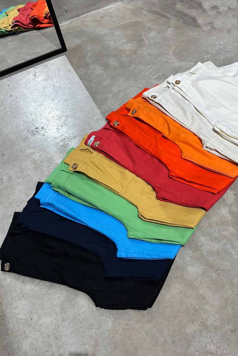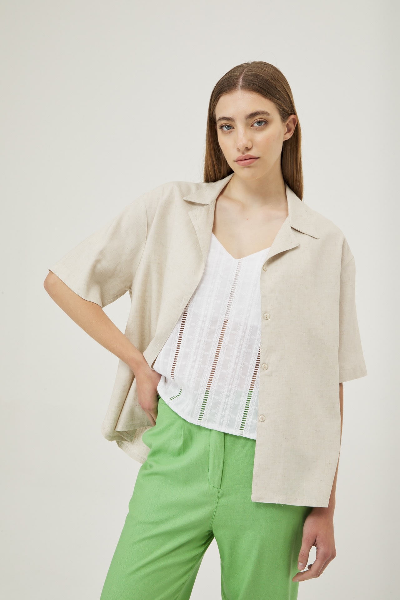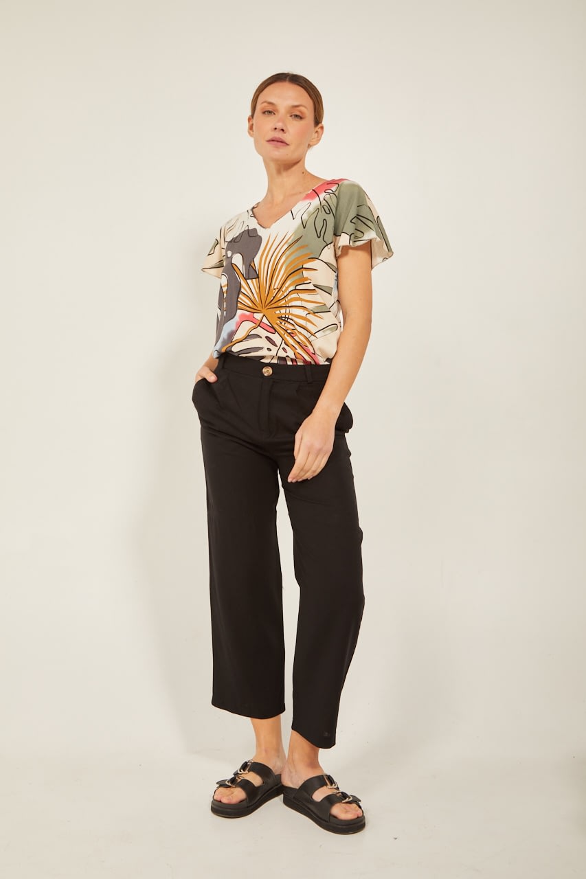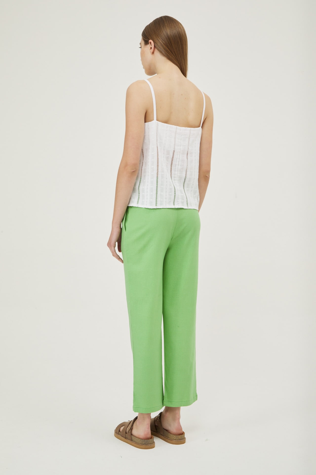 Pantalón recto de lino sastrero, tiro alto, con bolsillos en los laterales. Boton marmolado