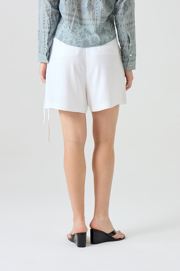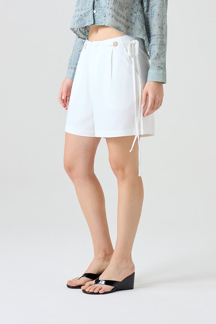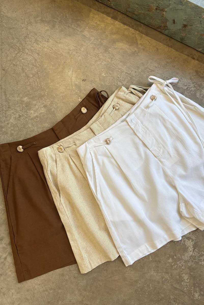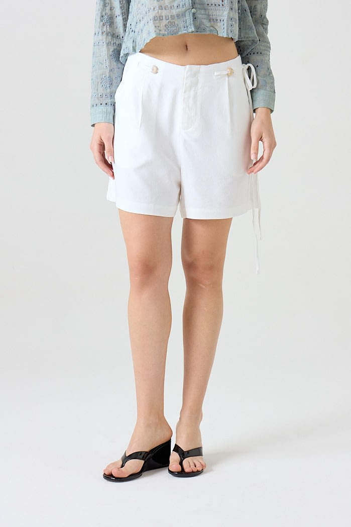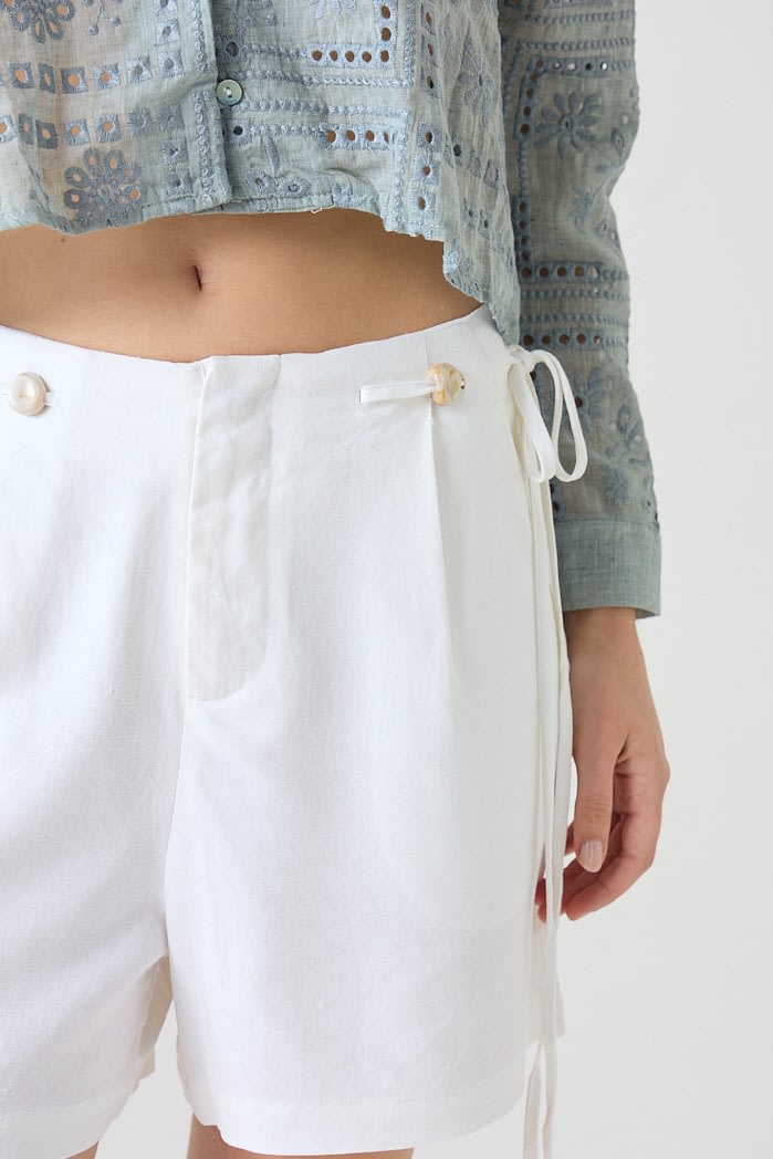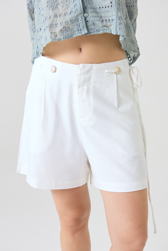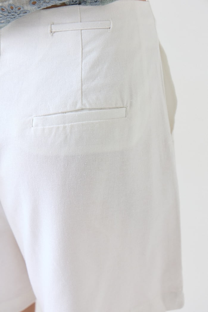 Short de tiro medio confeccionado en tela liviana. Presenta bolsillos laterales, pinzas frontales y ajuste con botones y lazo en los laterales. Composicion: 70% Viscosa 30% Lino