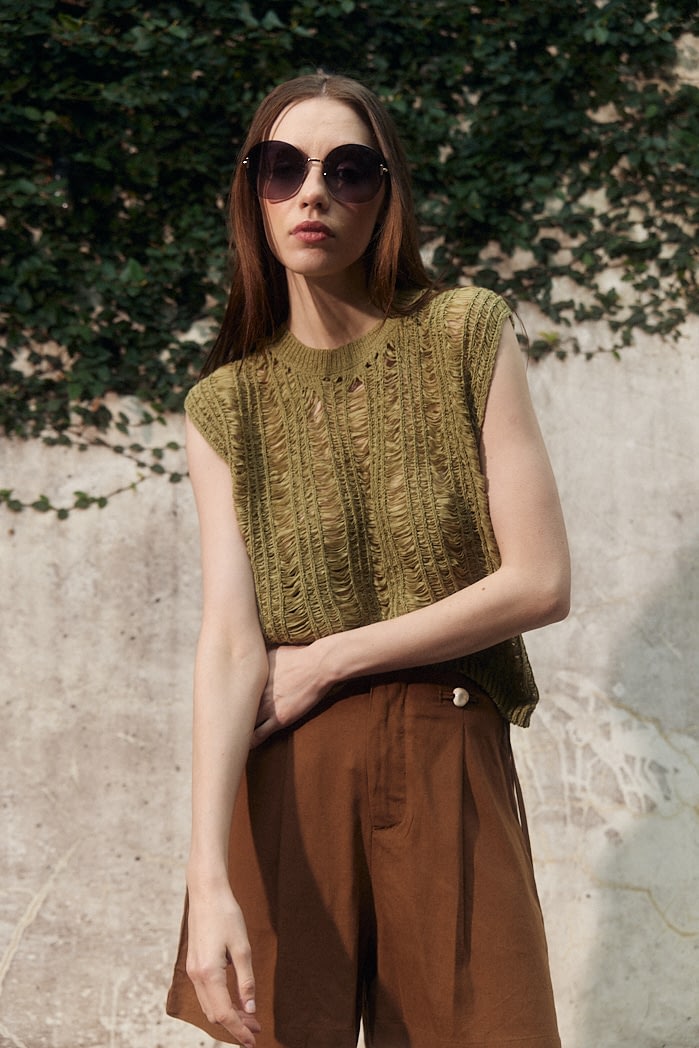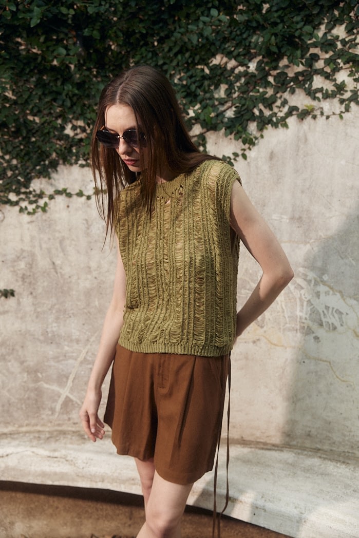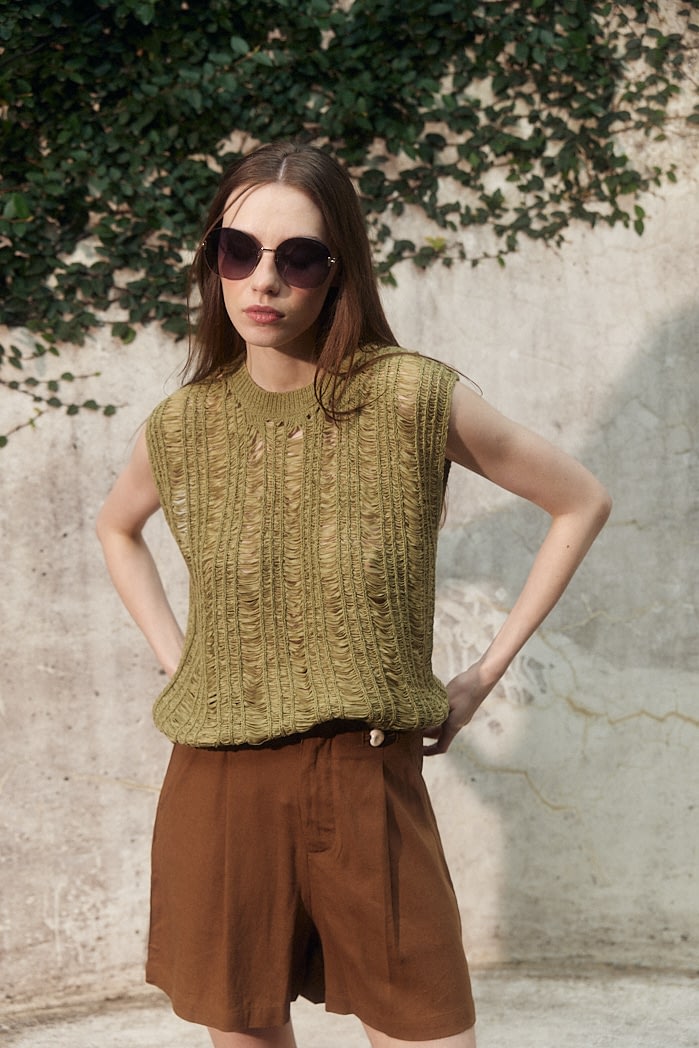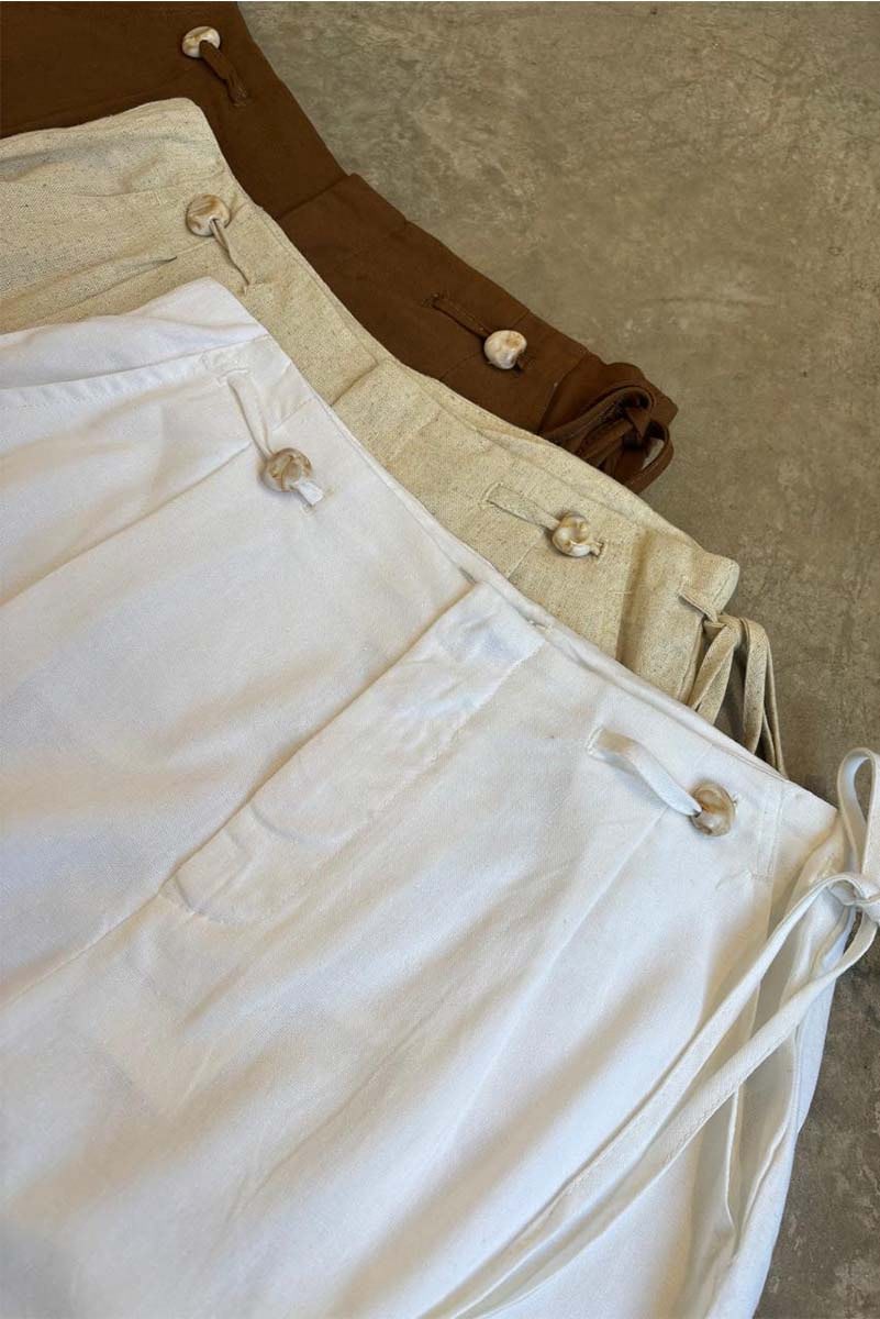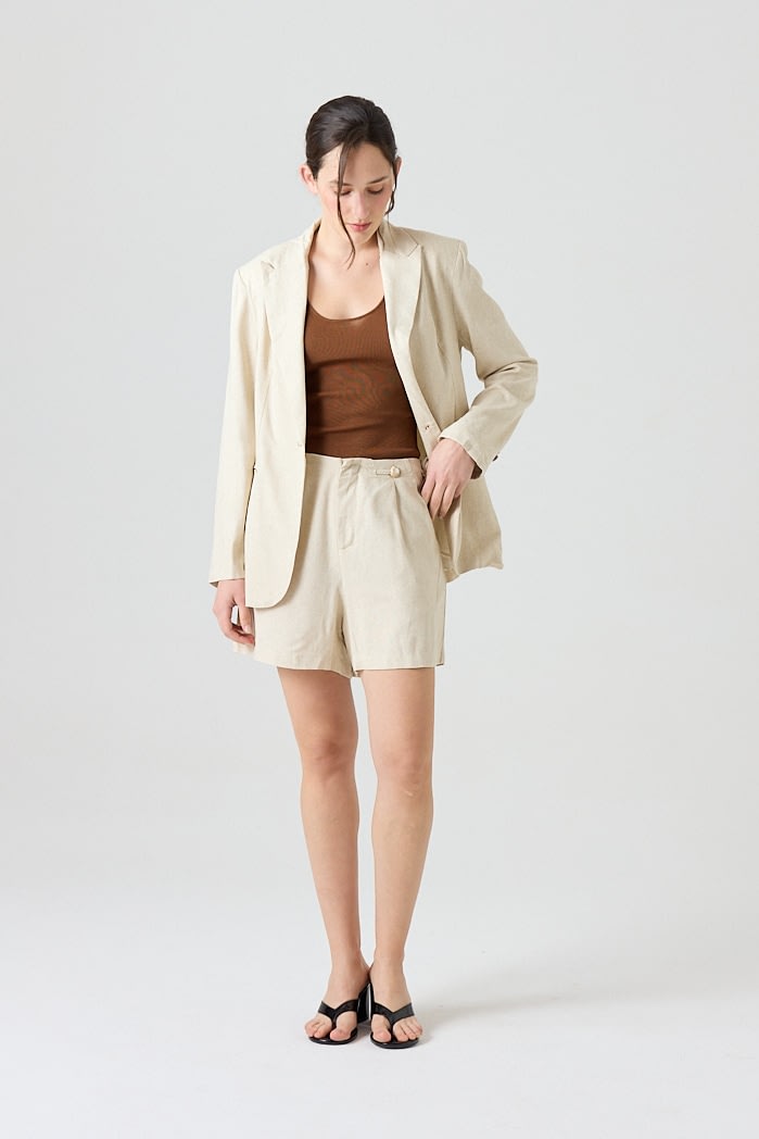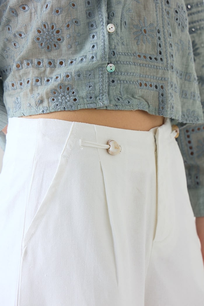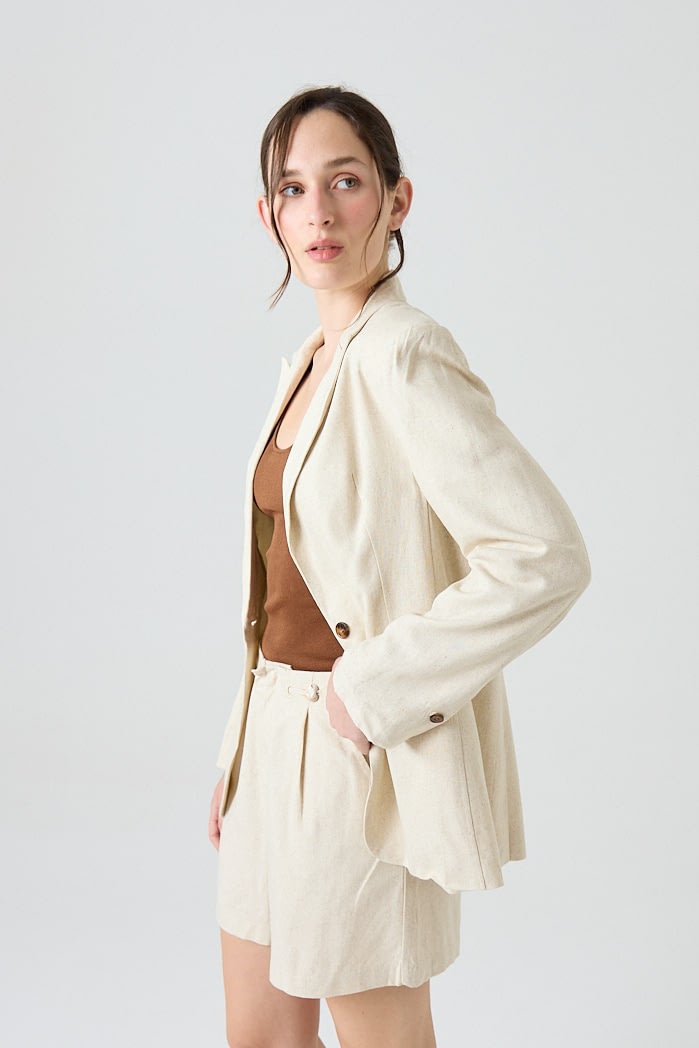 Short de tiro medio confeccionado en tela liviana. Presenta bolsillos laterales, pinzas frontales y ajuste con botones y lazo en los laterales. Composicion: 70% Viscosa 30% Lino