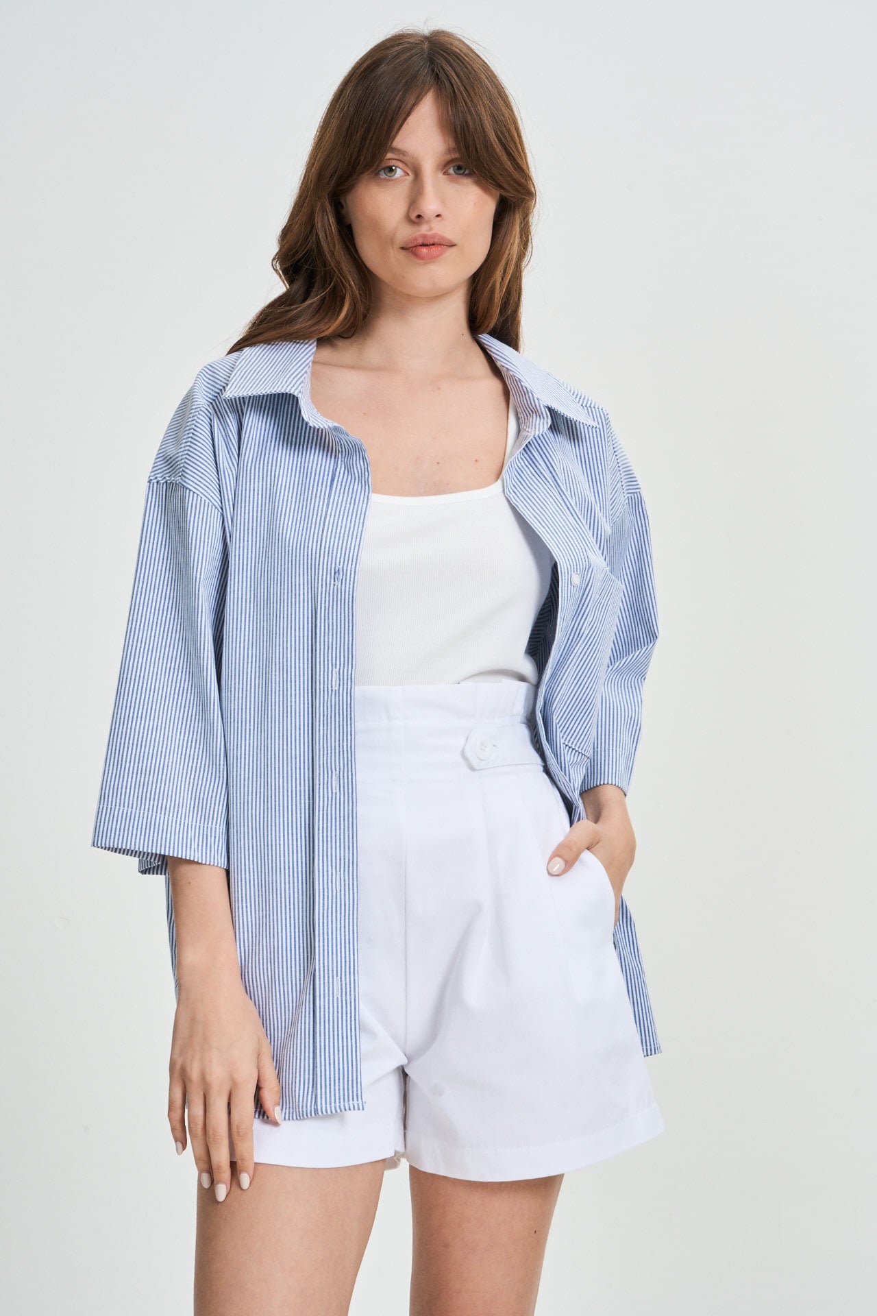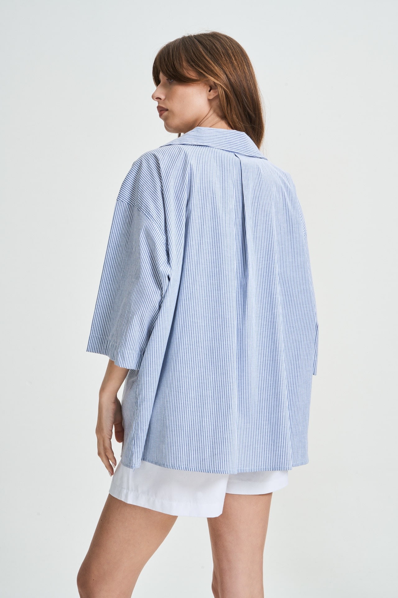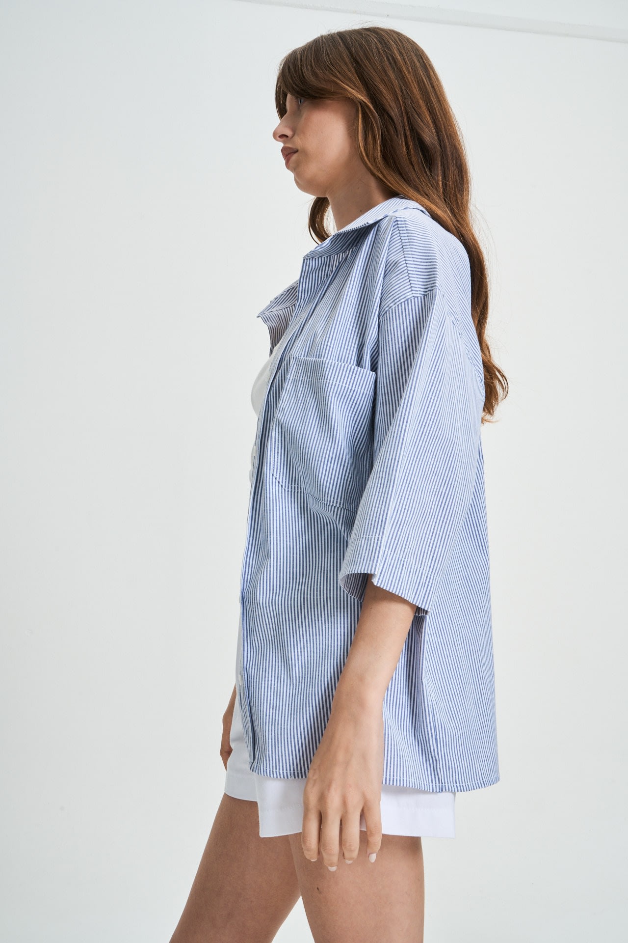 Camisa rayada con manga 3/4, botones al tono y bolsillo delantero.