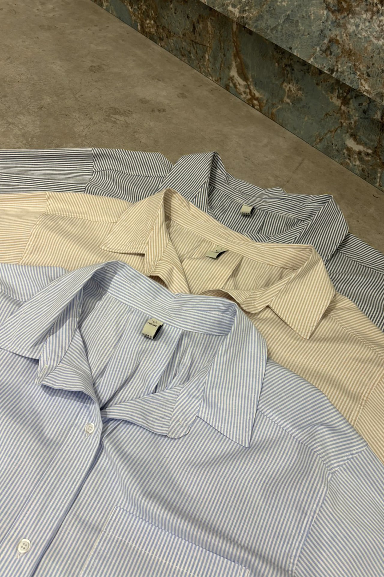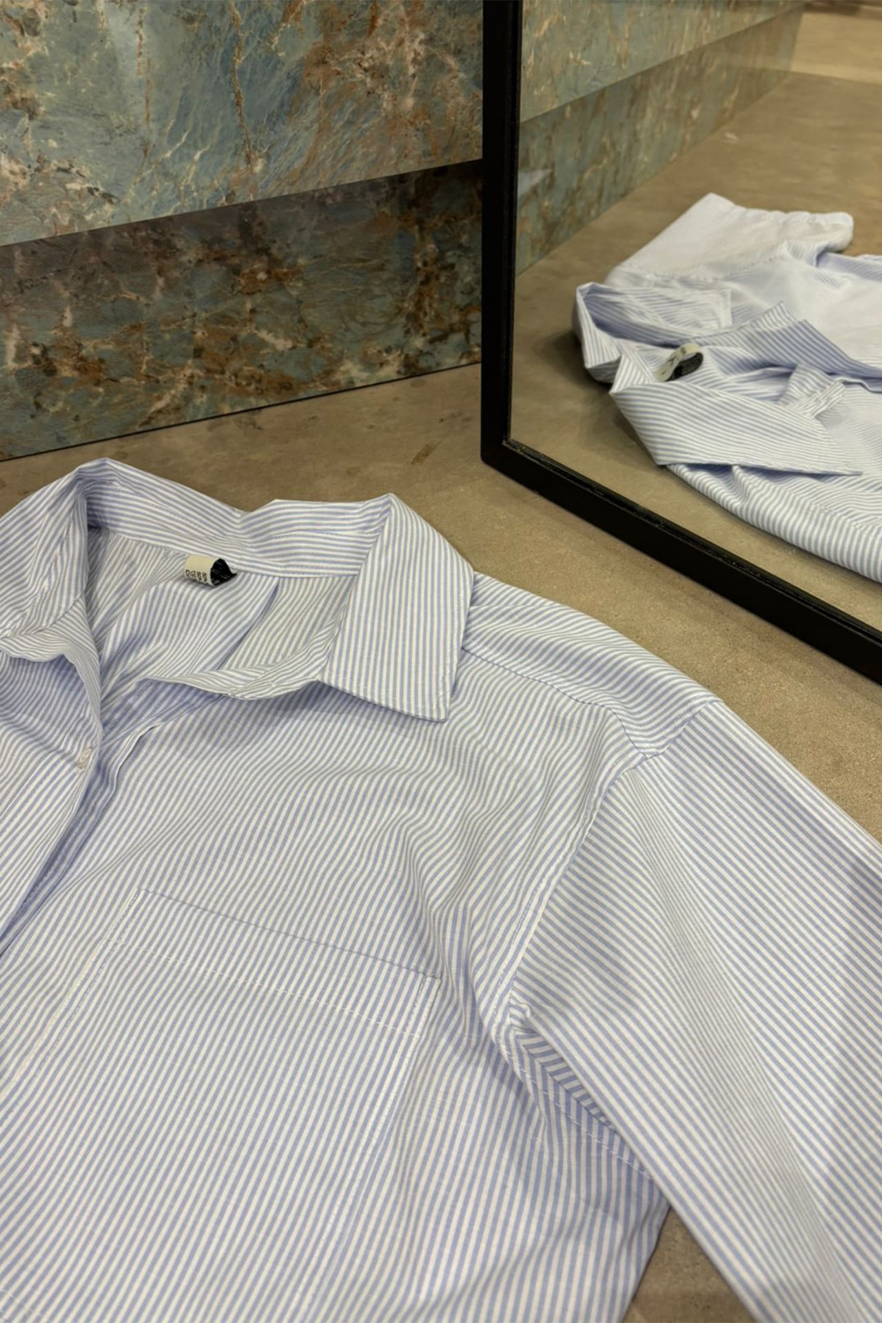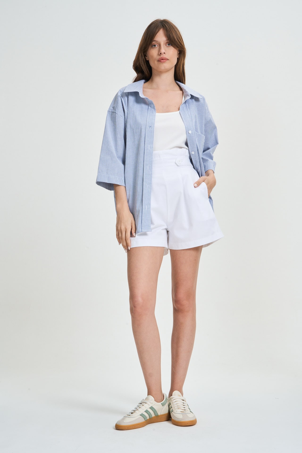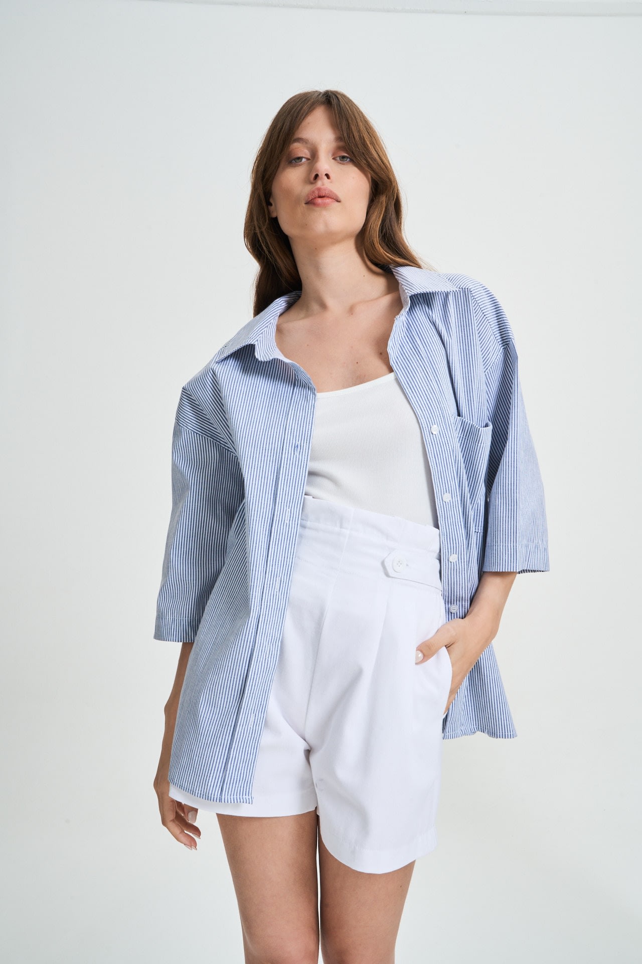 Camisa rayada con manga 3/4, botones al tono y bolsillo delantero.
