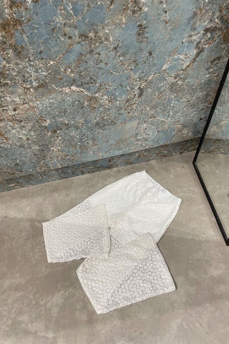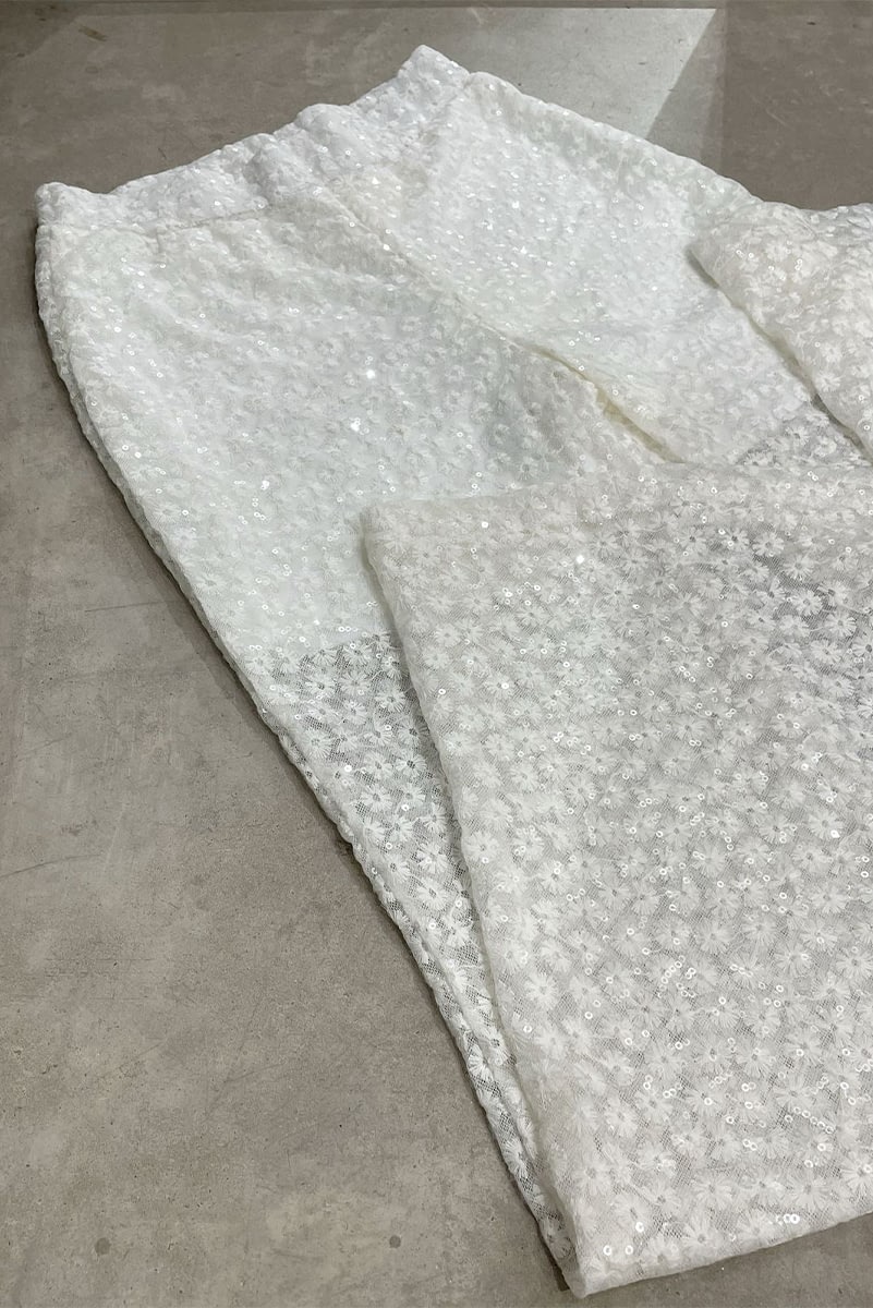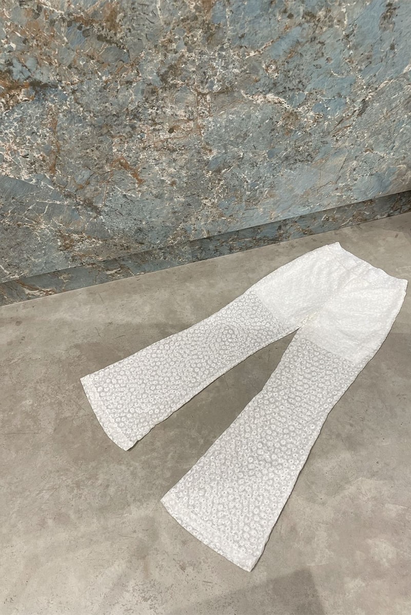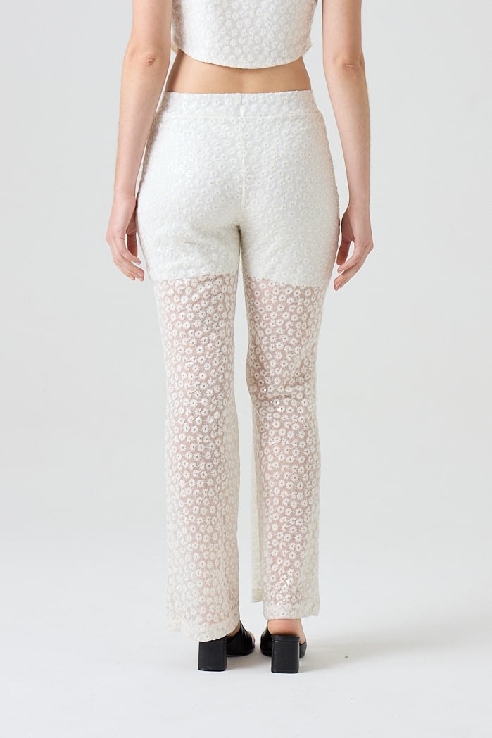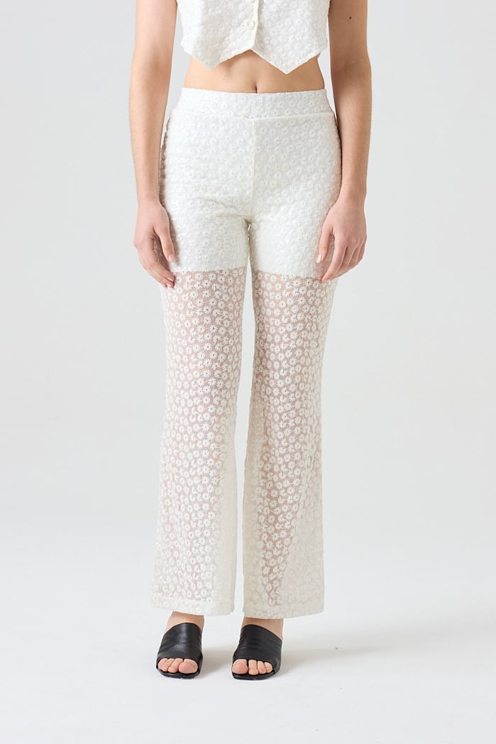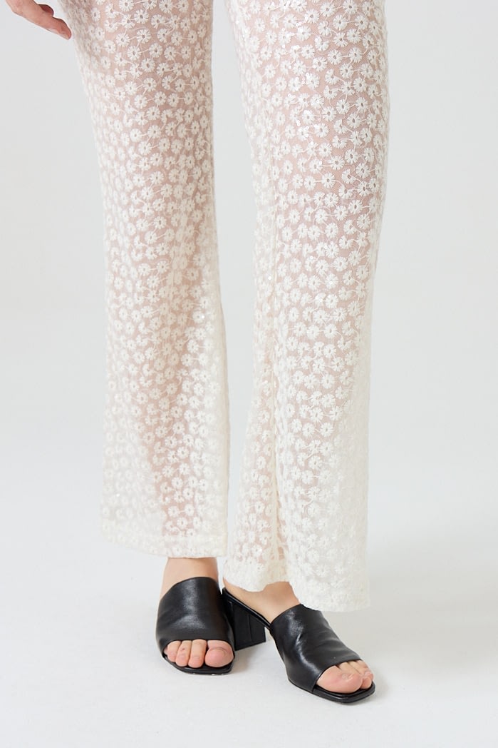 Pantalón blanco de encaje floral (lentejuela) con diseño semitransparente en la parte inferior. Presenta corte recto levemente acampanado y cintura elástica para mayor comodidad.