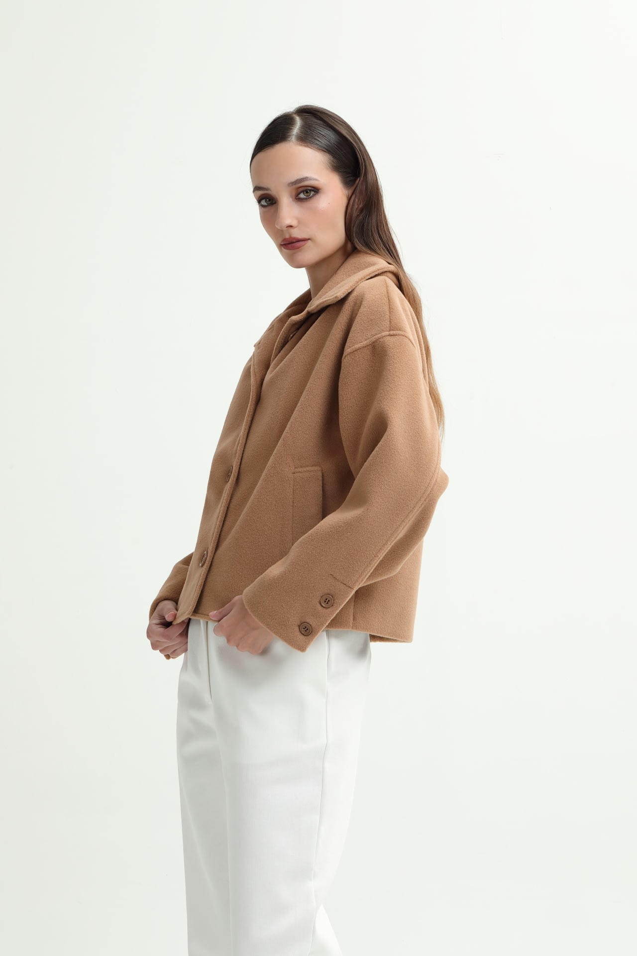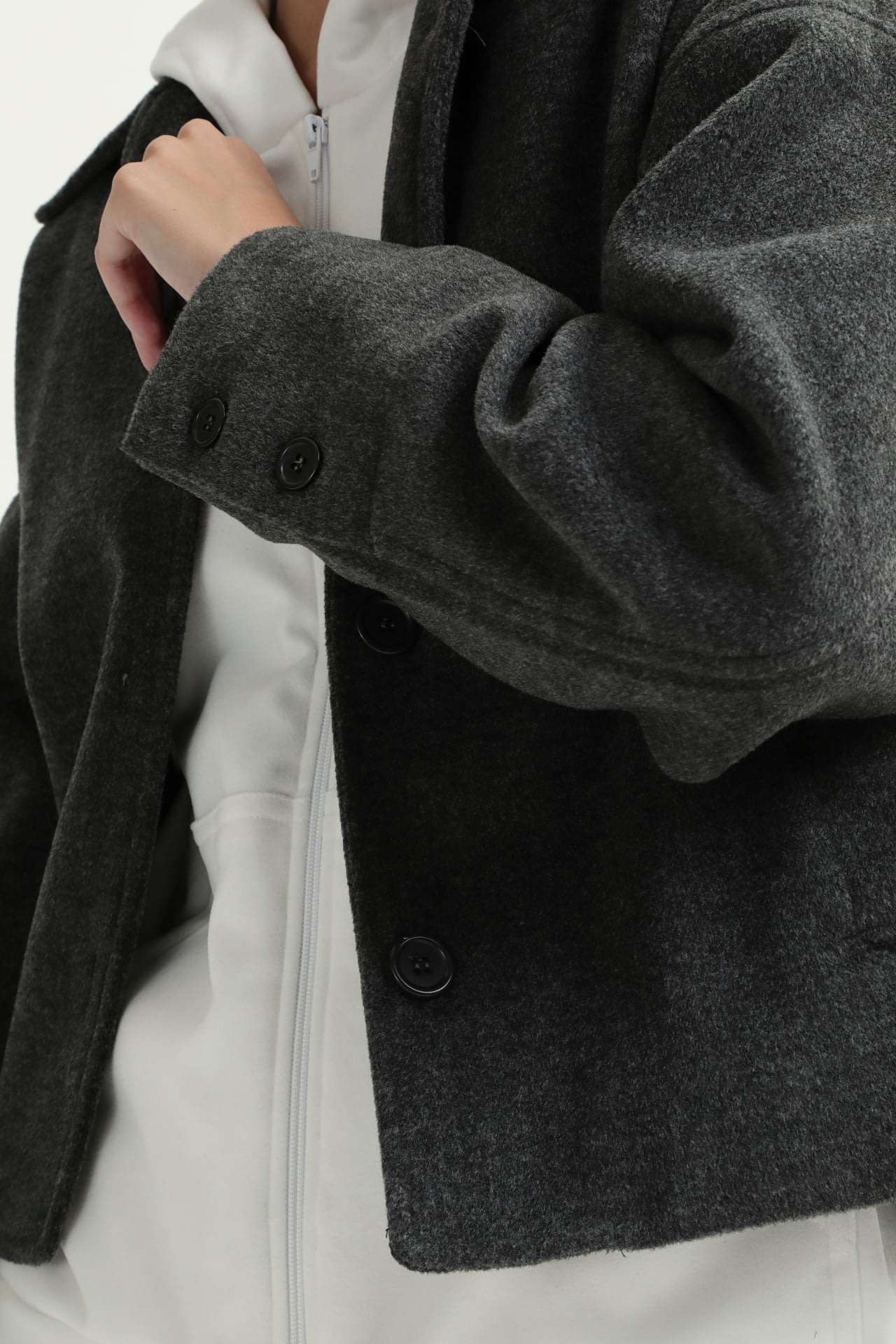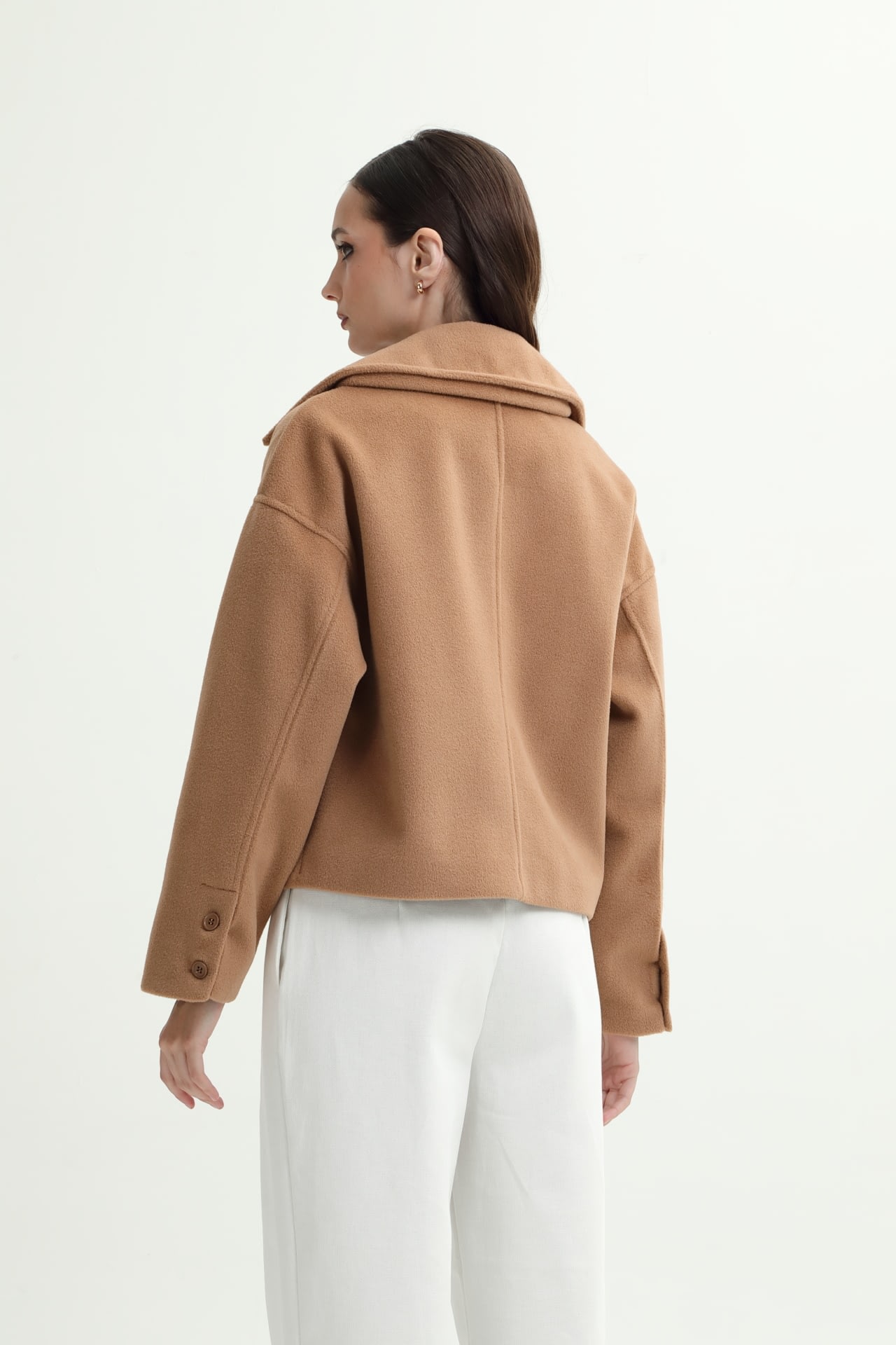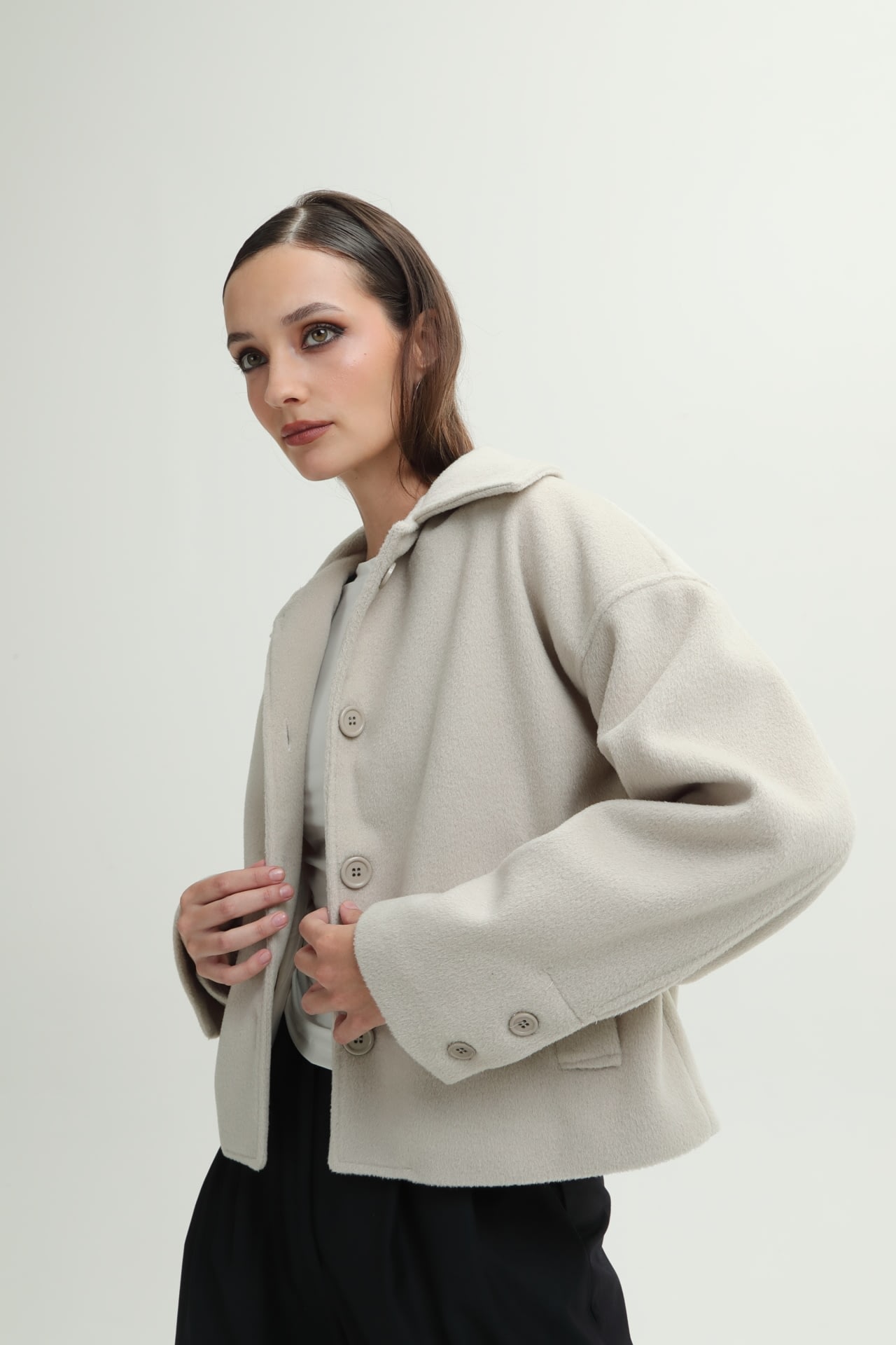 Campera de paño con botones en puño y frontales, y bolsillos laterales.