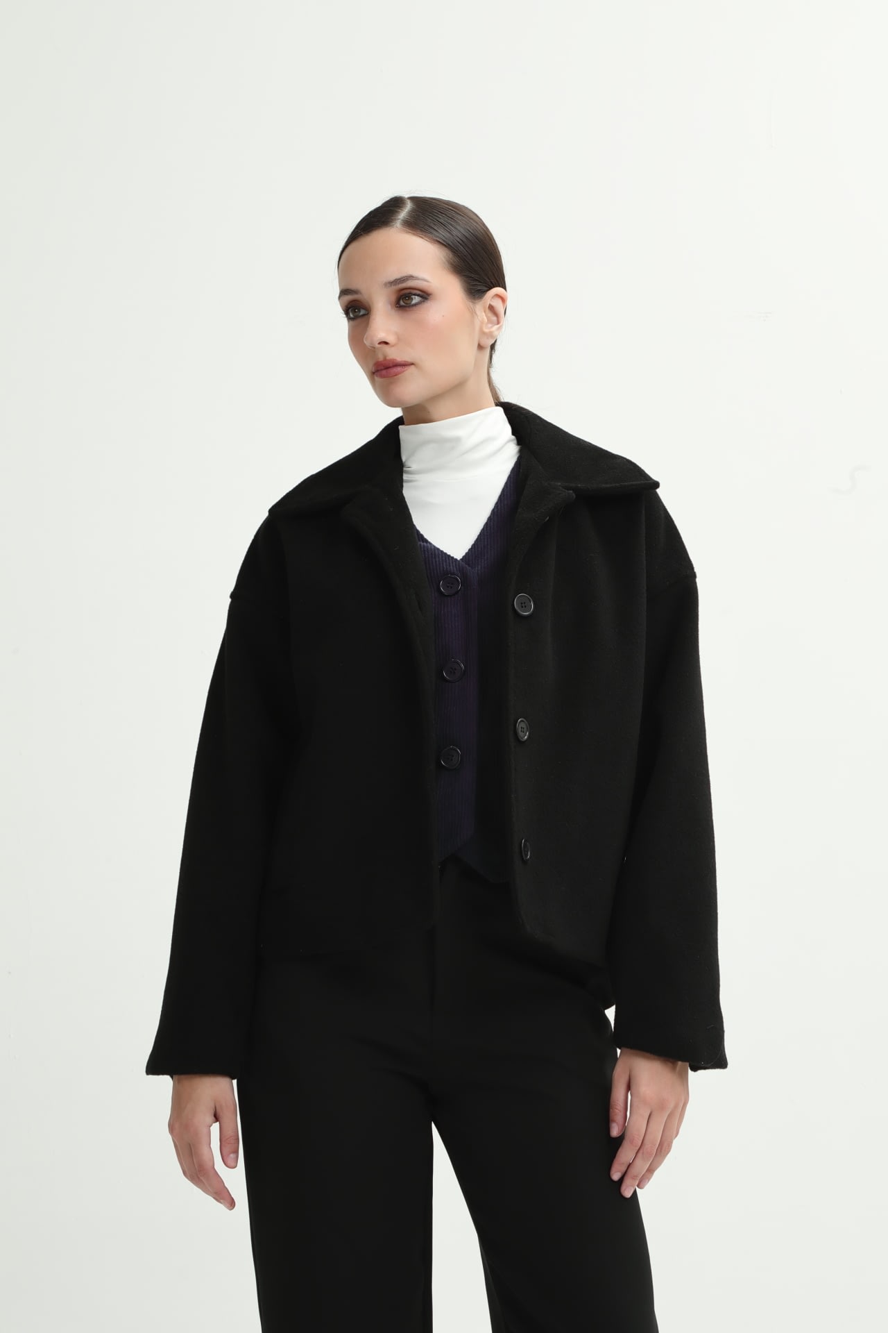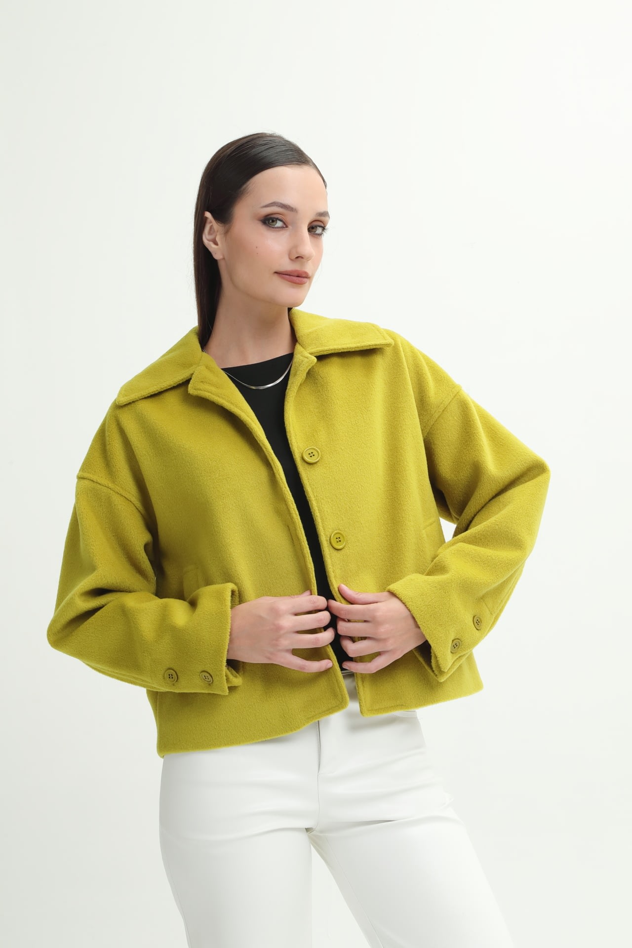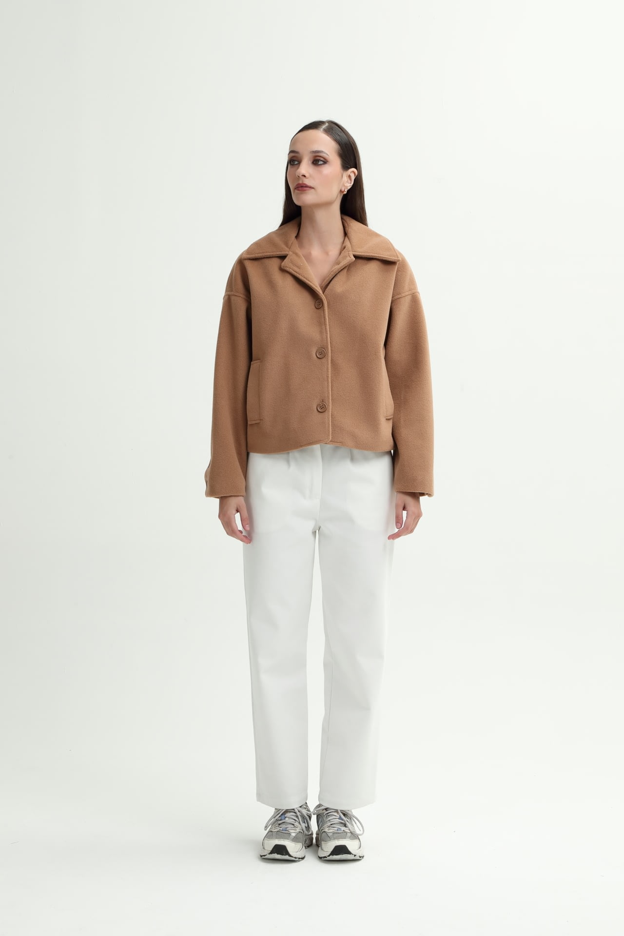 Campera de paño con botones en puño y frontales, y bolsillos laterales.