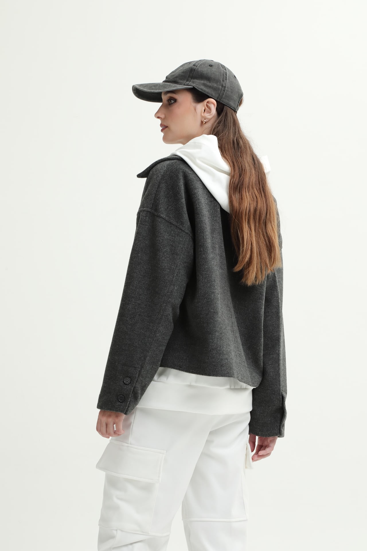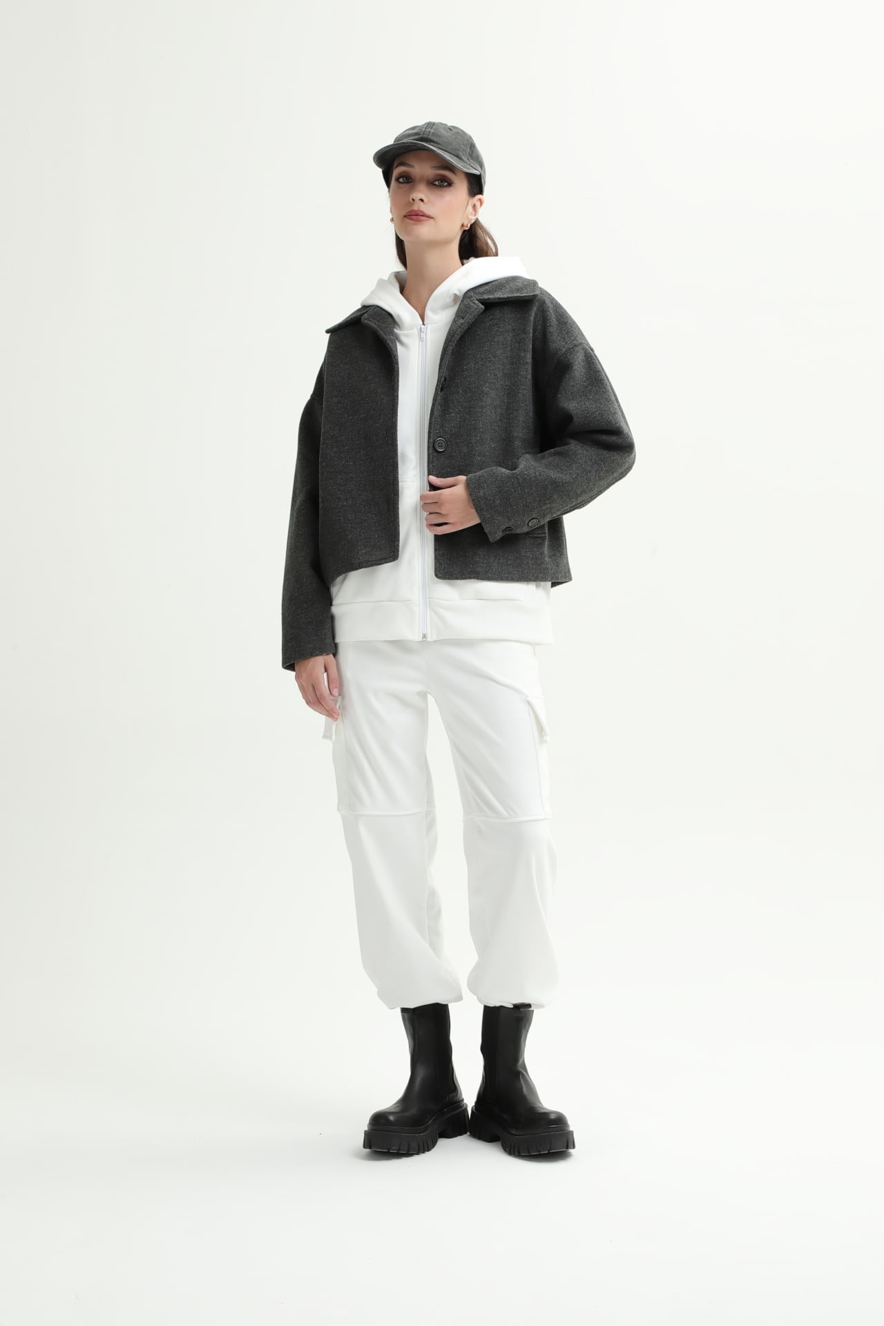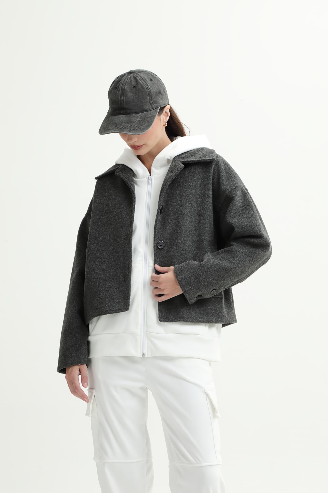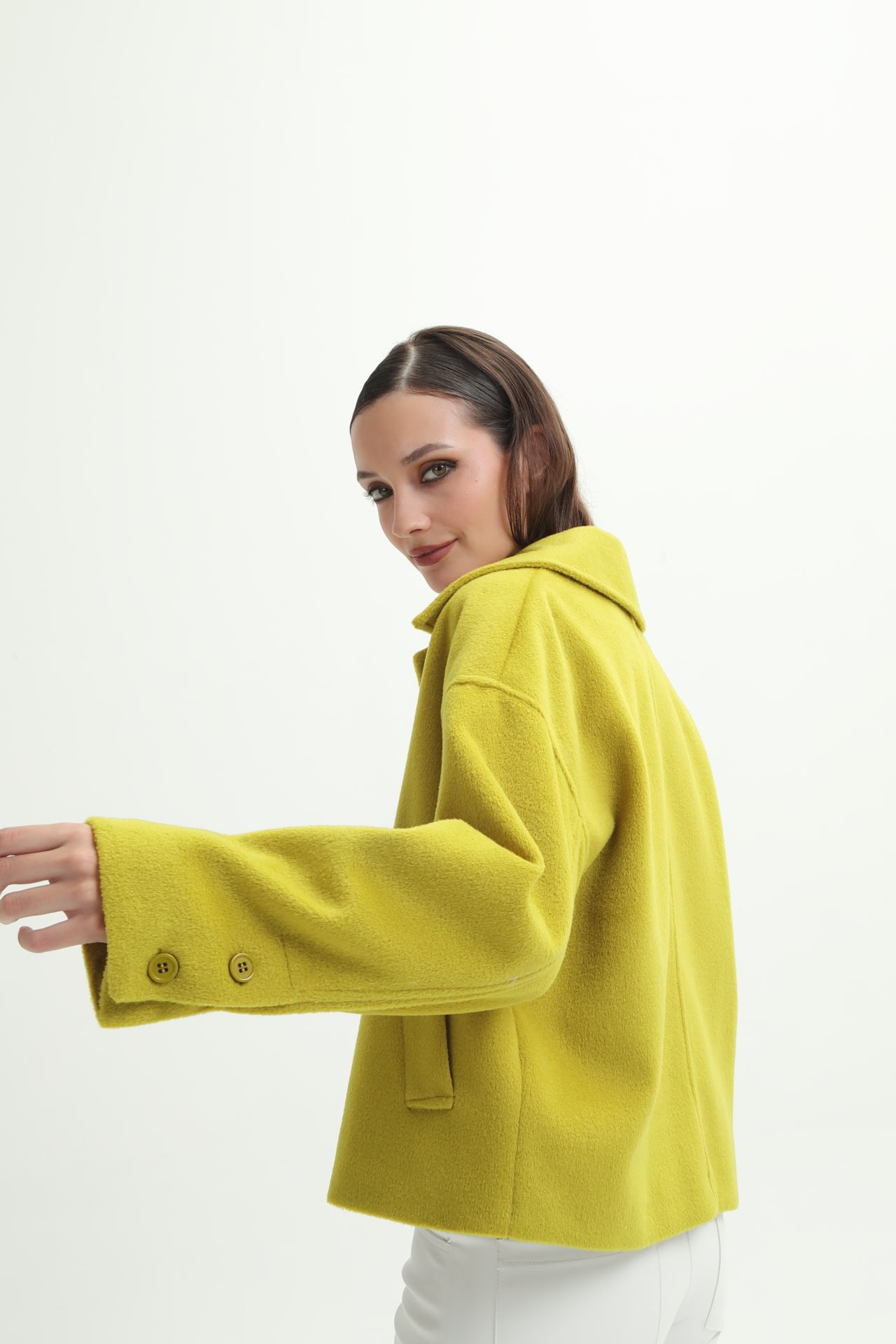Campera de paño con botones en puño y frontales, y bolsillos laterales.