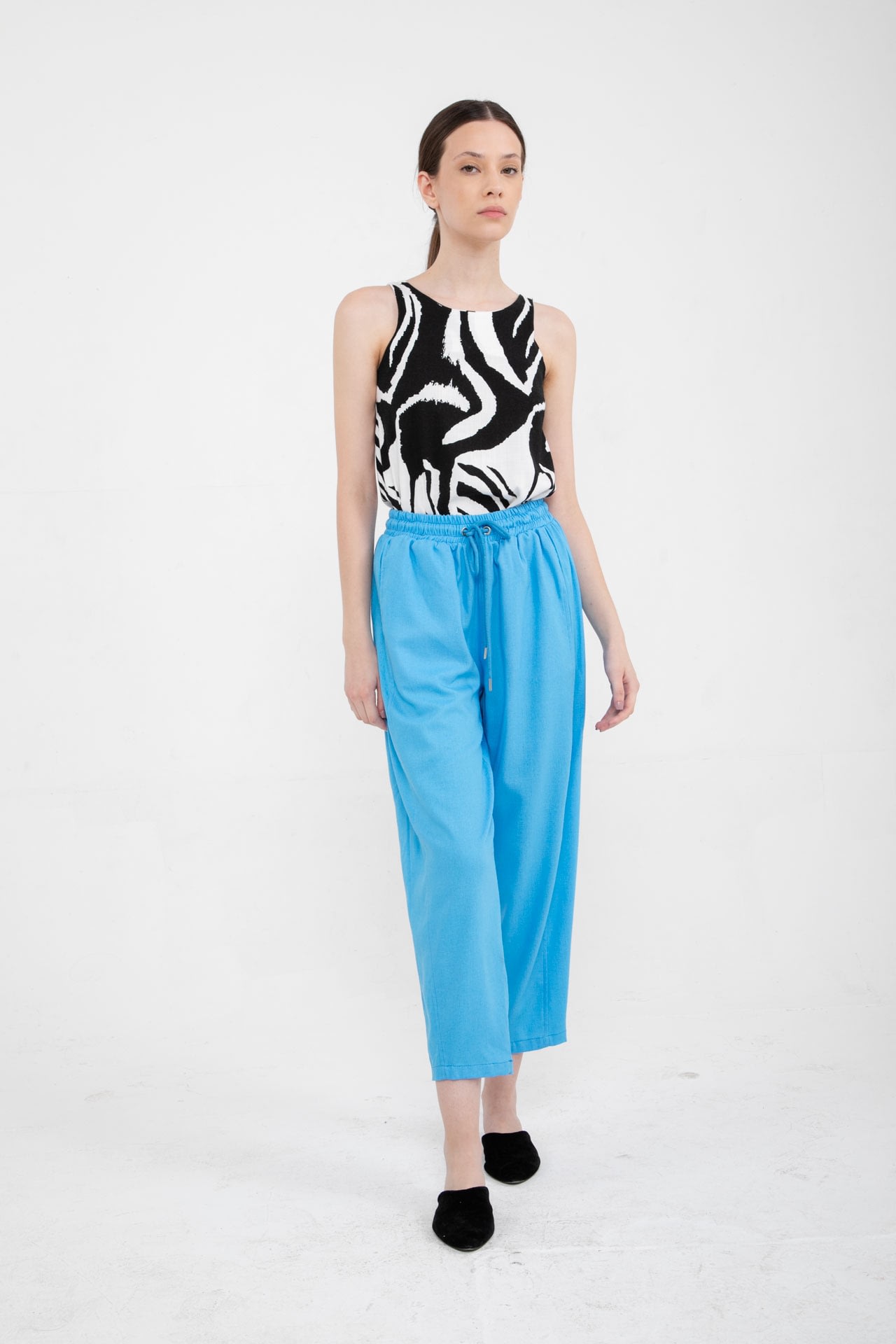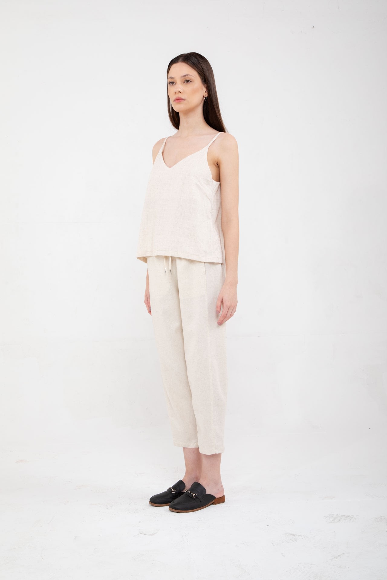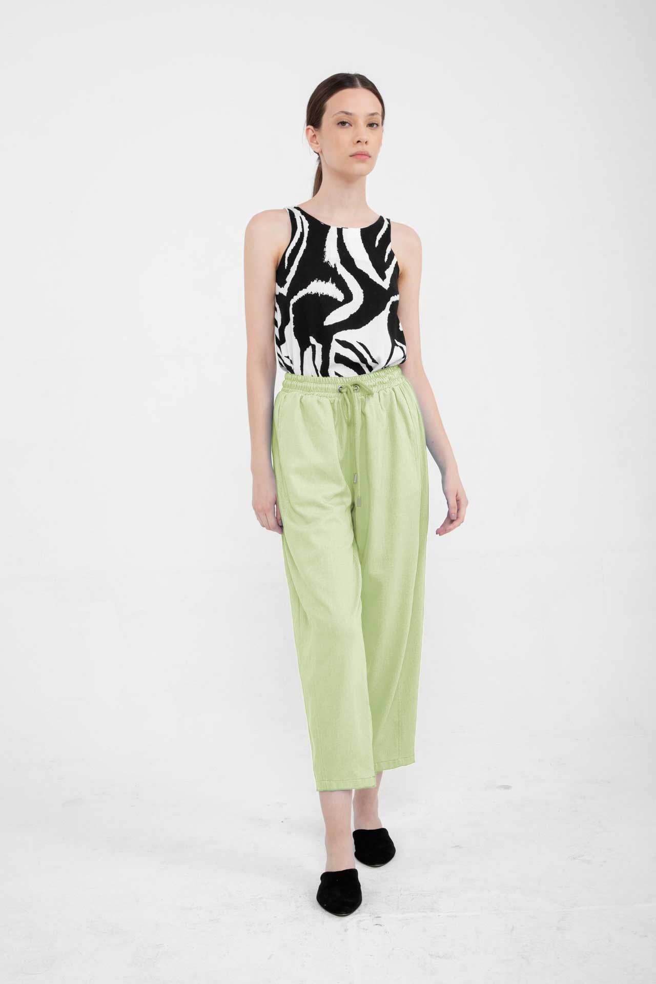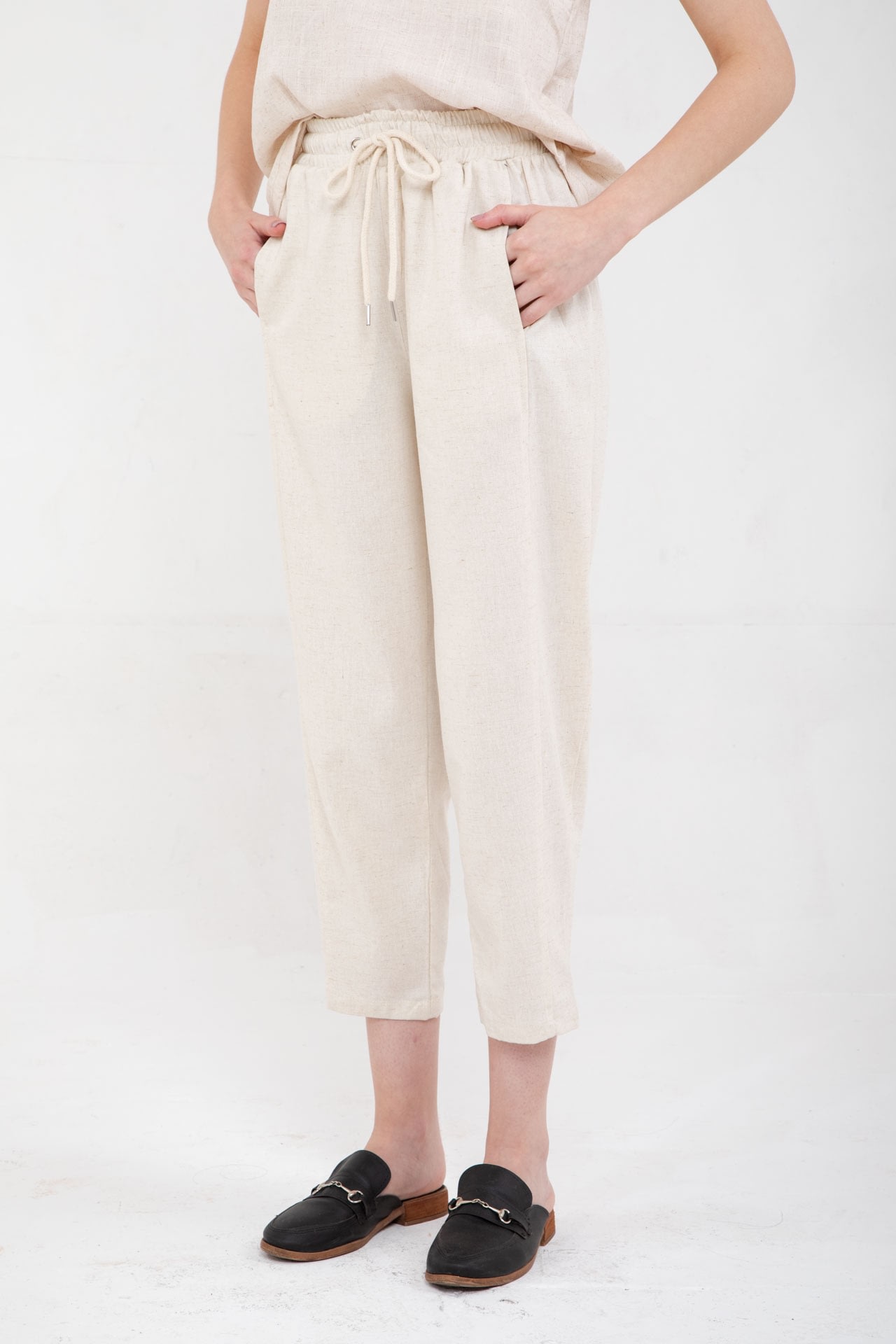 Pantalon de lino con elástico en la cintura, cordón ajustable y bolsillos en los laterales.