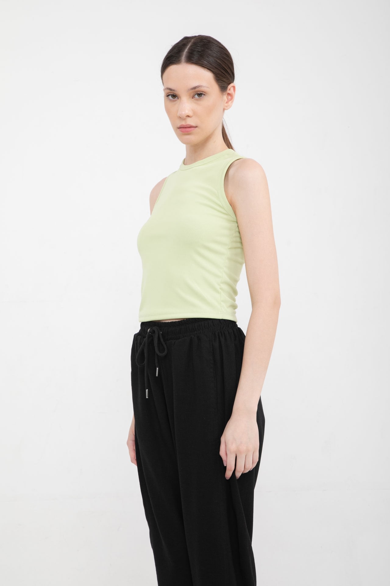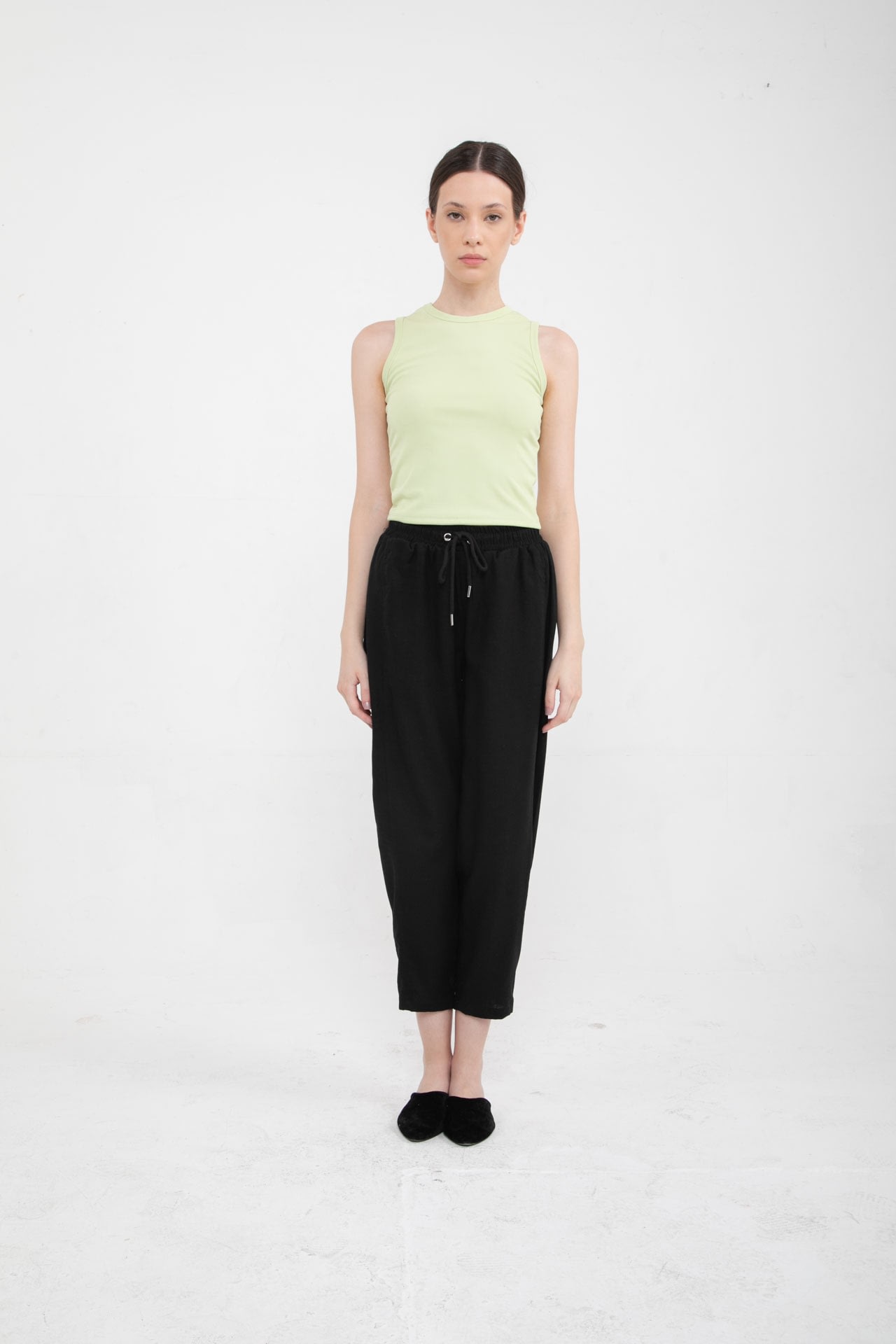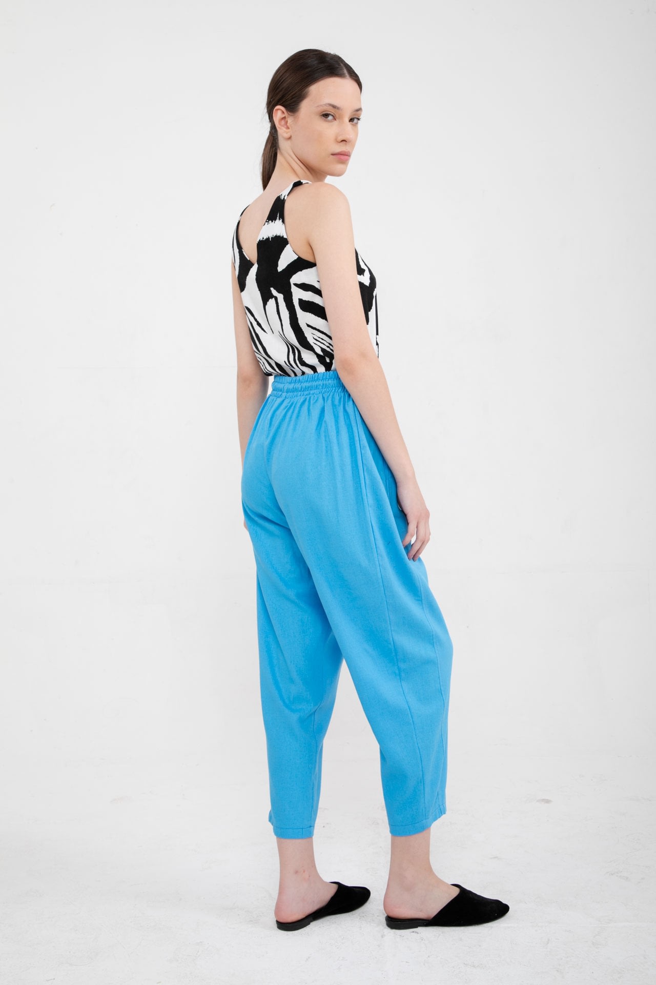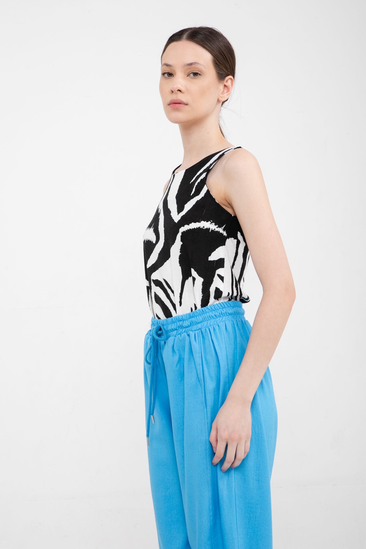 Pantalon de lino con elástico en la cintura, cordón ajustable y bolsillos en los laterales.