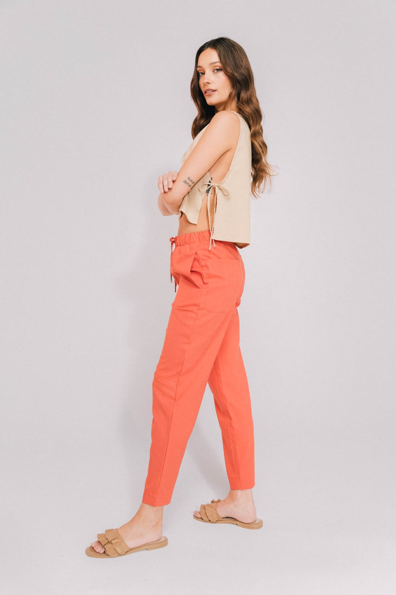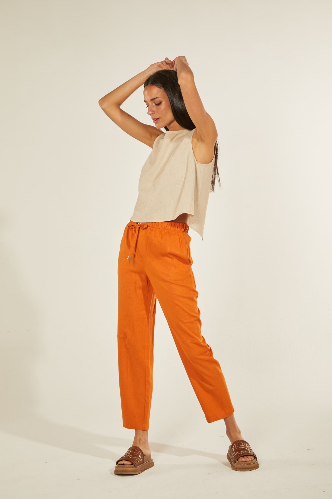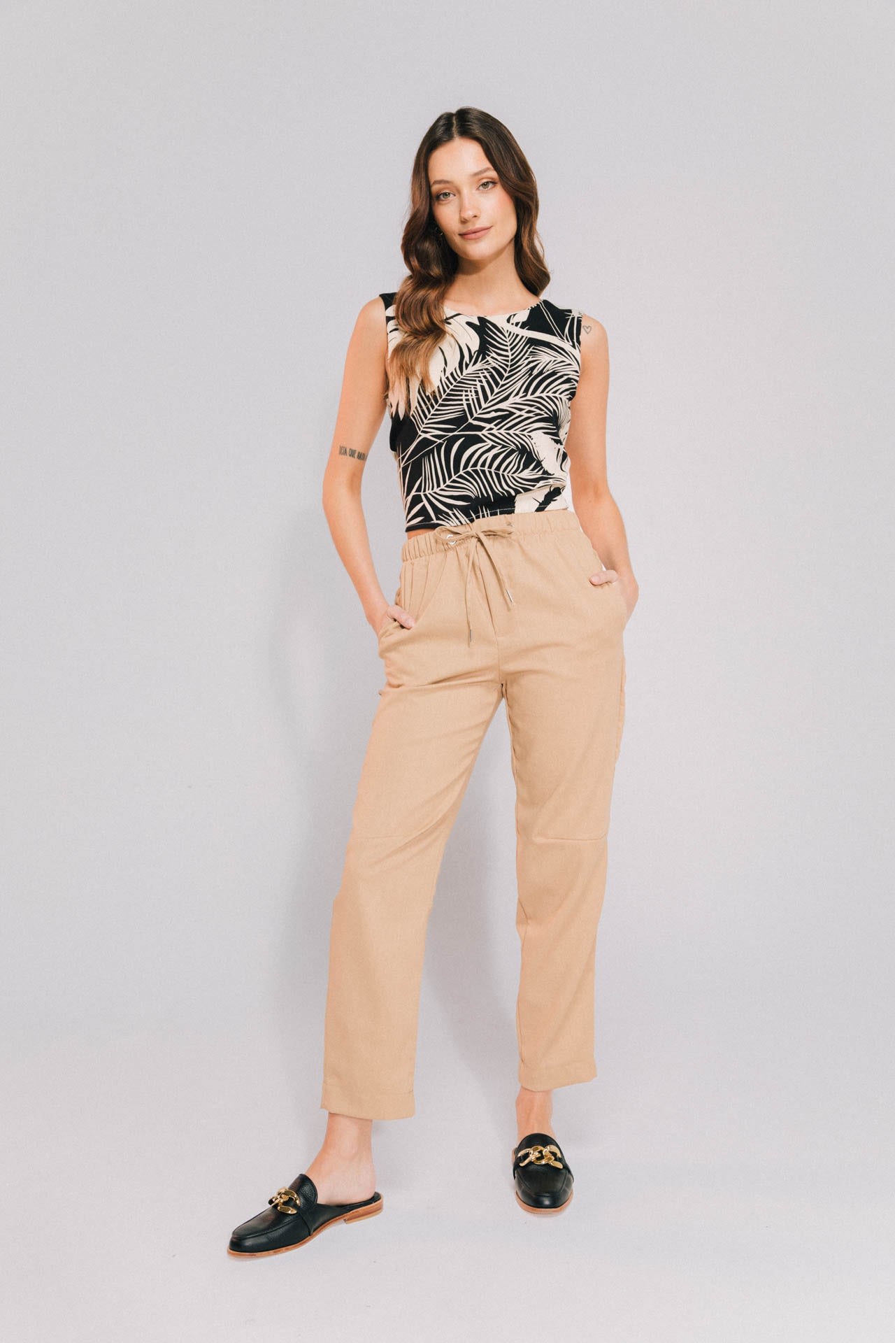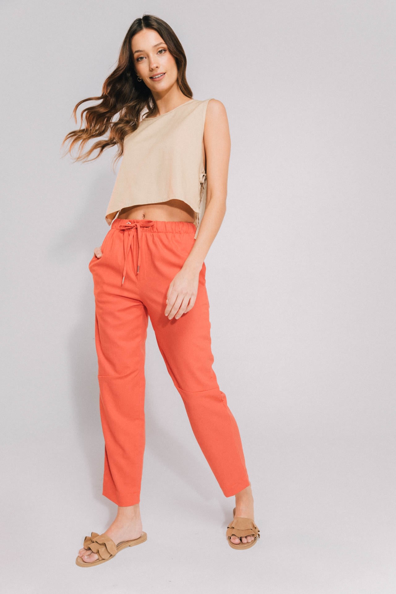 Pantalón jogger de lino sastrero con cordon ajustable y bolsillos traseros y laterales.