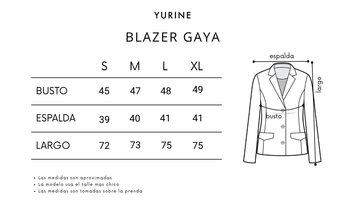 Blazer sastrero premium (79% poliester 16% rayon 5% elastano) con dos botones horizontales, forrado, con hombreras y bolsillos reales.