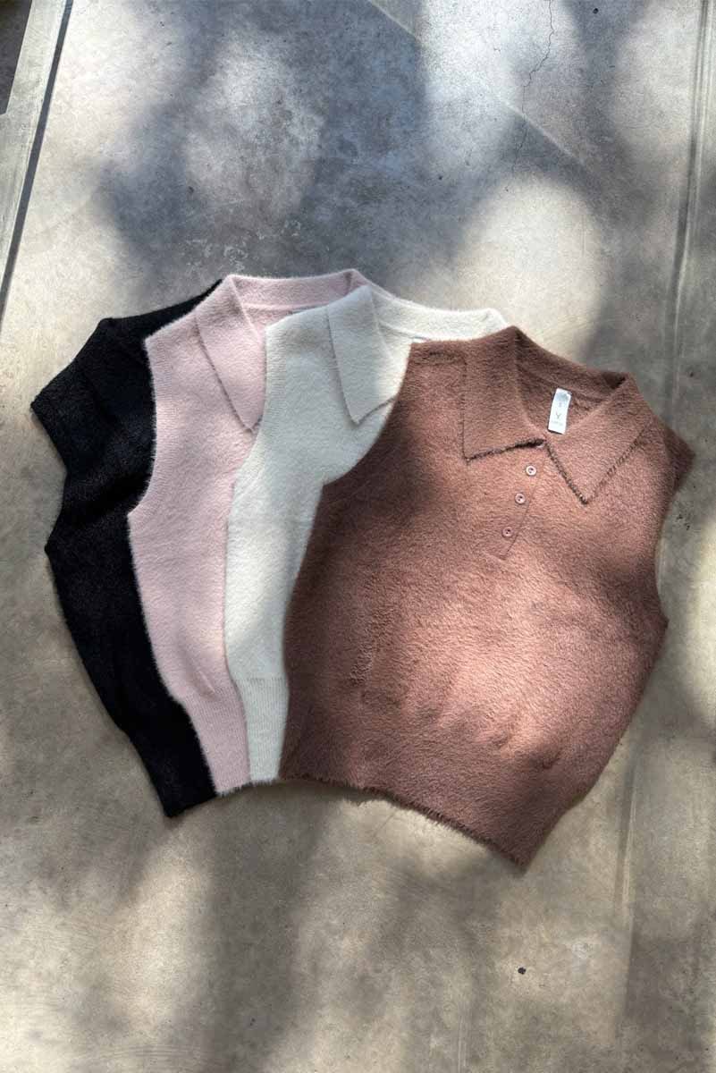 Chaleco de hilo (100% nylon) con cuello polo, 4 botones al tono y de calce entallado en la cintura.