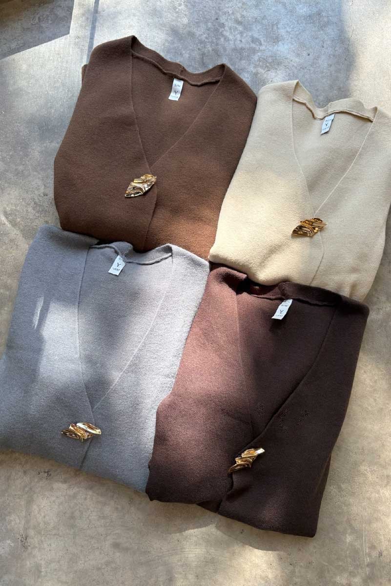 Saco tejido (52% acrilico 28% nylon 20% pbt), manga larga acampanada, con lazo y broche.