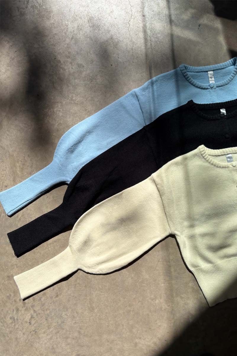 Sweater tejido (42% acrilico 28% nylon 30% pbt) cuello redondo, con botones al tono y manga estilo globo con terminacion entallada.