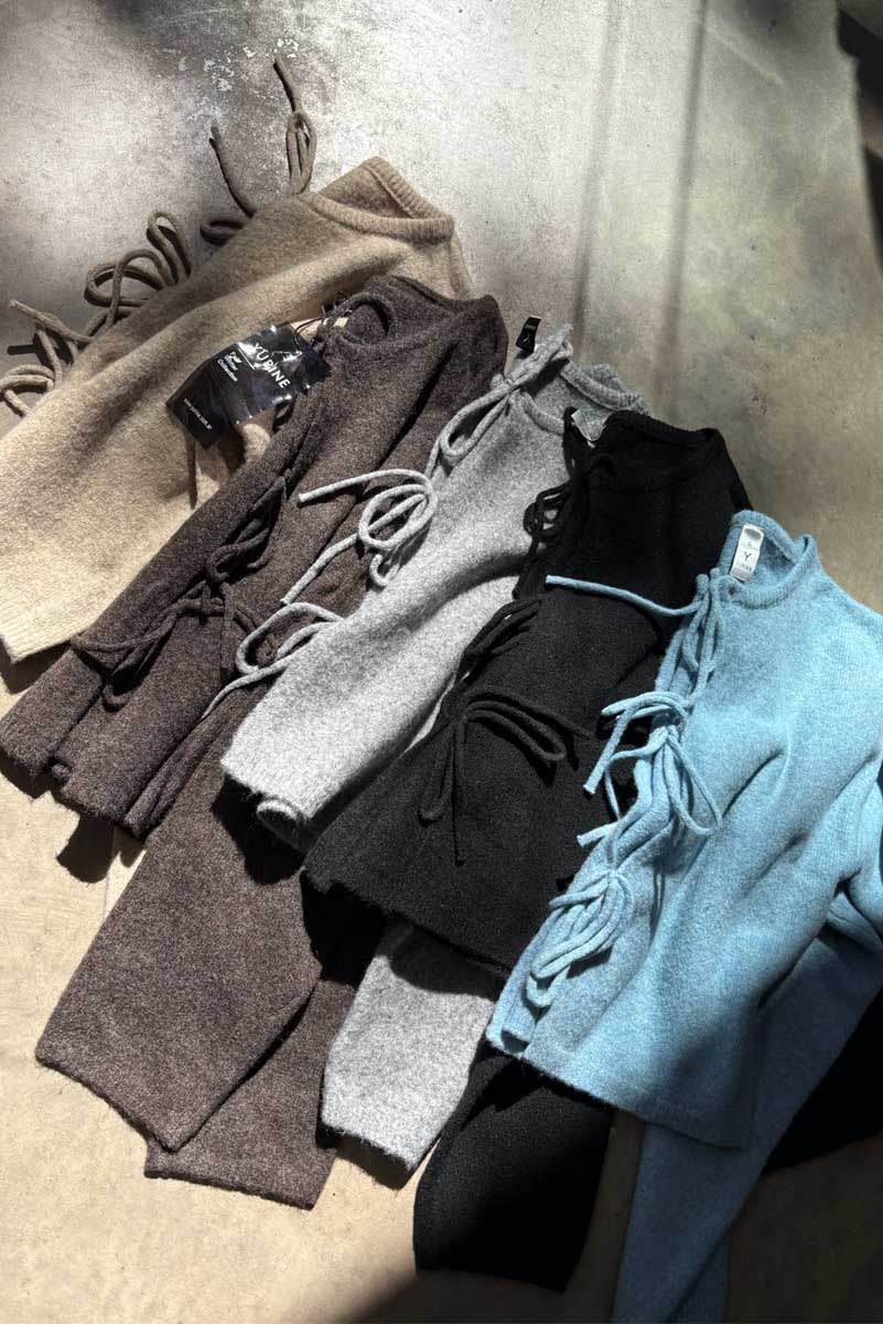 Sweater de hilo (58% recilado 15% nylon 15% acrilico 8% algodón y 4% elastano) abierto con 3 lazos delateros, de largo hasta cintura, manga larga.
