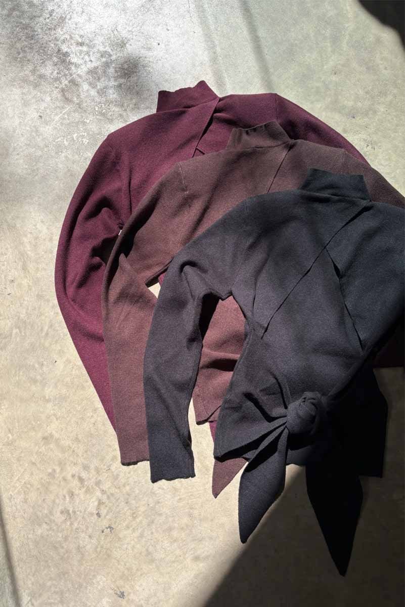Media polera tejida (49.3% viscosa 27%.7 nylon y 23% pbt) manga larga, con hombreras y espalda descubierta.