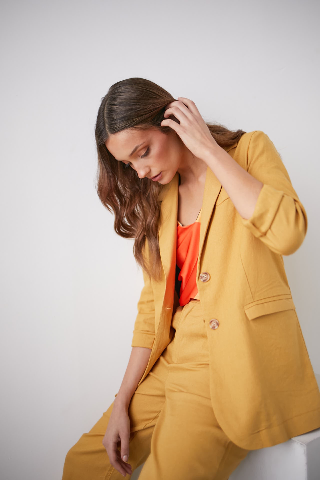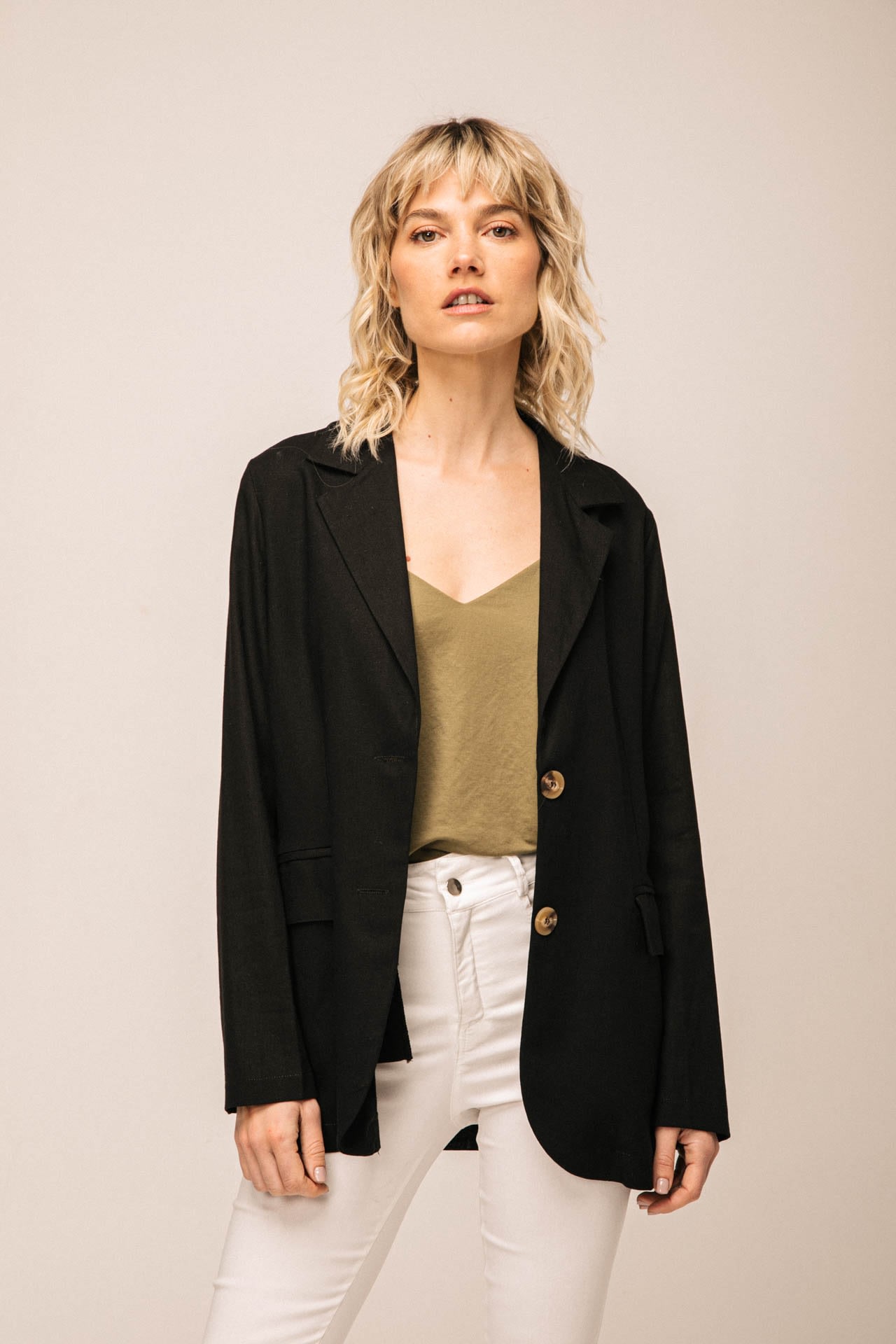 Blazer de lino sastrero con bolsillos delanteros y botones marmolados.