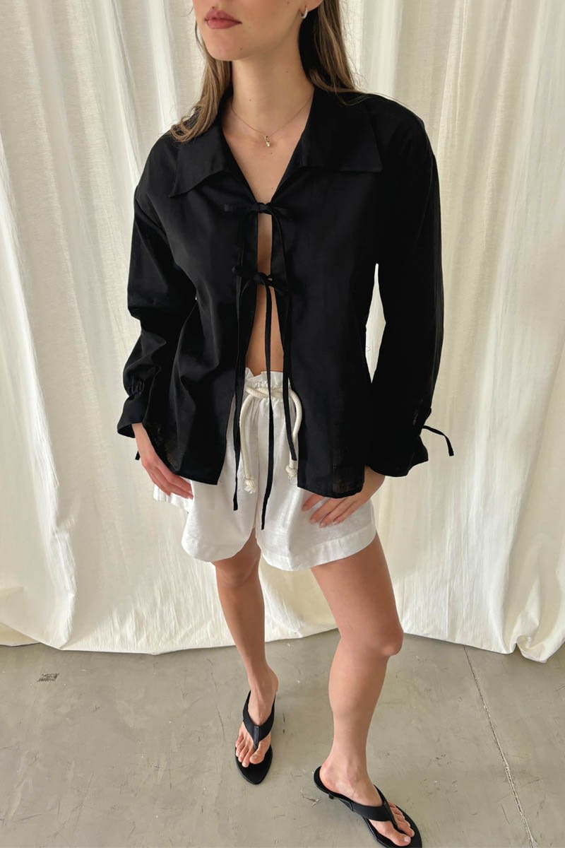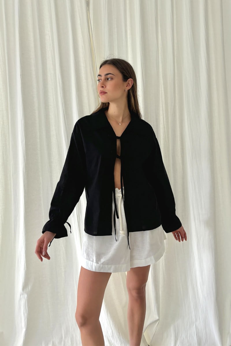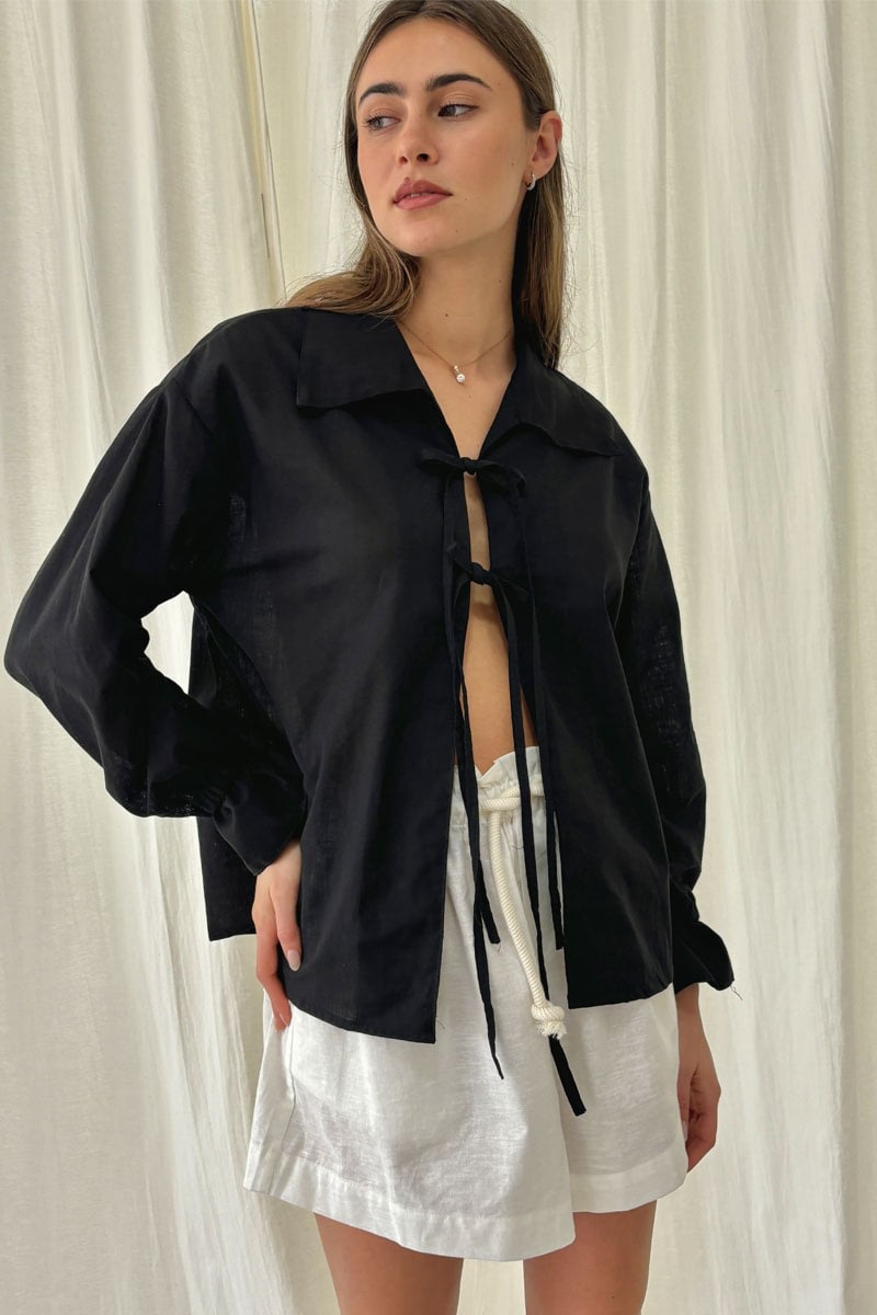 Camisa con lazo delantero y en puños. Diseño suelto y femenino con cuello amplio y textura natural. 100% COTTON