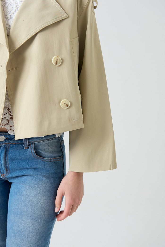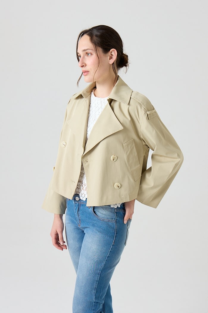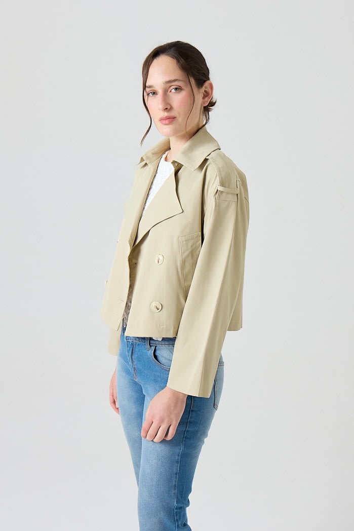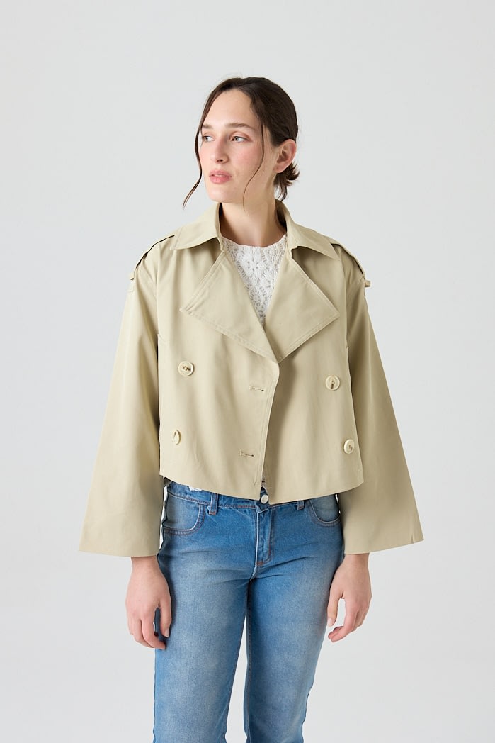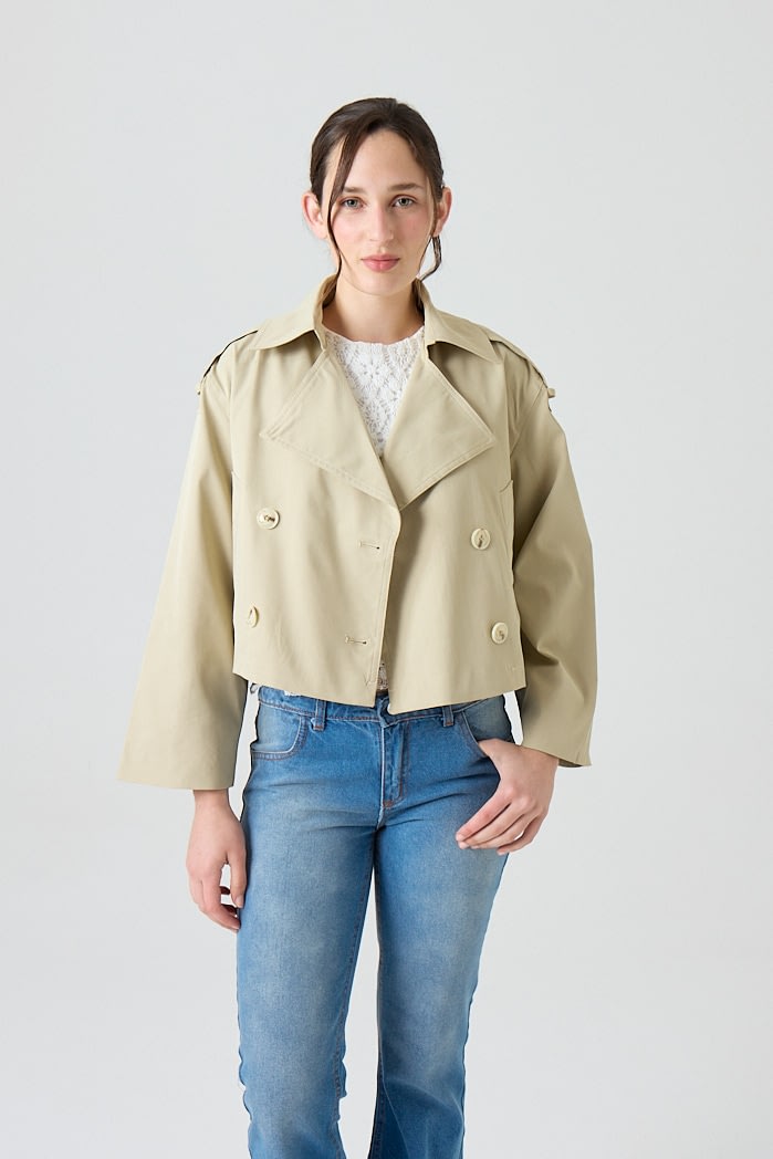 Campera corta estilo trench con cuello amplio y cierre cruzado de doble abotonadura. Diseño relajado con hombreras decorativas y mangas rectas.98% Poliester 2% Elastano
