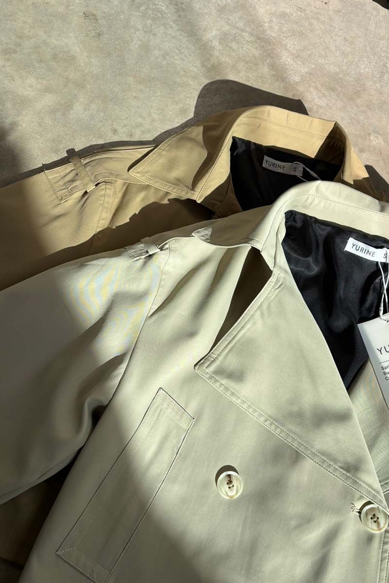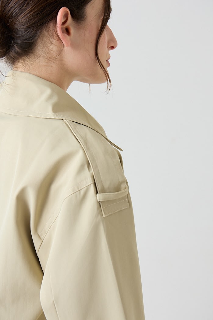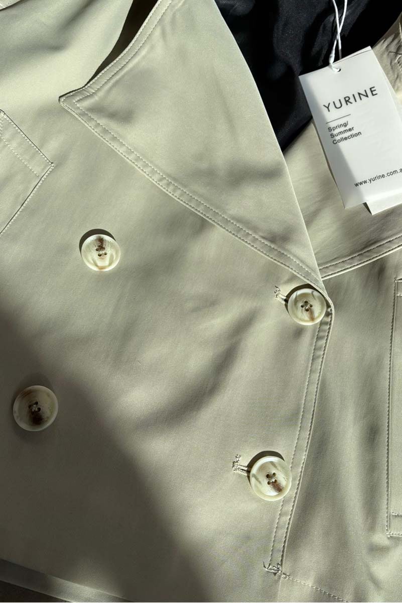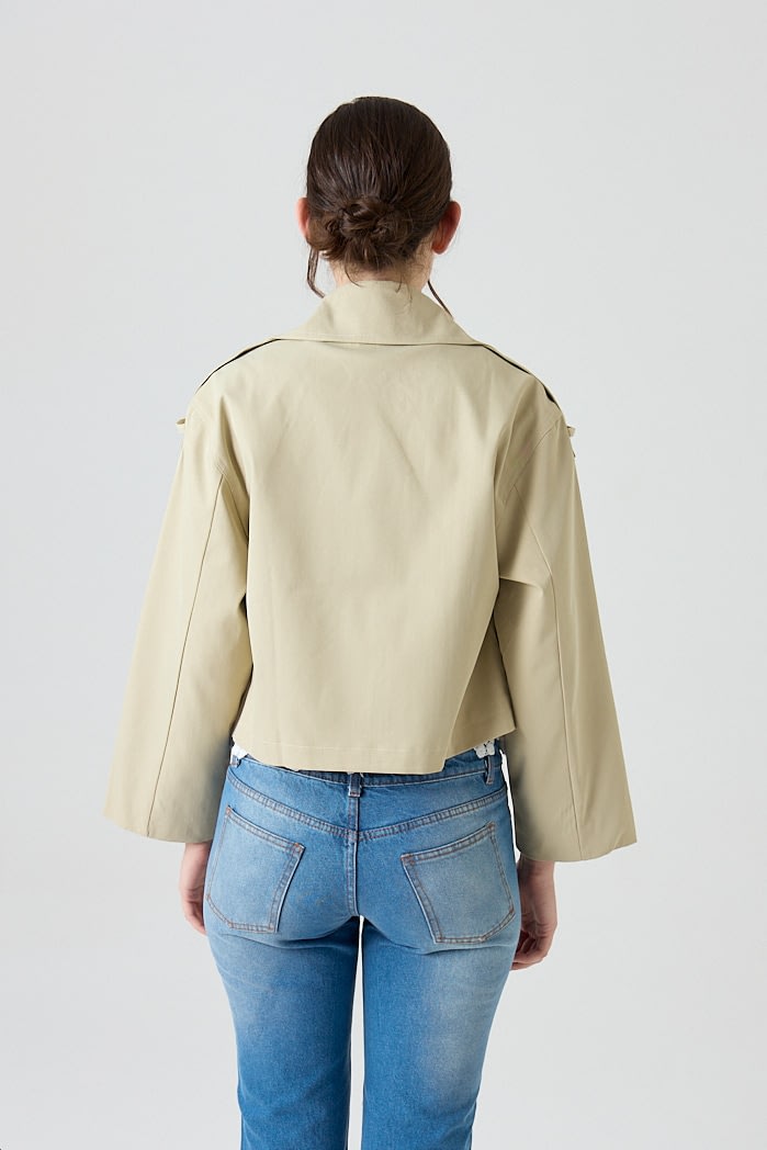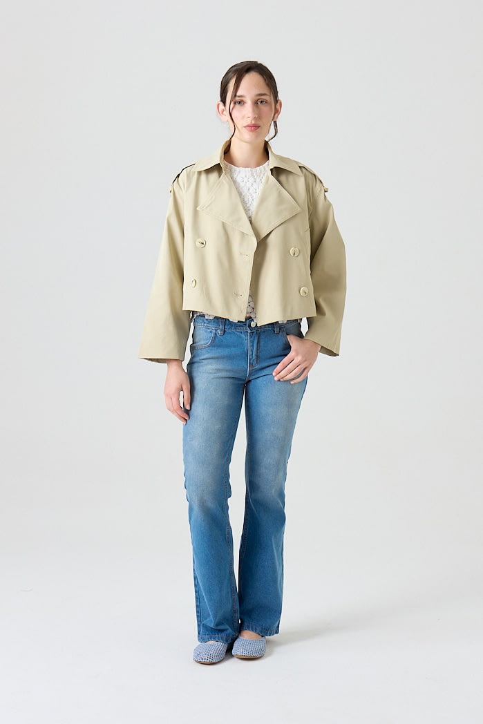 Campera corta estilo trench con cuello amplio y cierre cruzado de doble abotonadura. Diseño relajado con hombreras decorativas y mangas rectas.98% Poliester 2% Elastano