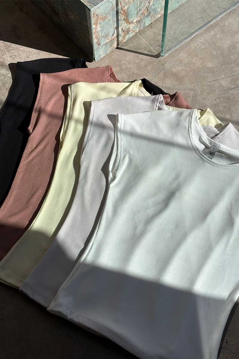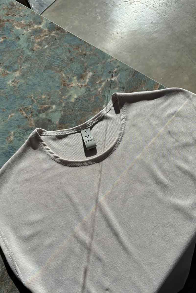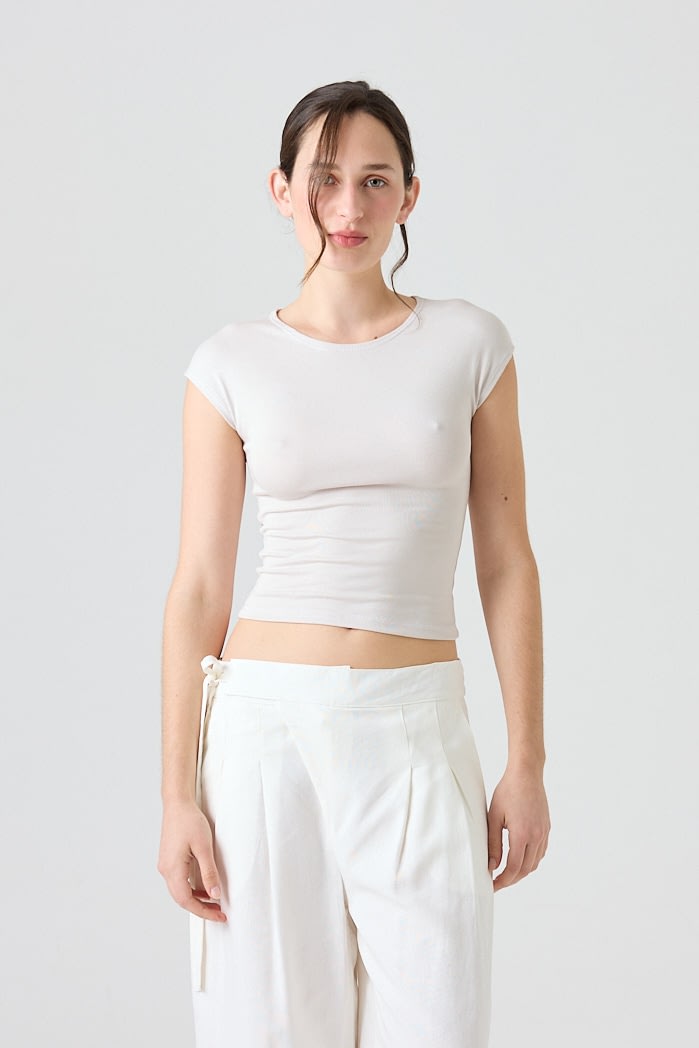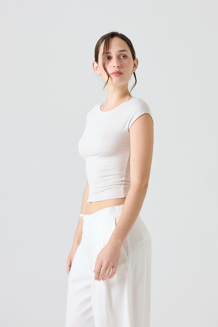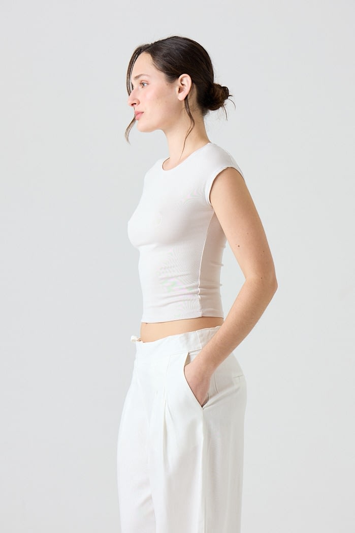 top de rib, corte recoto con cuello redondo cerrado y hombros ligeramente extendidos