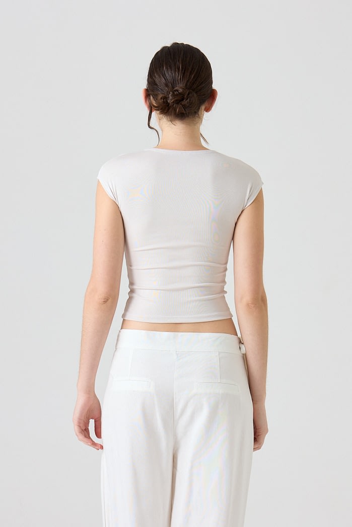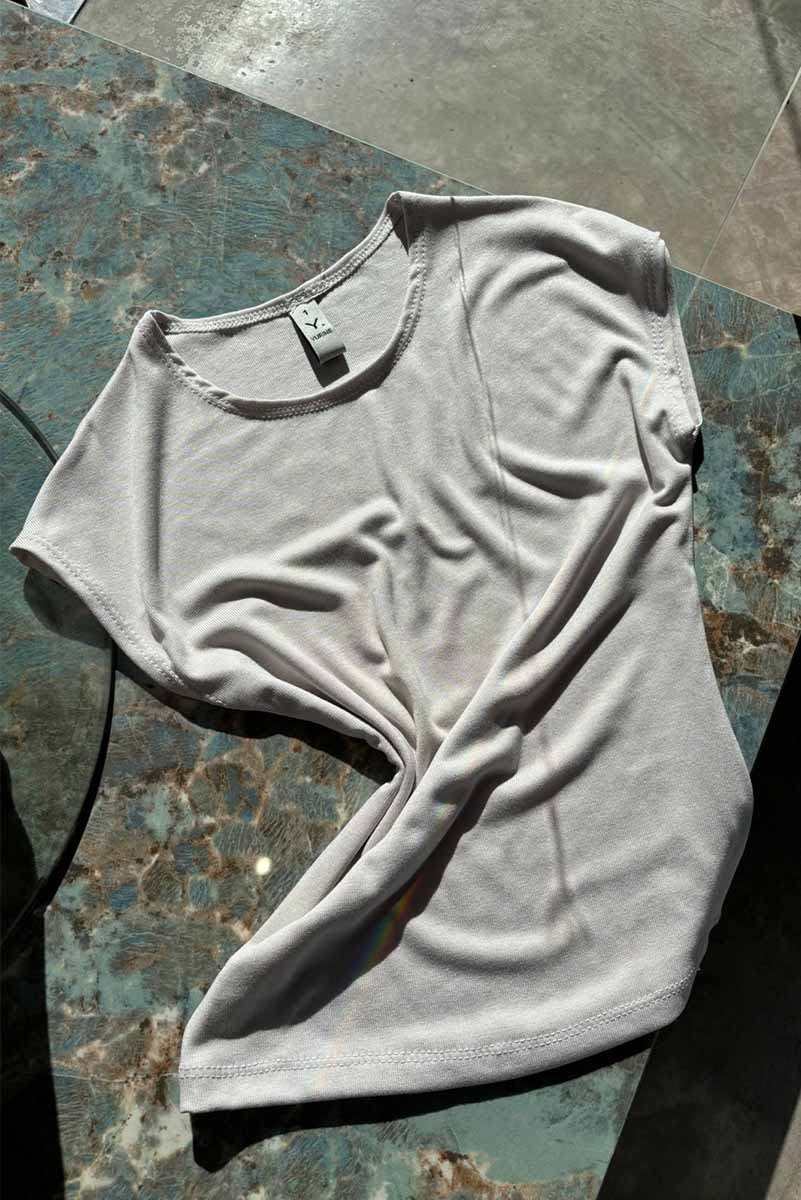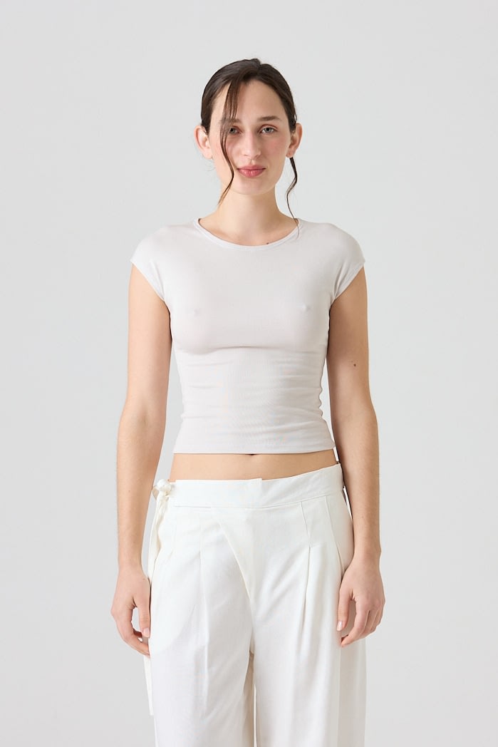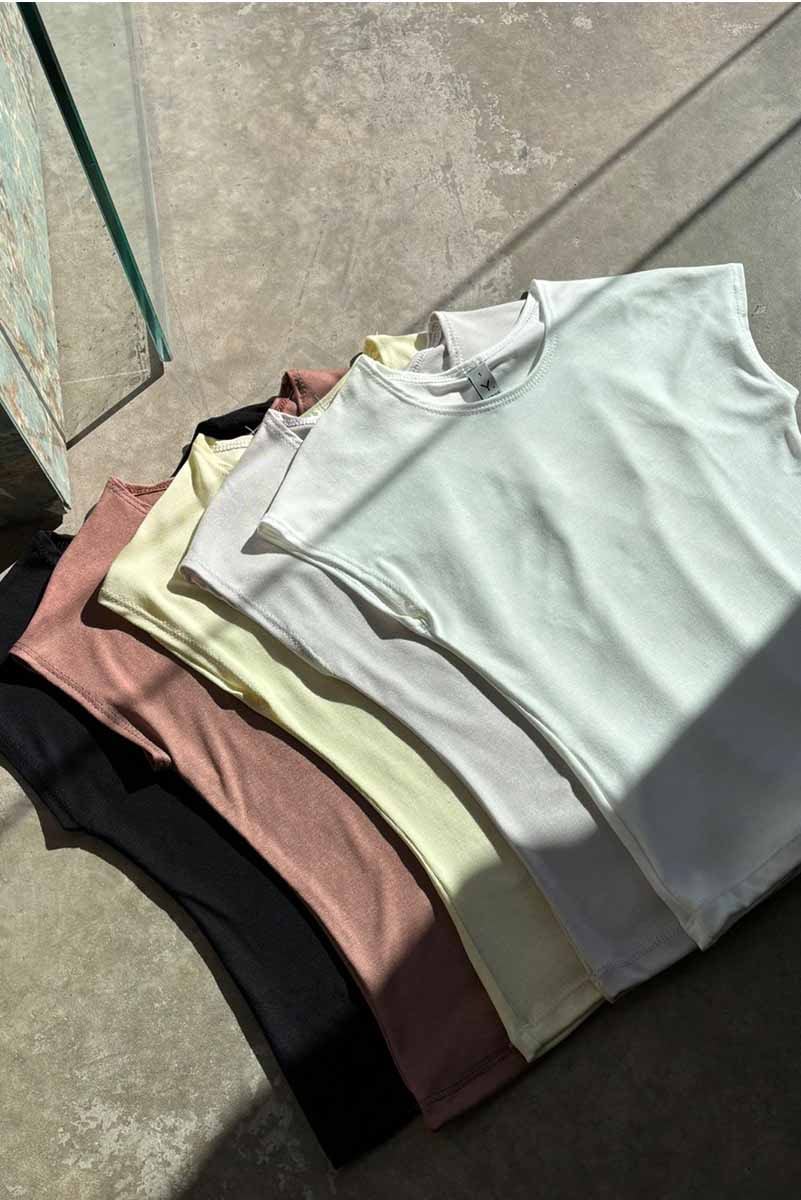 top de rib, corte recoto con cuello redondo cerrado y hombros ligeramente extendidos