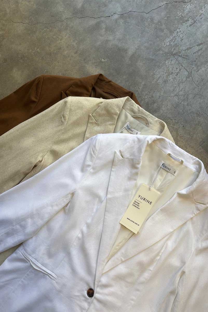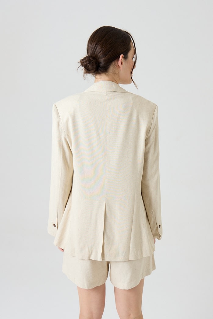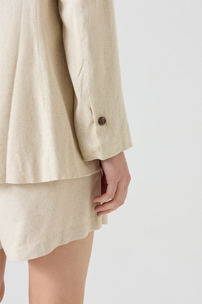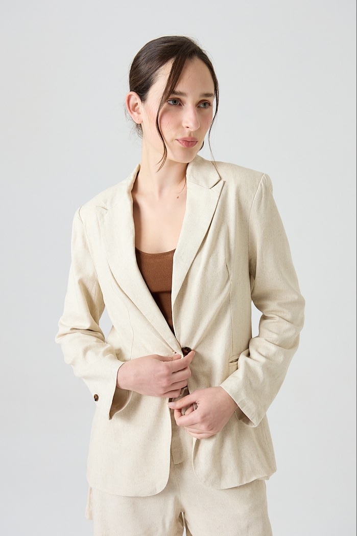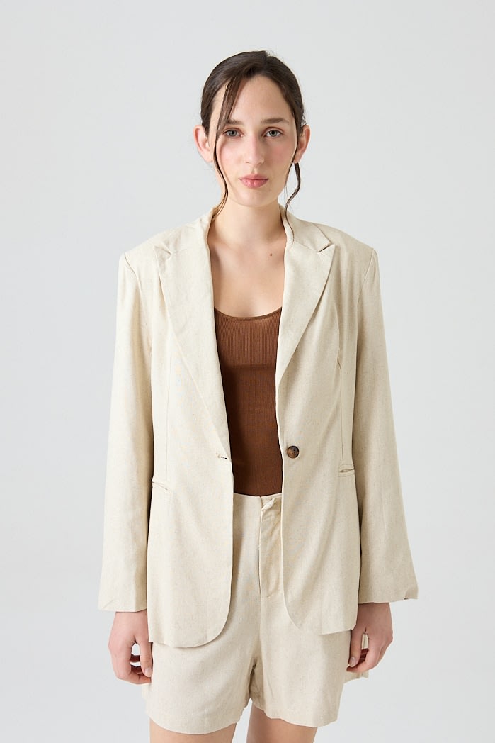 Blazer de lino con solapa clásica y cierre de un botón. Posee bolsillos delanteros y tajo en la parte posterior que aporta movimiento y comodidad.Composición: 70% Viscosa 30% Lino