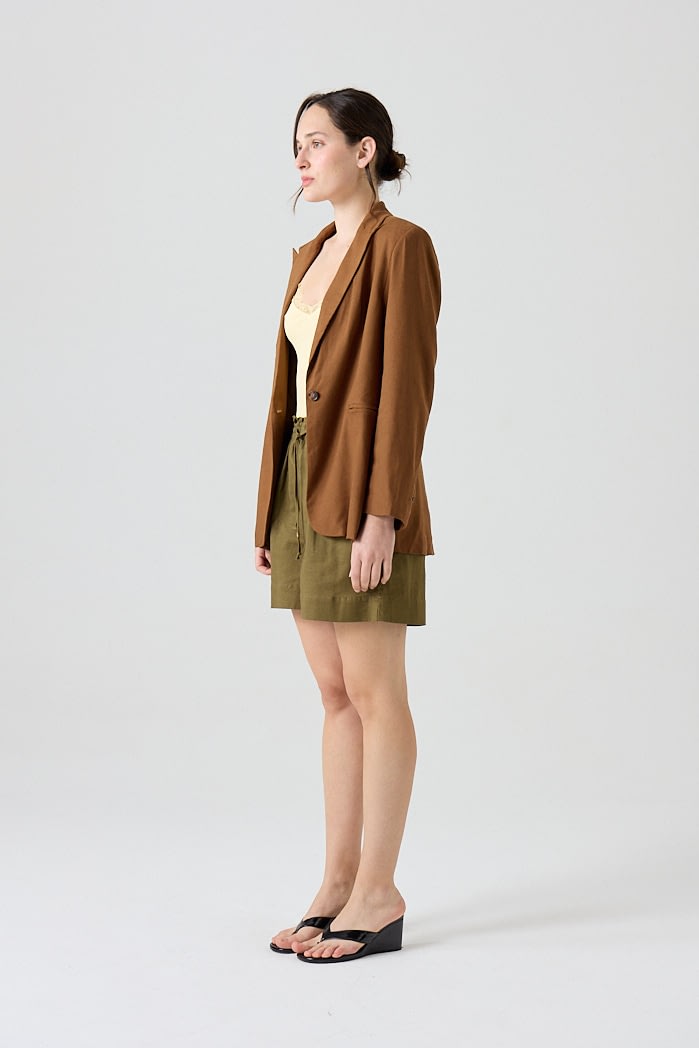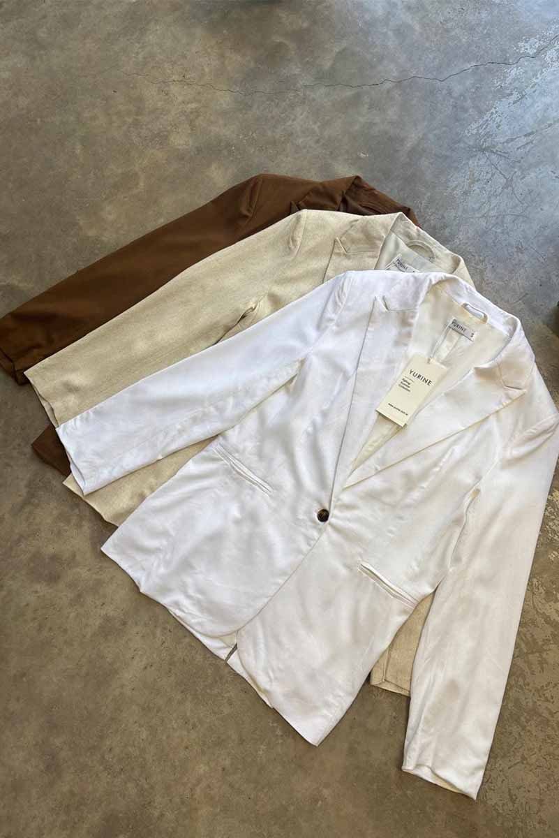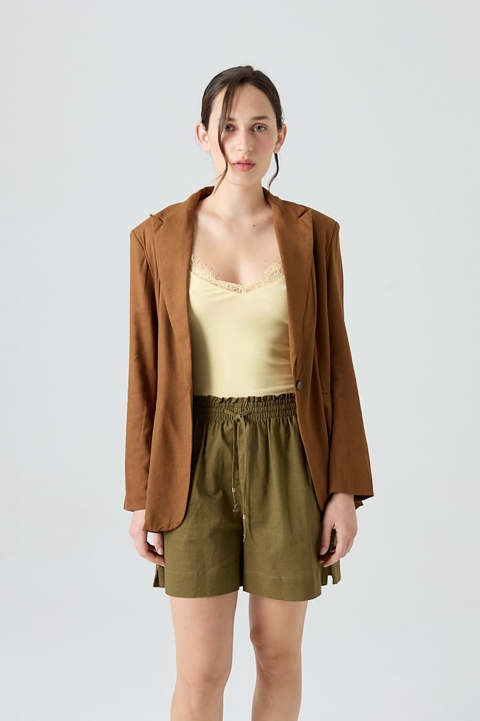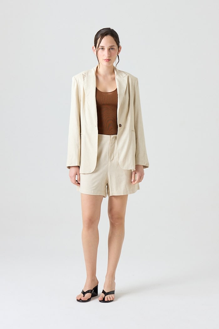 Blazer de lino con solapa clásica y cierre de un botón. Posee bolsillos delanteros y tajo en la parte posterior que aporta movimiento y comodidad.Composición: 70% Viscosa 30% Lino