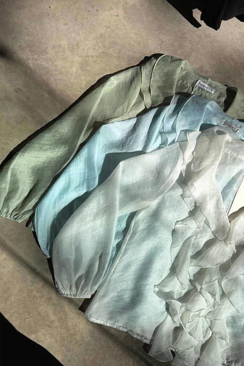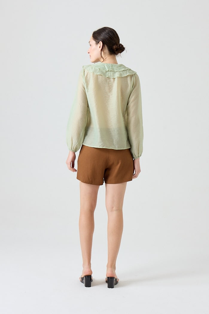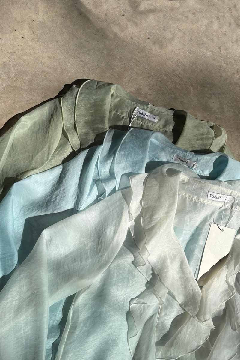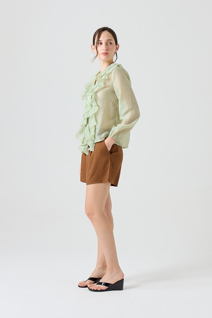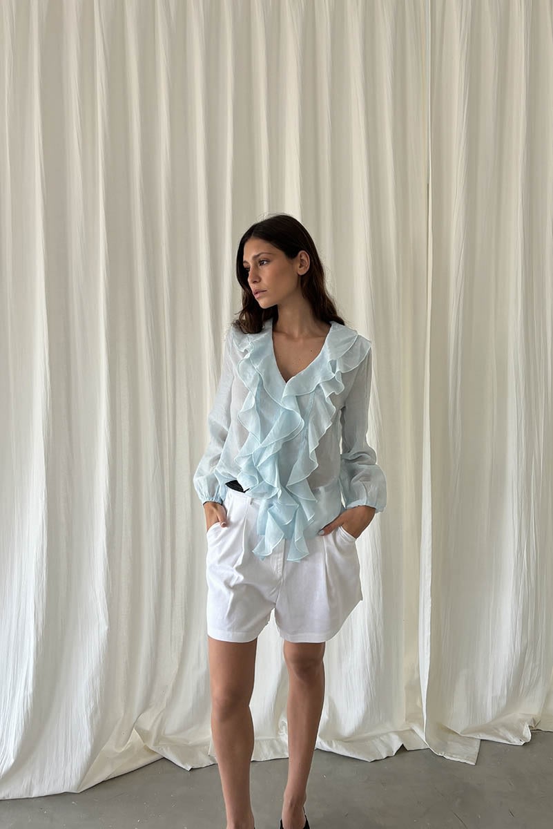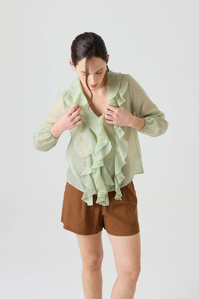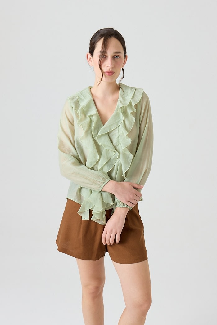 Blusa liviana de textura translúcida con volados en el frente y cuello en V. De manga larga con puños elásticos y caída fluida. Composicion: 80%tencel 20%nylon