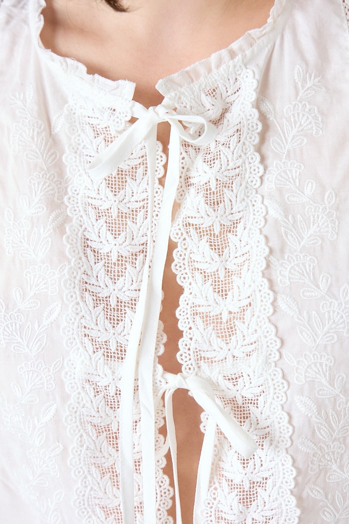 Blusa sin mangas de algodón con delicados bordados y apliques de encaje. Presenta lazos ajustables en el frente y escote redondeado. 100% COTTON