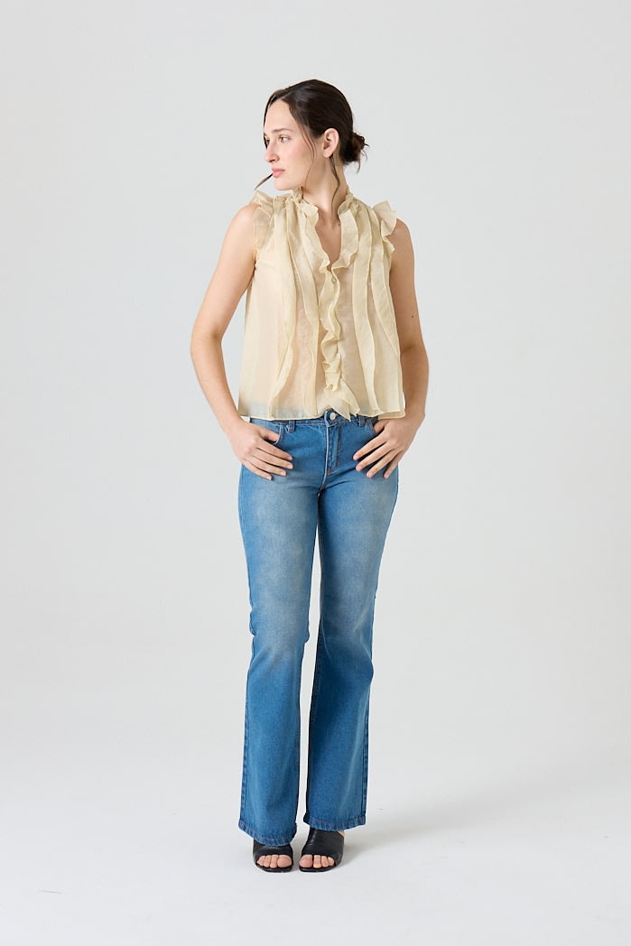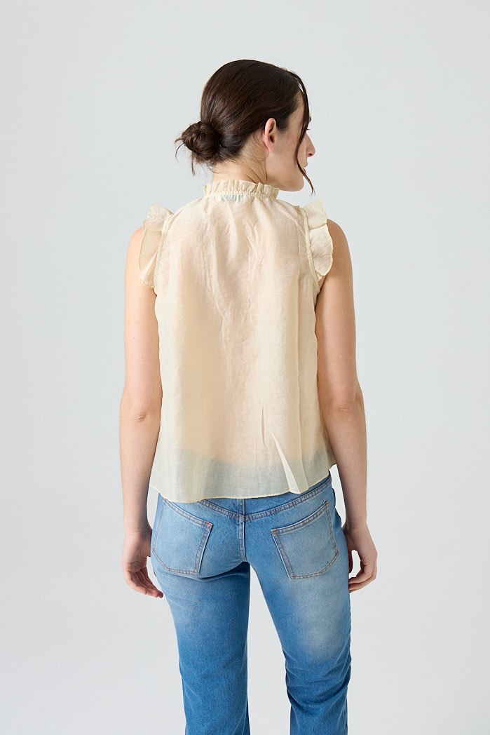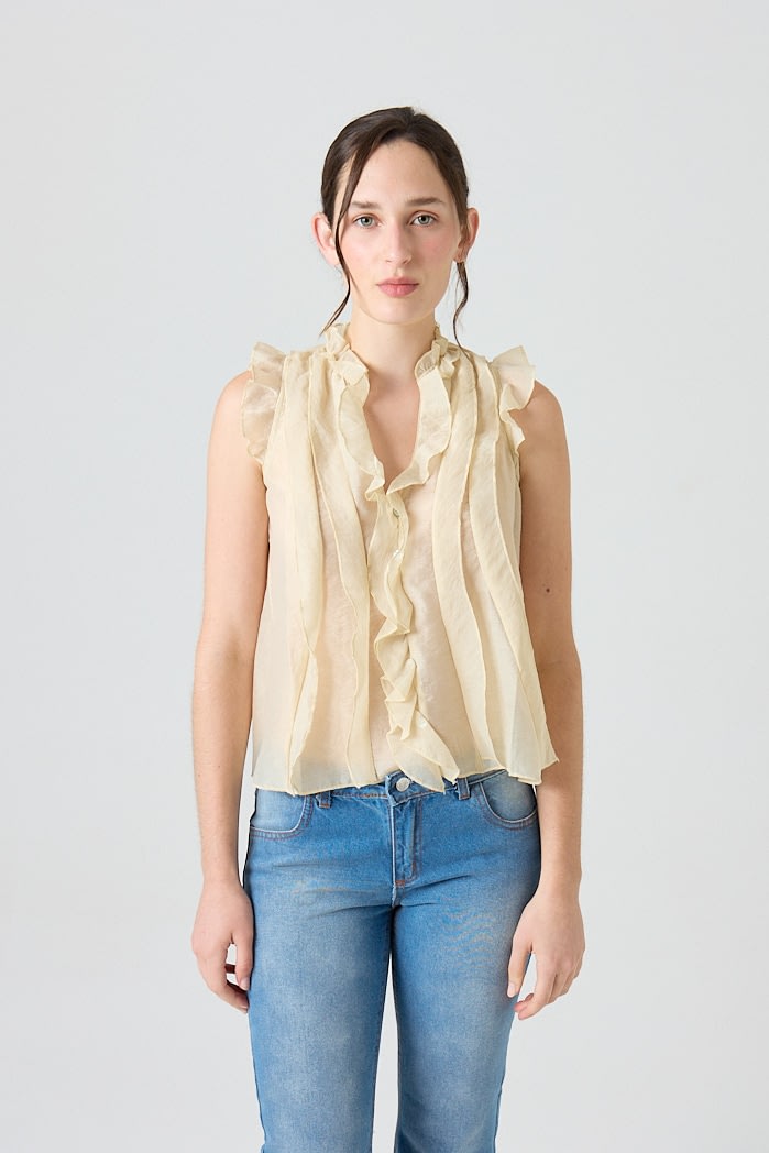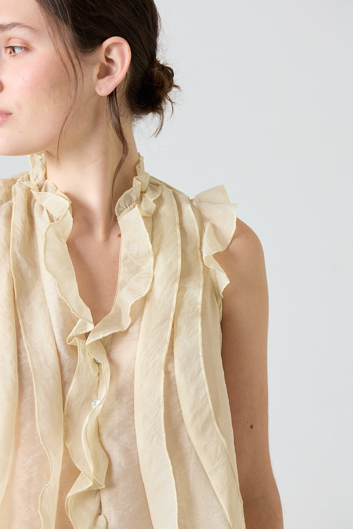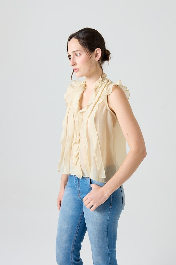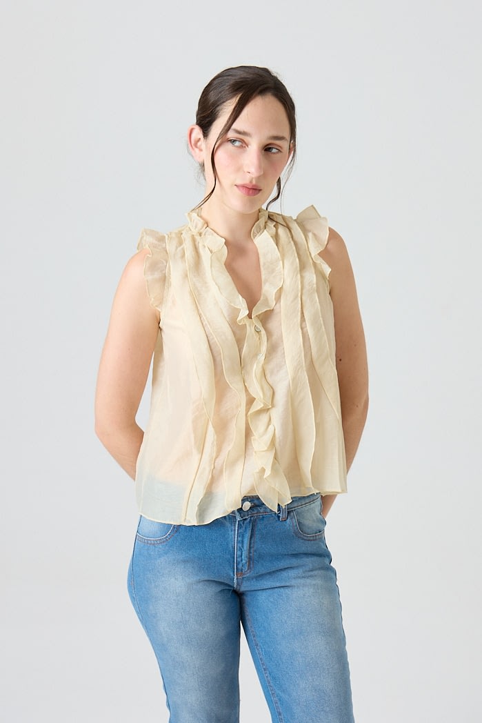 Blusa sin mangas confeccionada en tela liviana y translúcida. Presenta volados verticales al frente y en los hombros, con cuello redondeado y cierre con botones. Composición: 80% Tencel 20% Nylon