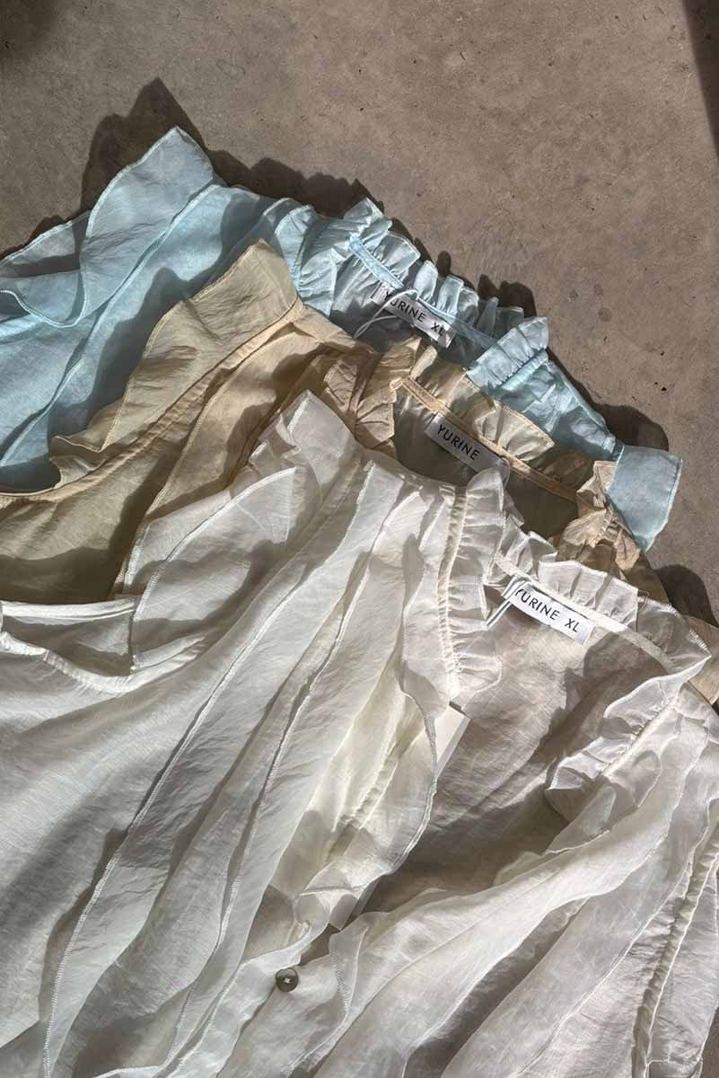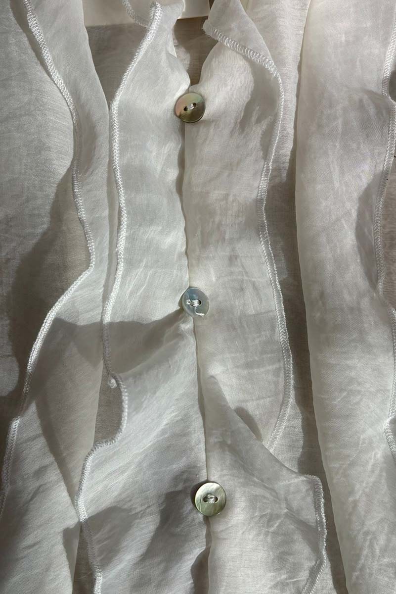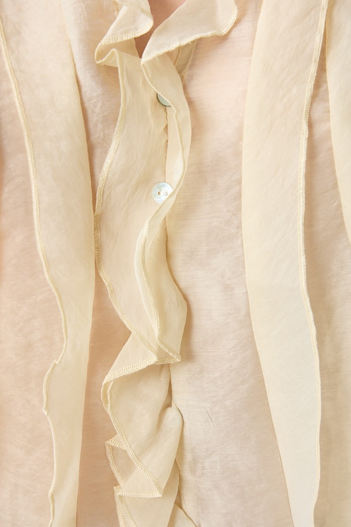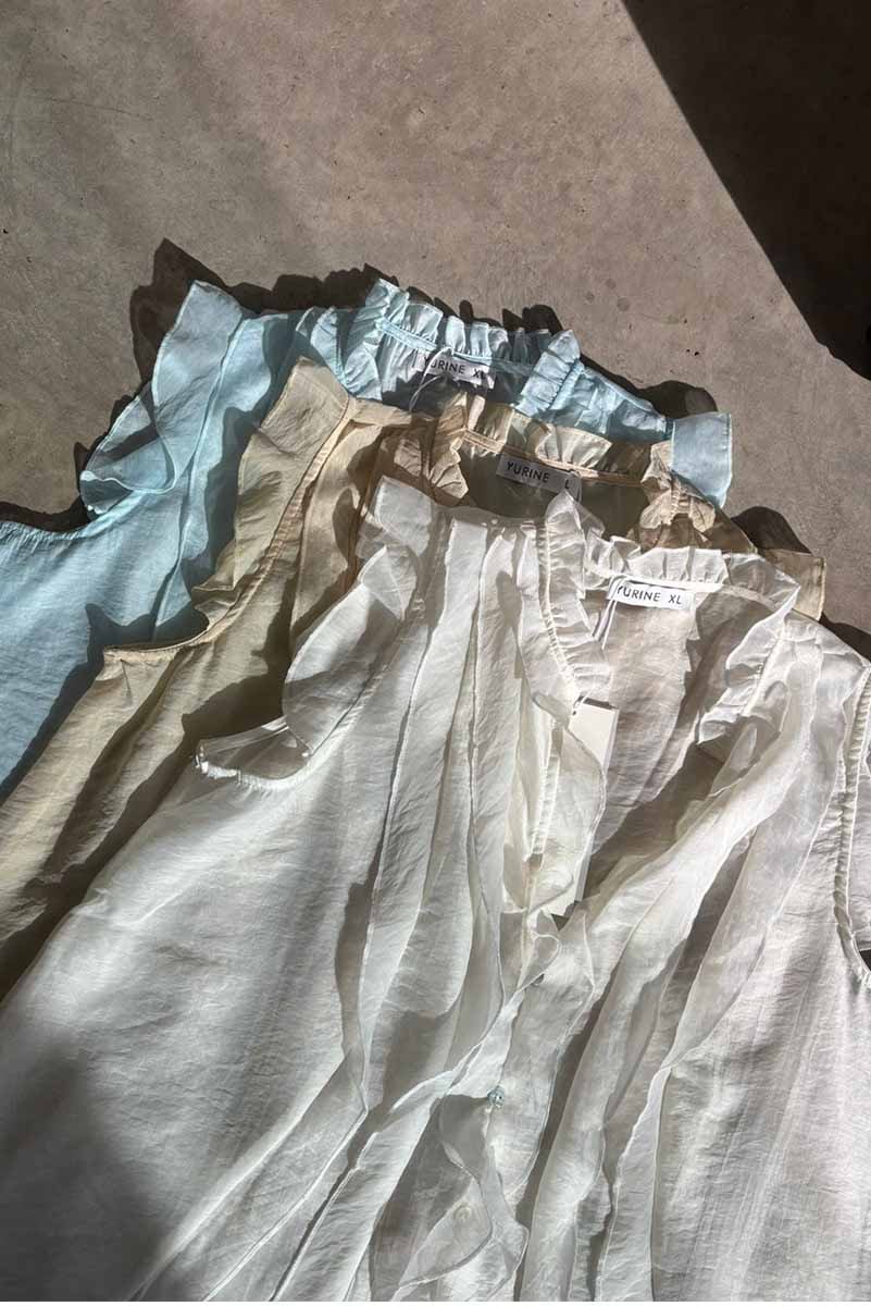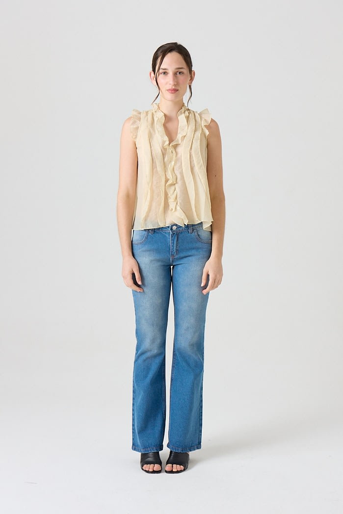 Blusa sin mangas confeccionada en tela liviana y translúcida. Presenta volados verticales al frente y en los hombros, con cuello redondeado y cierre con botones. Composición: 80% Tencel 20% Nylon