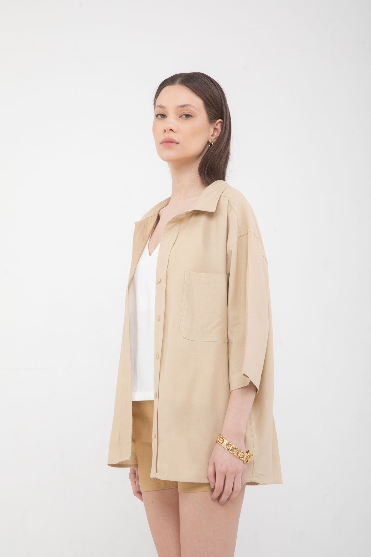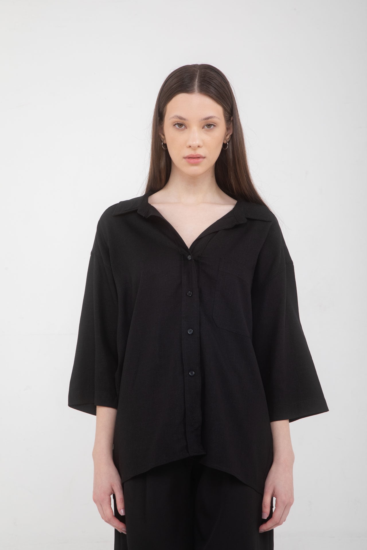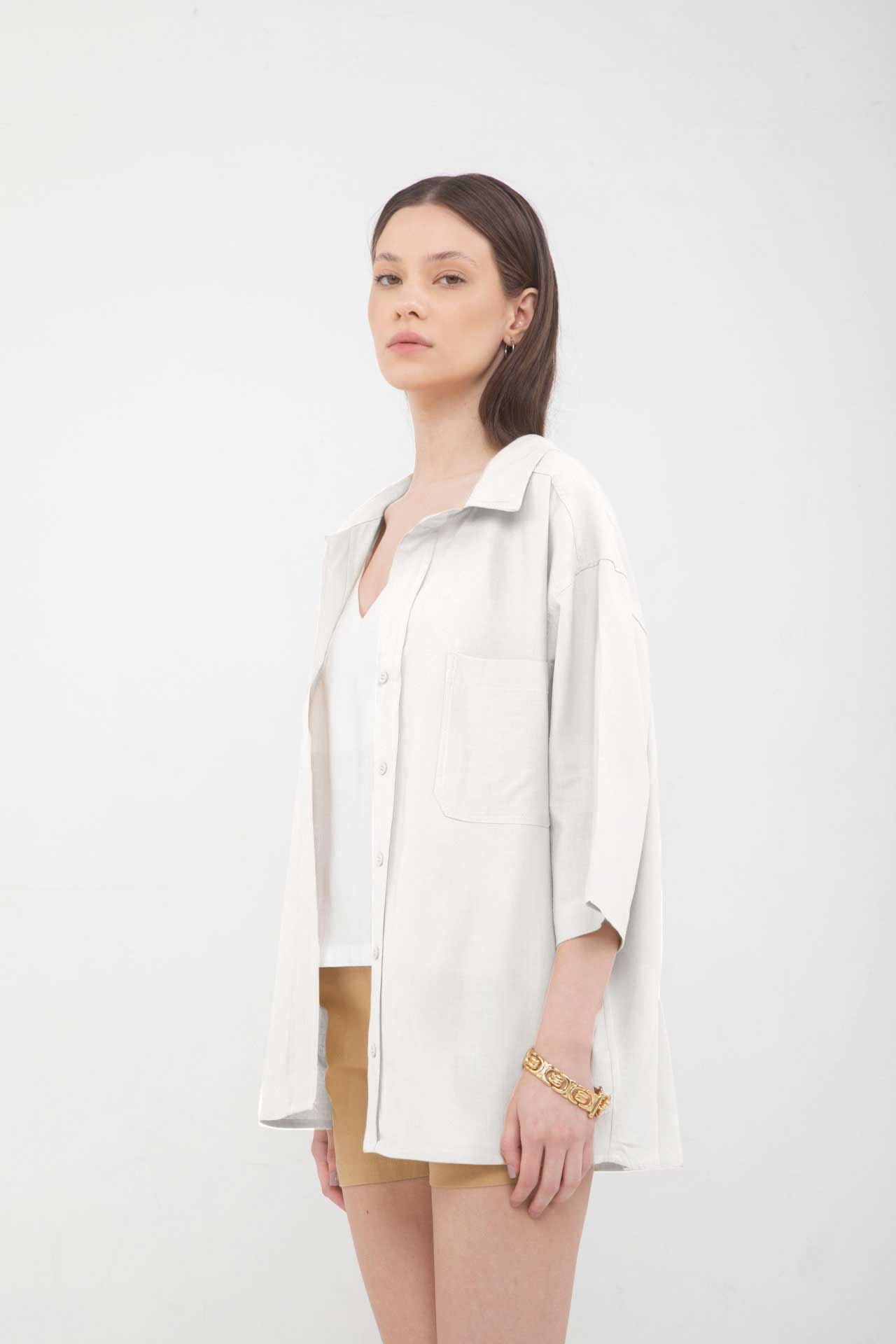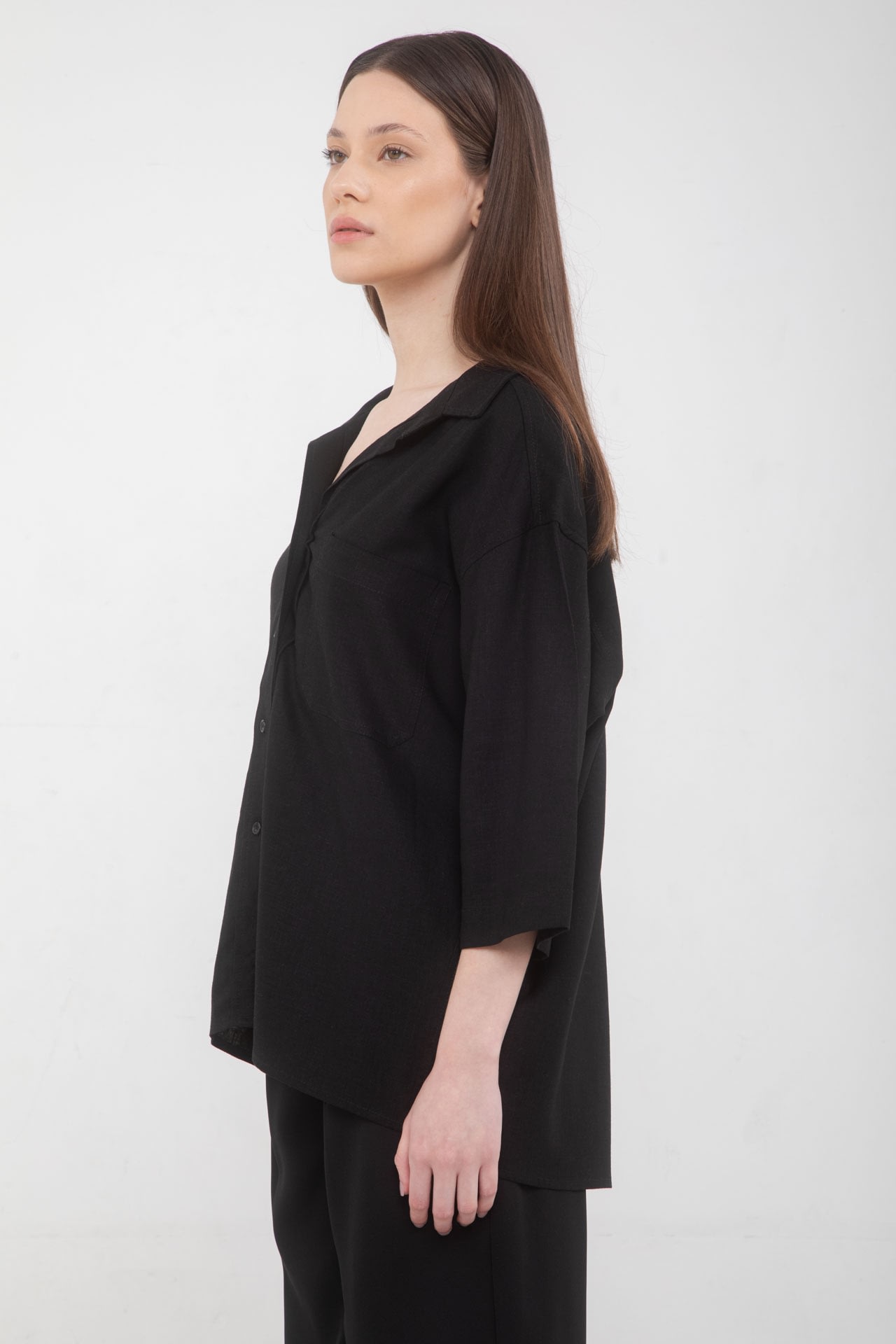 Camisa de lino con manga 3/4, botones al tono y bolsillo delantero.