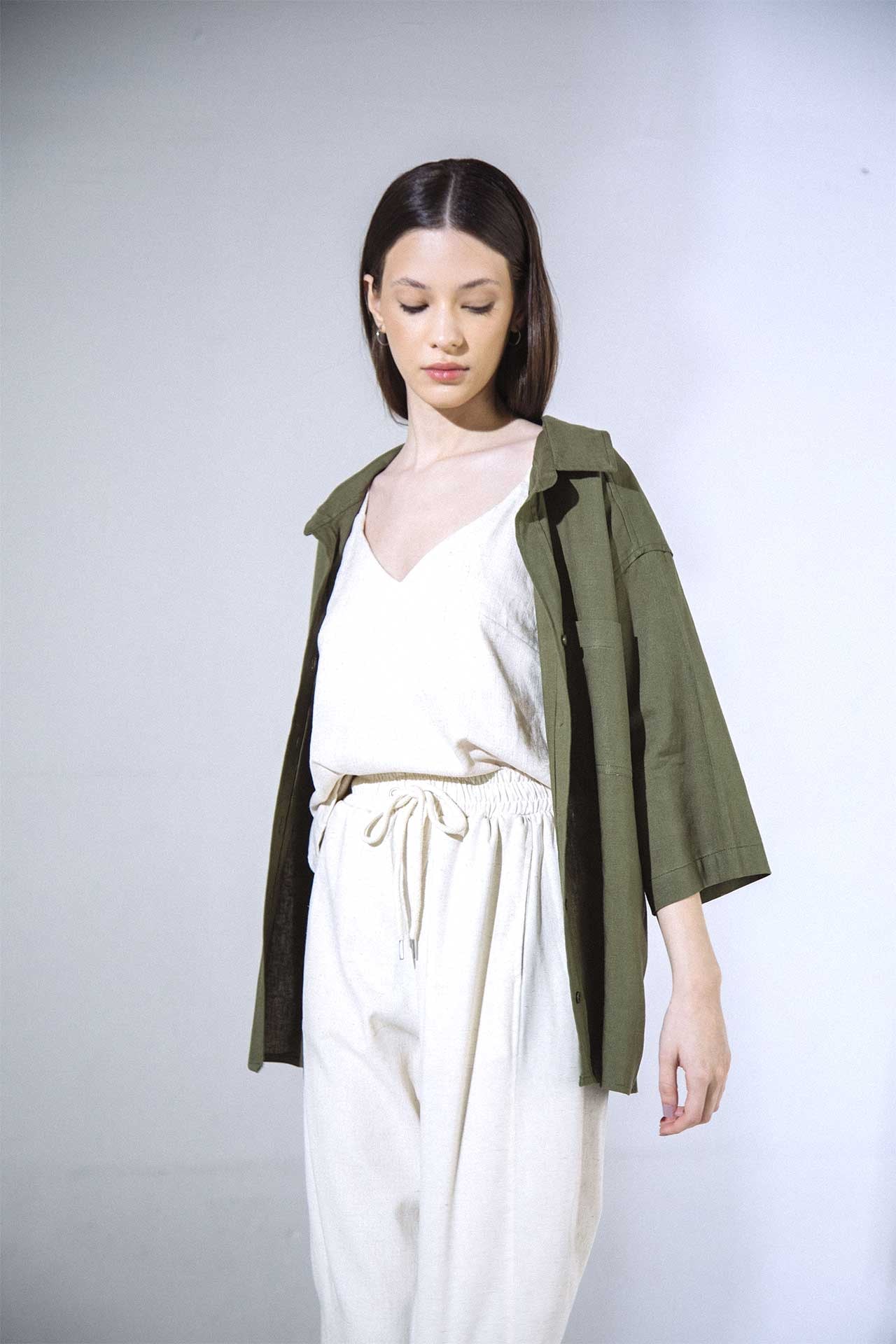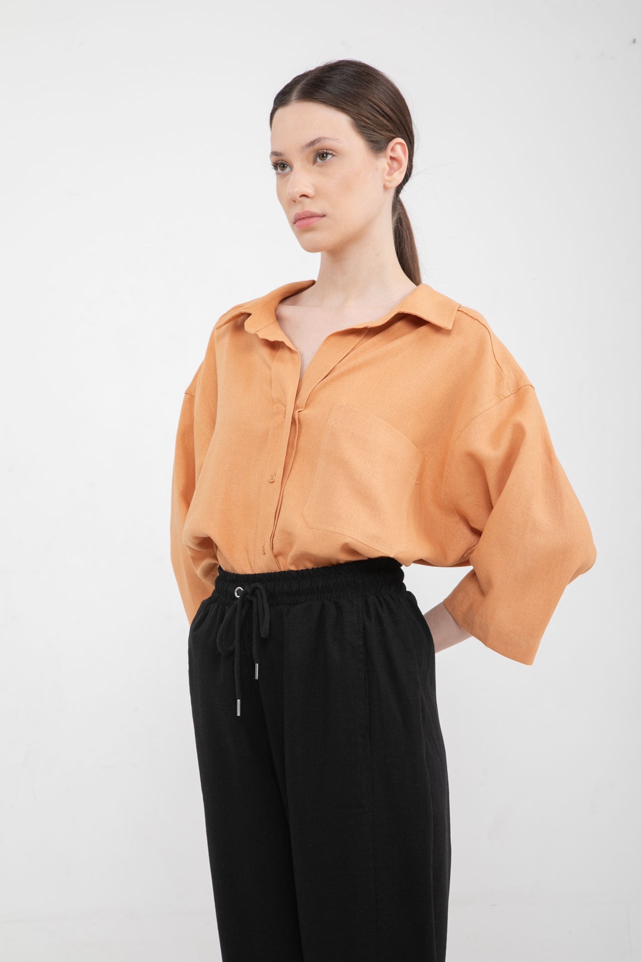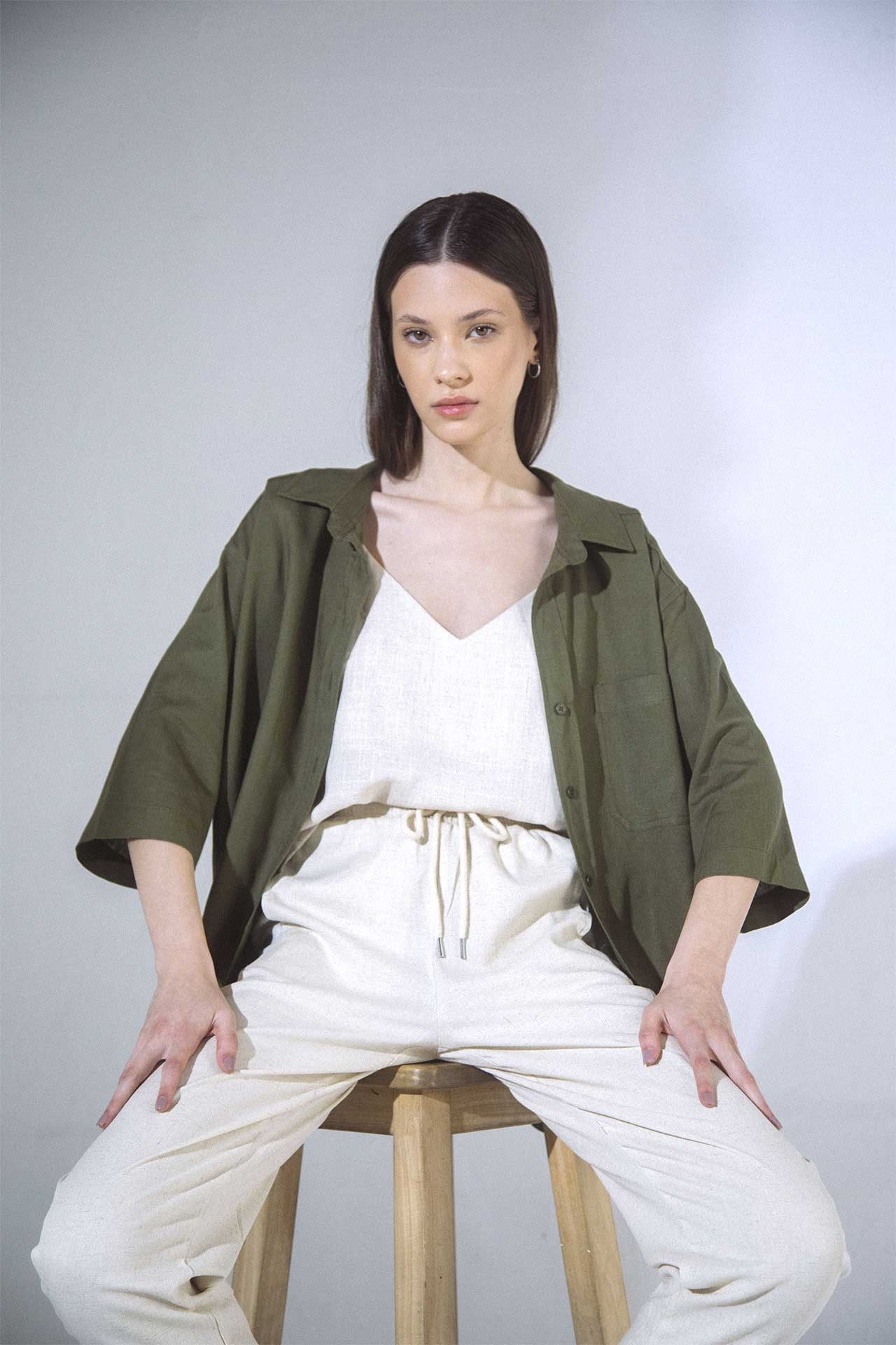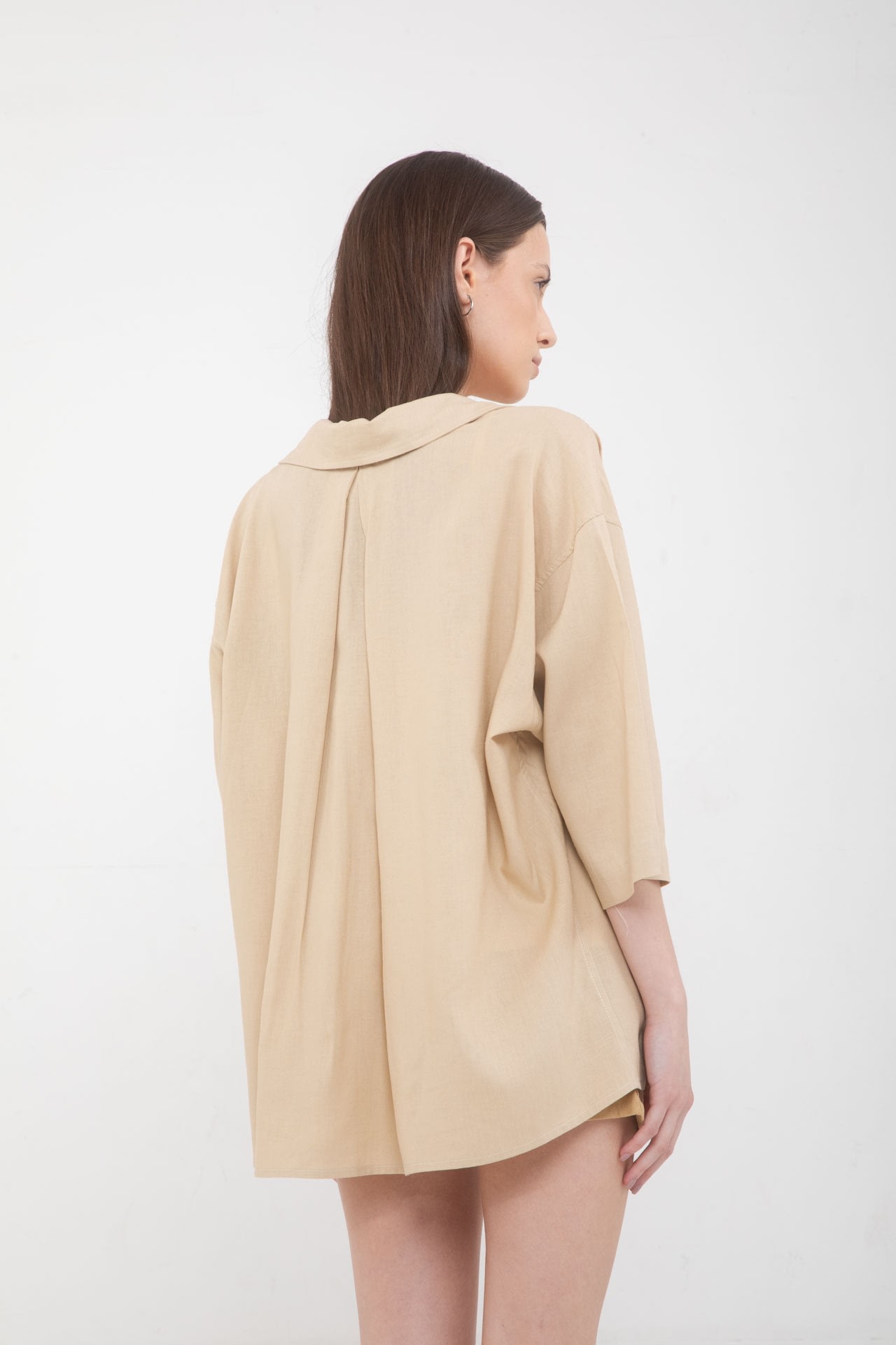 Camisa de lino con manga 3/4, botones al tono y bolsillo delantero.