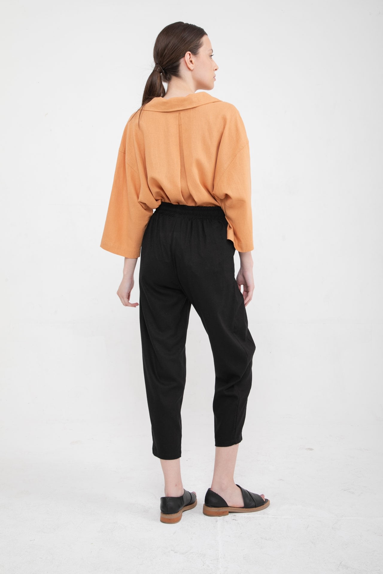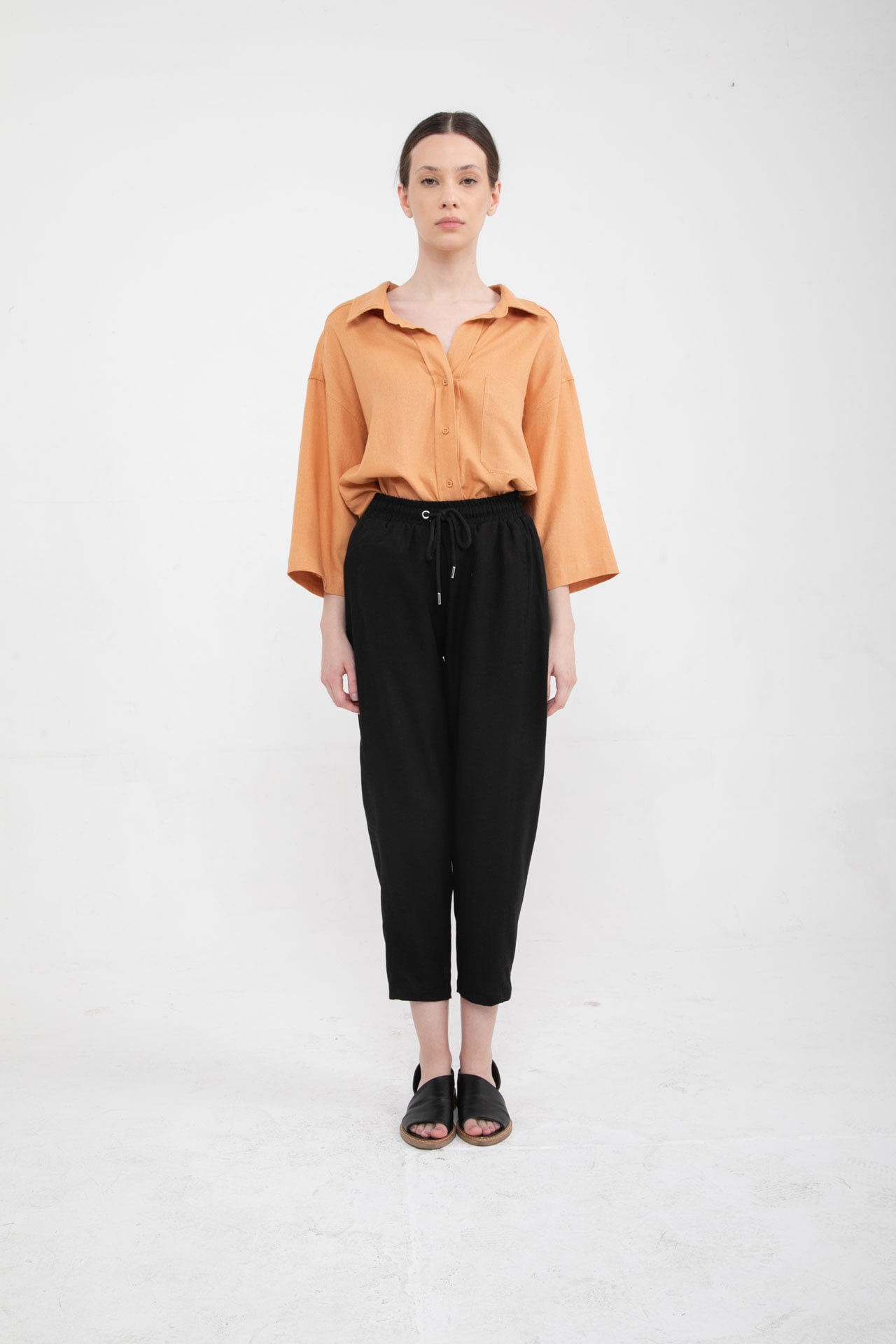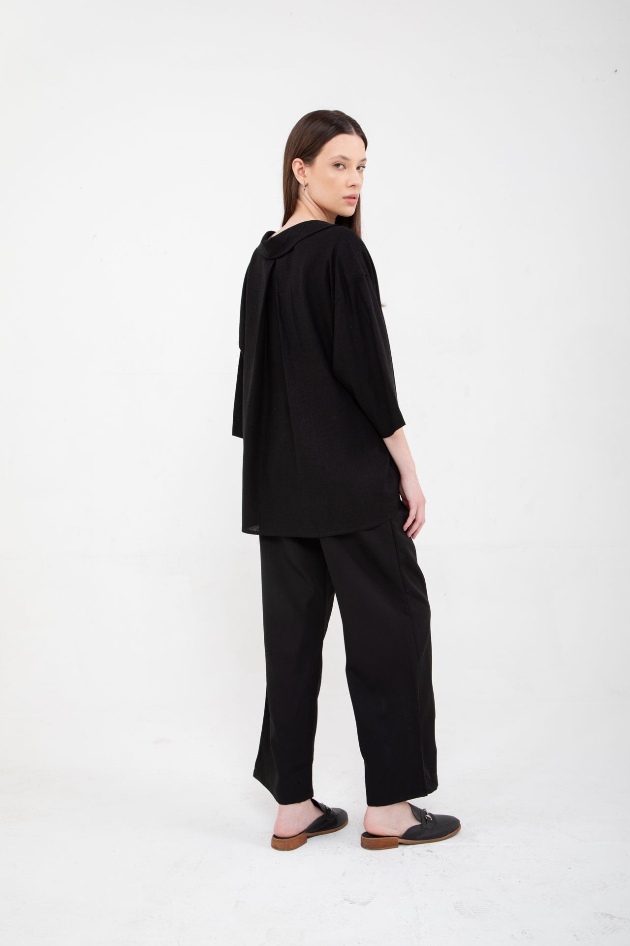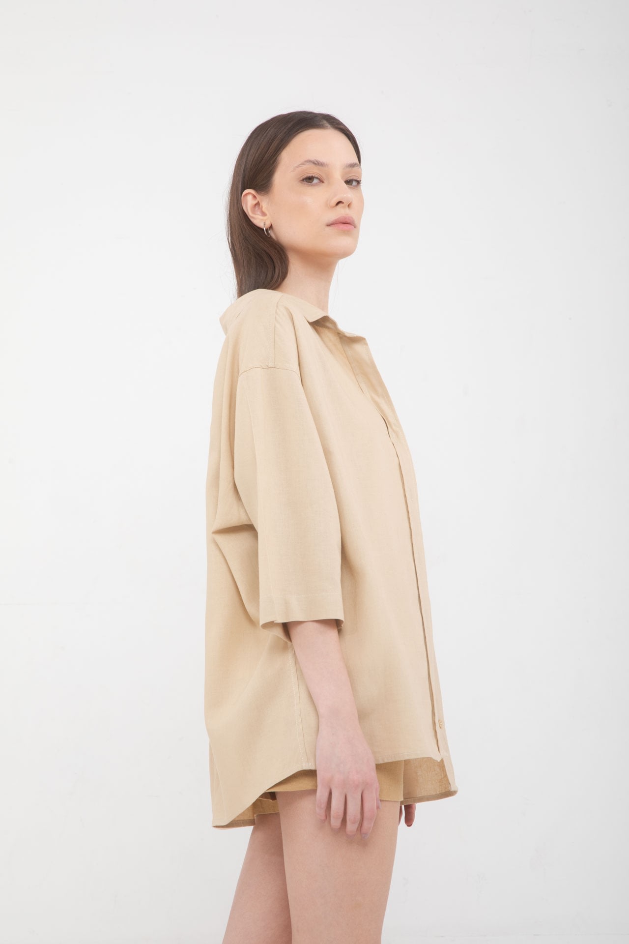 Camisa de lino con manga 3/4, botones al tono y bolsillo delantero.