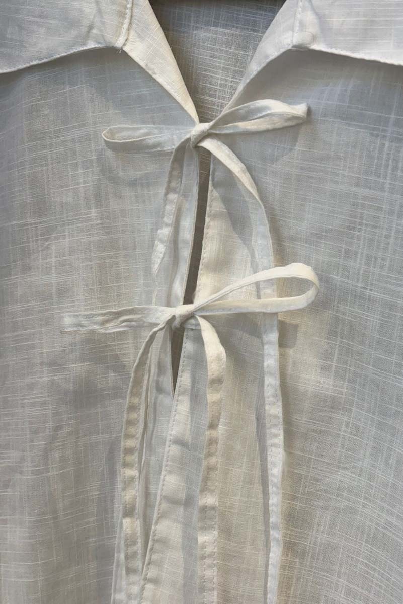 Camisa con lazo delantero y en puños. Diseño suelto y femenino con cuello amplio y textura natural. 100% COTTON