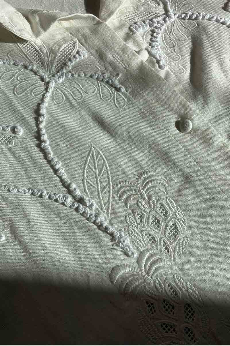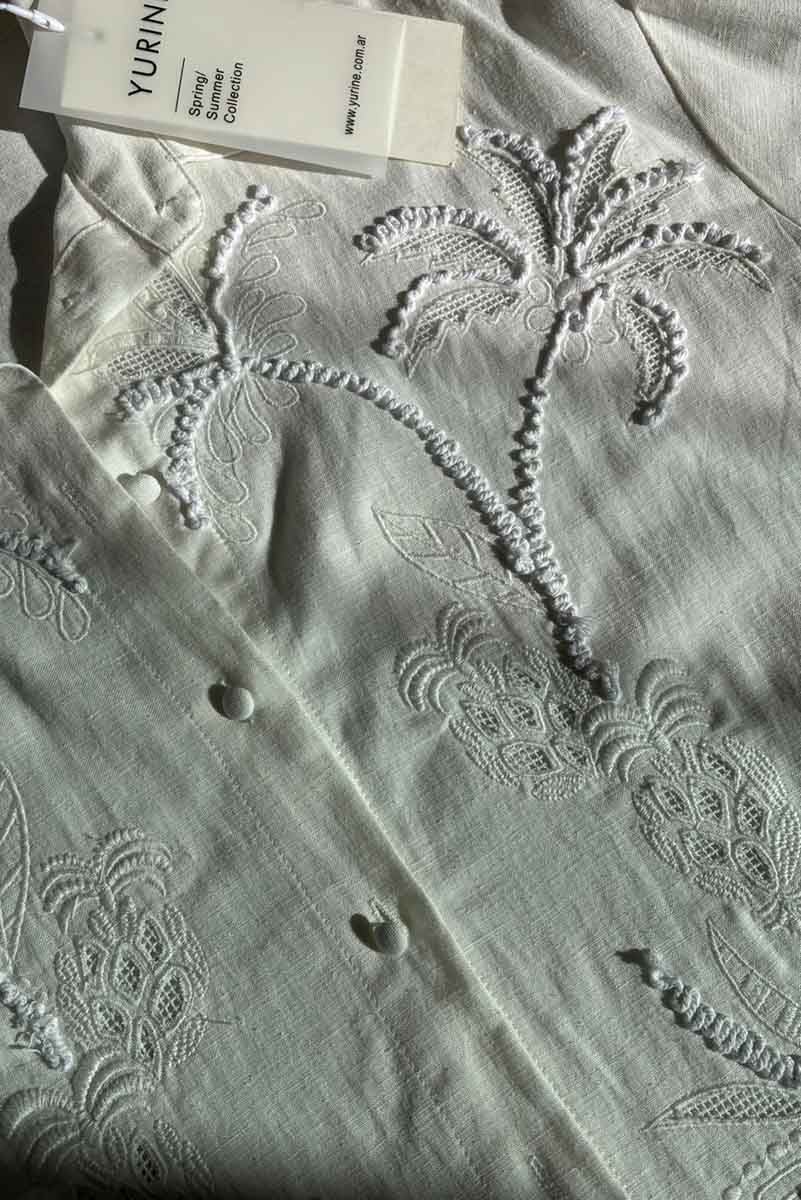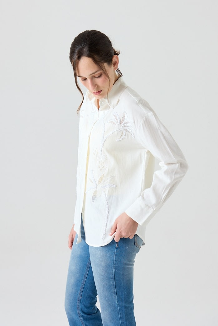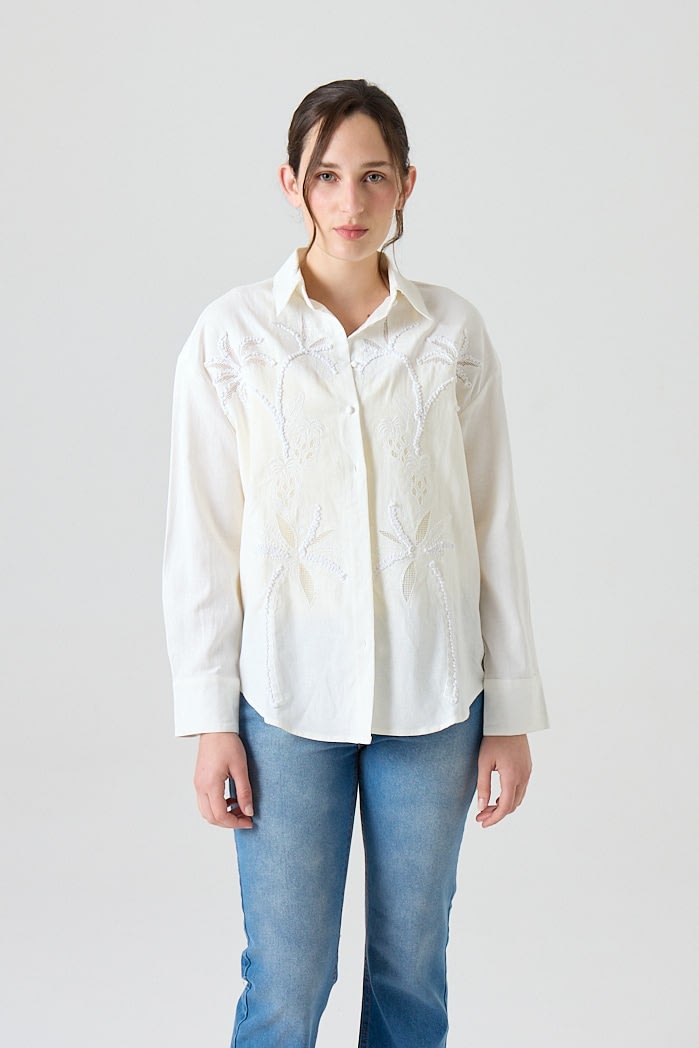 Camisa de manga larga confeccionada en algodón liviano (75% Algodón 25% Lino). Presenta bordado frontal con diseño de hojas y flores en relieve, cuello clásico y cierre con botones forrados. De corte recto y calce relajado.