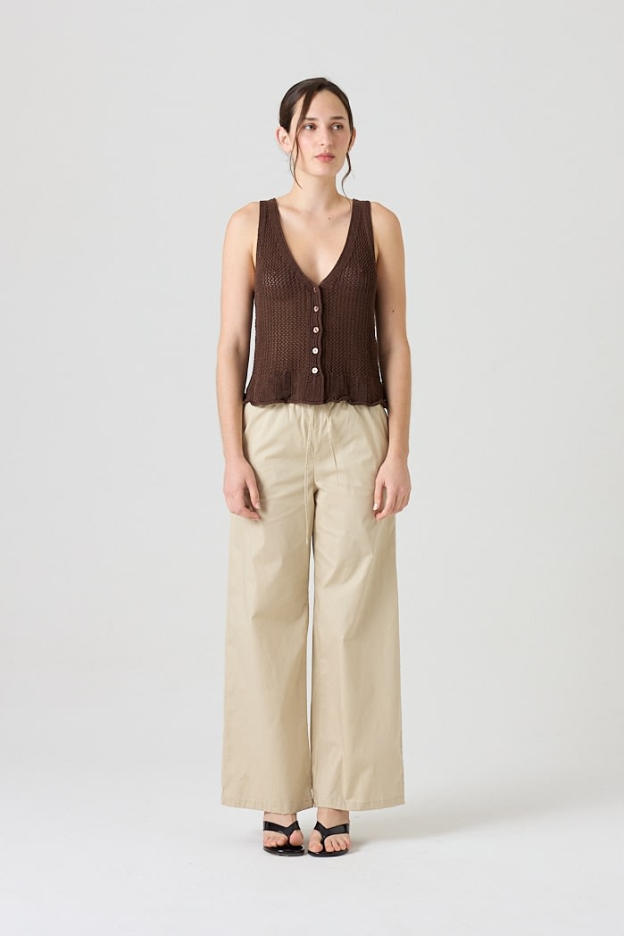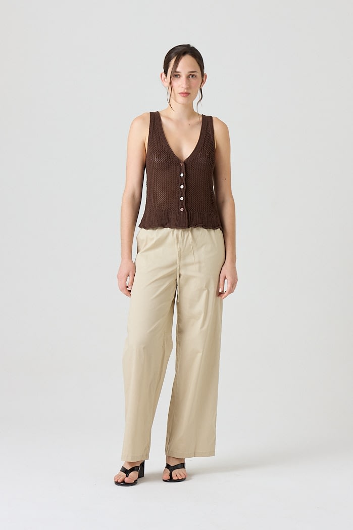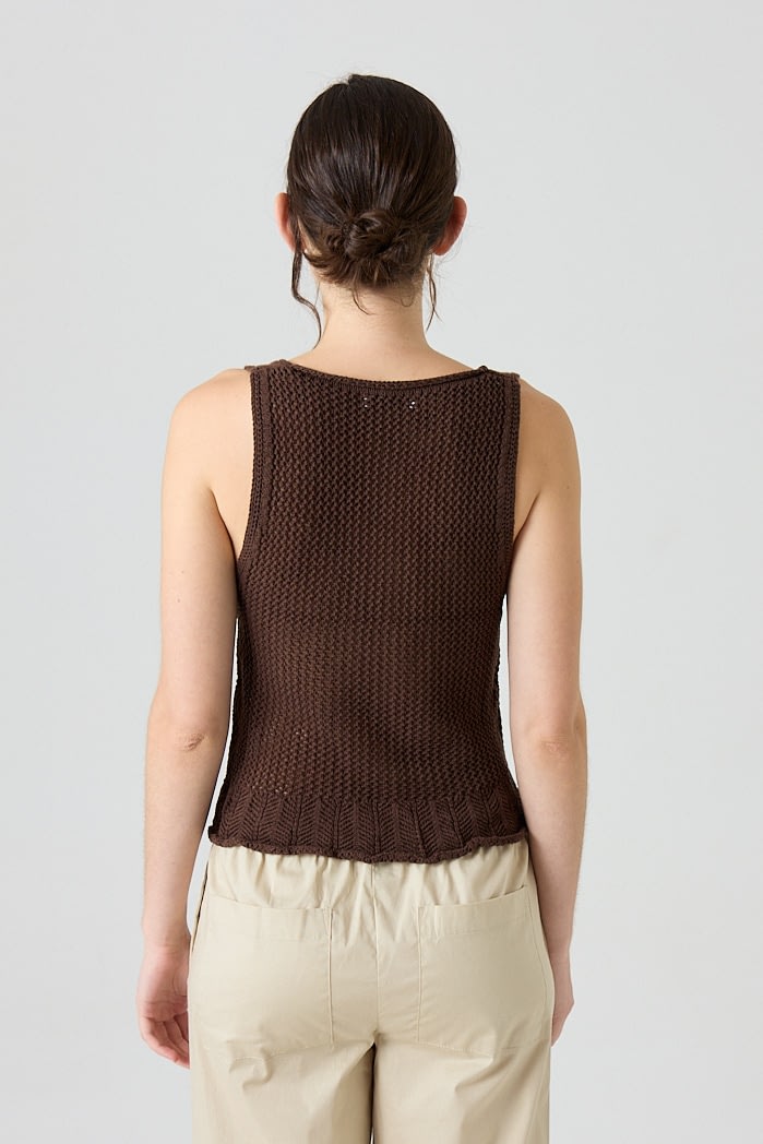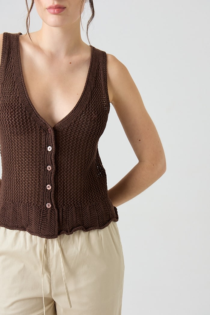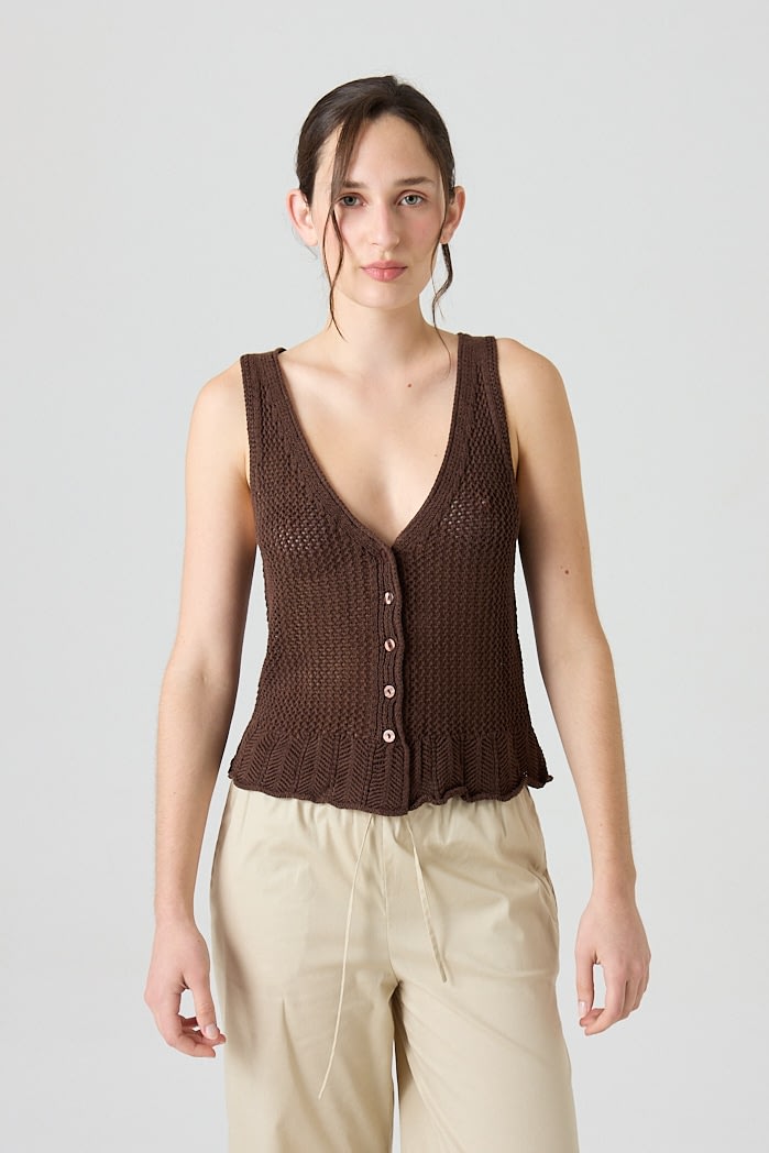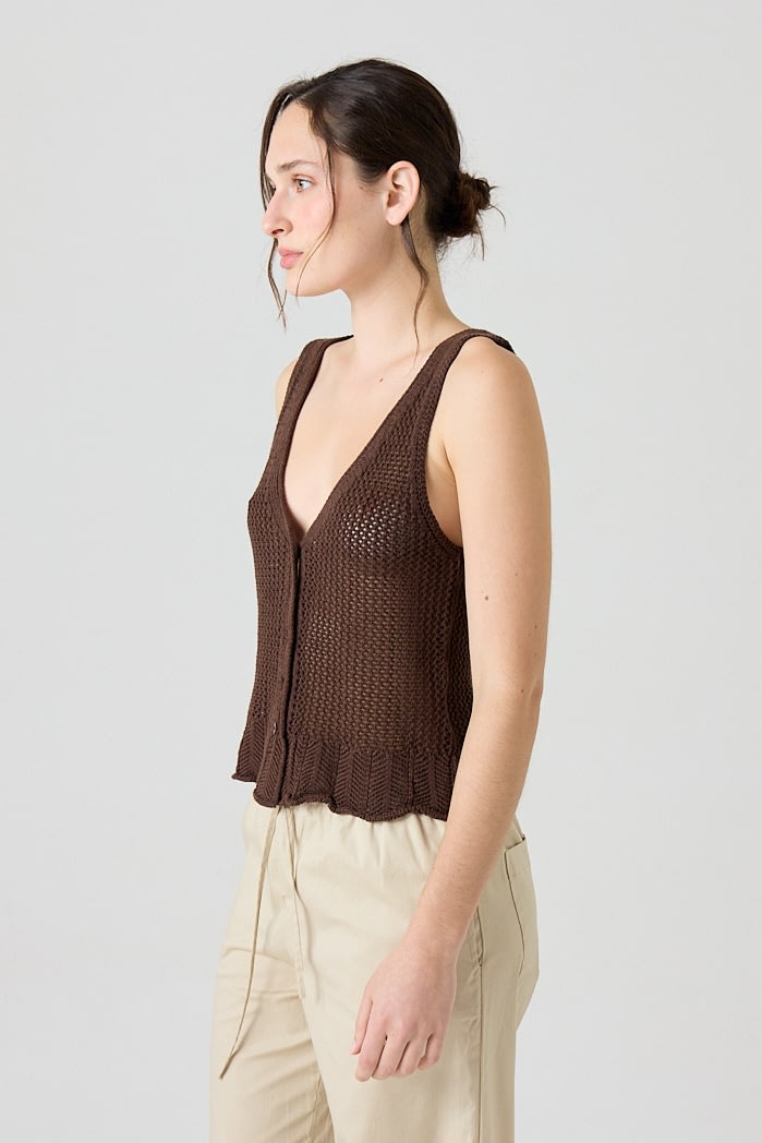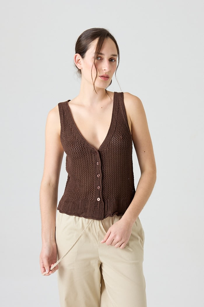 Chaleco tejido sin mangas con escote en V y botones al frente. Confeccionado en punto calado con textura y terminación ondulada en el ruedo. Composicion: 65% Poliéster 35% Cotton