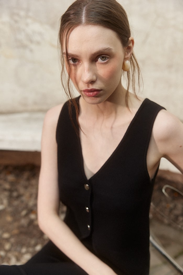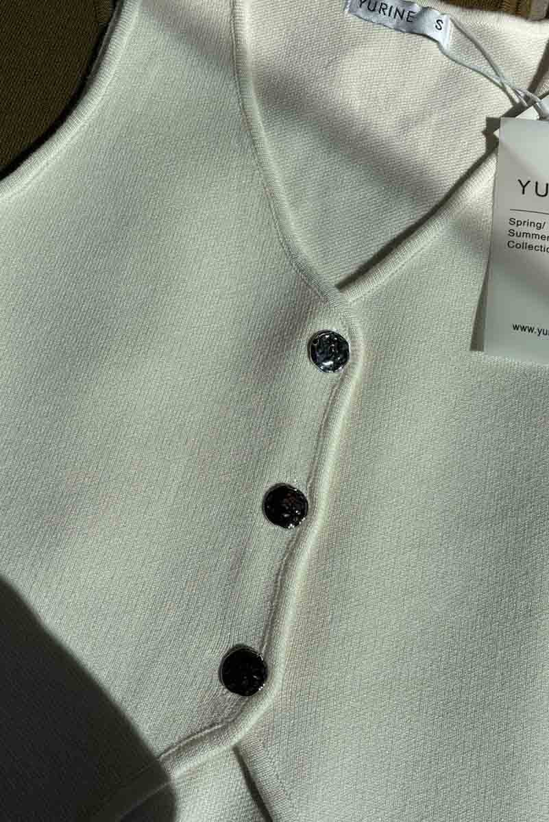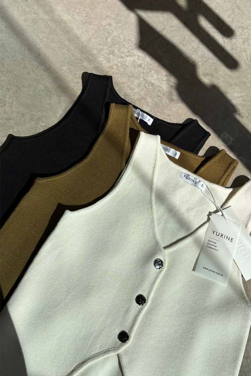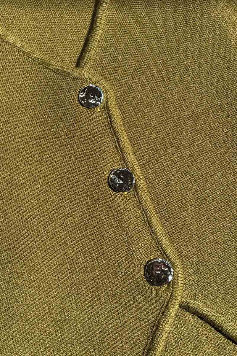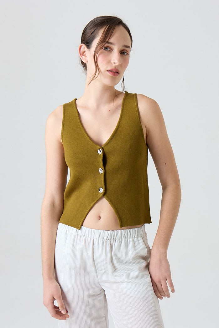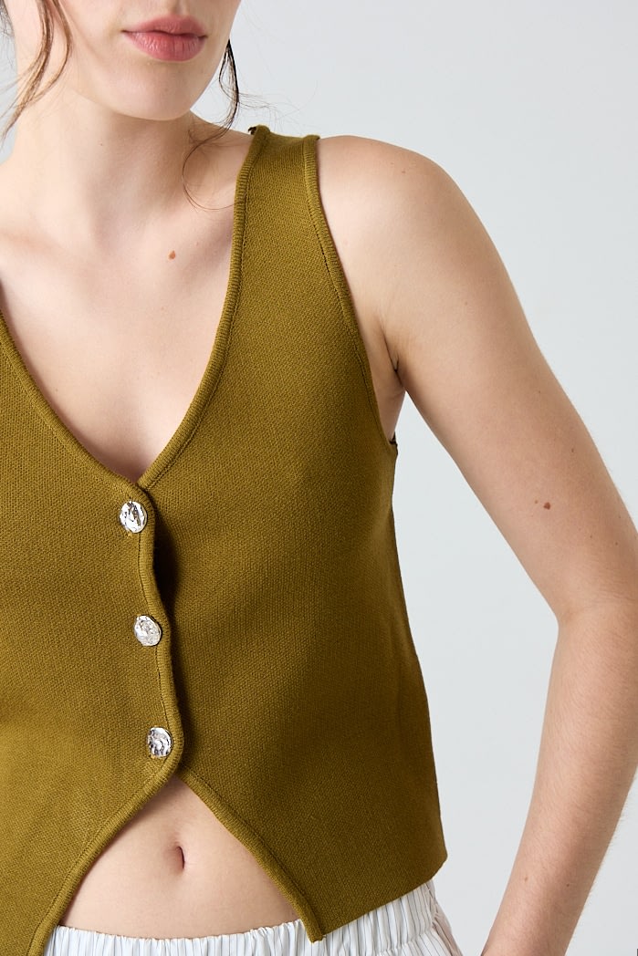 Chaleco tejido con escote en V y botones metálicos decorativos al frente. Diseño corto y moderno. Composición: 72% Viscosa 28% Poliéster